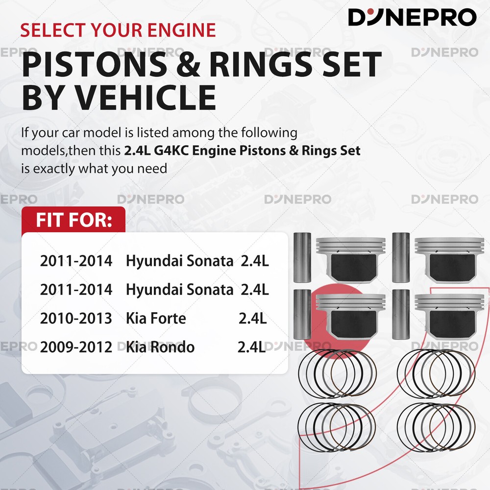 Engines Parts Deals Installation Guide search Services Find us WHERE TO BUY UNITED STATES | ENGLISH WHERE TO BUY Category Other Engine Rebuild Kit ENGINE GASKETS ENGINE COOLING PISTON AND RING KITS VALVE TRAIN COMPONENTS BEARINGS & THRUST WASHERS LIFTERS CYLINDER HEADS CONNECTING RODS TIMING CHAIN KIT CRANKSHAFT FUEL INJECTION NOZZLE POWER HATCH LIFT SUPPORT HEATER CORE Full Piston Pin Snap Ring Fit 06-09 Hyundai Sonata Kia Optima Rondo 2.4 G4KC Dynepro® Pro Series Master Engine Rebuild Kit For Hyundai OEM Spec Certified Engine Repair Kit Precision Engineered · Factory Reliability ⭕Aluminum Piston Set Hypereutectic Al-Si18 Alloy : Low thermal expansion, 20% lighter than cast iron. Molybdenum-coated skirts : Reduces cylinder wear by 35% in stop-and-go city driving. Integrated cooling channels : Optimized for turbocharged Gamma/Theta II engines,lifespan by 2x. ⭕ Built For Hyundai Owners: ✔️ Oil sludge cleanup (Theta II/Lambda engine rebuilds) ✔️ Timing chain rattle fixes (Nu/Gamma engines, includes tensioner tool) ✔️ Turbo failure prevention (1.6T/2.0T models, full gasket/seal refresh) ✔️ 200,000km+ overhauls (full bolt kit with factory torque specs) ⭕ For Hyundai TechTrust : ✔️ Restore factory power. Drive with Korean precision. ✔️Order Now – Free OEM Repair Manual Included! Support: Email us (Master Techs on call) ⭕ Why Genuine? ⚠️ Cheap parts fail: Non-genuine pistons crack under GDI’s 150-bar fuel pressure. Knockoff chains stretch, causing valve-piston interference. ✅ for Hyundai spec Certified : 100% material compliance with Hyundai MS-350 durability standards. Direct from OEM Plant spec suppliers. 2-year unlimited-mileage warranty. Vehicle Application Compatible with: G4KC 2.0L engines. for Hyundai Sonata 2011-2014 2.4L FULL HYBRID EV-GAS (FHEV) Naturally Aspirated for Hyundai Sonata 2011-2014 2.4L GAS Naturally Aspirated for Kia Forte 2010-2013 2.4L GAS Naturally Aspirated for Kia Rondo 2009-2012 2.4L GAS Naturally Aspirated Note: VIN confirmation required. What's included in this complete bundle set -Pistons -Piston Rings Shop Now >> Instant Fitment Email your Hyundai model (e.g., Elantra, Tucson, Santa Fe) and year → Get a repair kit tailored to your VIN. Restore factory power, drive like new. Tech Support: Email us (Provide VIN for tailored parts list) About us FQA Shipping After-Sales Support Contact us DynePro® is a U.S.-based engine repair brand committed to making engine maintenance accessible and efficient. We specialize in high-quality repair kits, supported by leading manufacturers and a skilled team with expertise in automotive data and customer support. Our focus on quality, ease of installation, and expert after-sales service empowers our customers to handle engine repairs with confidence and precision. Choose DynePro for professional-grade solutions that deliver reliability and peace of mind. 1. What products does DynePro offer? DynePro specializes in high-quality engine repair kits and aftermarket parts. Our product range includes essential engine components like connecting rods, valves, camshafts, cylinder heads, engine blocks, pistons, and more. We offer comprehensive engine rebuild kits, performance-enhancing parts, and specialized tools designed to make engine maintenance and repairs easier. 2. Are your engine parts new? Yes. Our parts are guaranteed to be brand new, zero-mile, unused, and crate engine parts. While some parts may occasionally be rebuilt, we ensure all parts meet the highest standards and are in new condition for your engine repairs. 3. How to Find Your Part? To ensure compatibility, simply send us your Vehicle Identification Number (VIN), and our team will reply with the corresponding parts link for your vehicle. You can also find parts by vehicle model through our website’s compatibility feature. 4. Are your products compatible with my vehicle? Our products are designed to fit a wide range of vehicle models, including American, Japanese, Korean and German cars brands. For compatibility, check the product description on our website or contact us with your vehicle's details, and we will guide you to the right parts. 5. Do you offer international shipping? Yes, we offer international shipping to most countries. If you'relocated in a region not supported by our standard shipping options, please contact us directly for a custom shipping quote. 6. What should I do if I receive a damaged or incorrect item? If you receive an item that is damaged or incorrect, please contact us immediately. We will assist you with a return and provide either a full refund or a replacement. For faster processing, please keep all packaging and send us clear photos of the damaged product. 7. Do you provide installation guides and torque specifications? Yes, we provide installation guides for all our products. These guides include step-by-step instructions, as well as the necessary torque data to ensure proper installation. Simply refer to the product page for the downloadable instructions or contact us for assistance. 8. Still have questions? If you have any additional questions, feel free to contact us anytime. Our dedicated team is here to assist you with all your needs! Orders from Chinese Warehouse Once payment is confirmed, we’ll ship from our China warehouse based on the handling time for in-stock items, which generally takes 2-10 business days. Shipments are sent via DHL or UPS, with an estimated delivery time of 3-7 business days. Orders from U.S. Warehouse Orders from our U.S. warehouse will be shipped within one business day after payment is received. If an order is placed before 10:00 AM PST on a business day, it will usually ship the same day. All U.S. shipments are sent via UPS or FedEx with a tracking number, and delivery is typically within 3-7 business days. Important Details The listed shipping fees apply only to the 48 contiguous U.S. states. For customers in Guam, Puerto Rico, Northern Mariana Islands, the