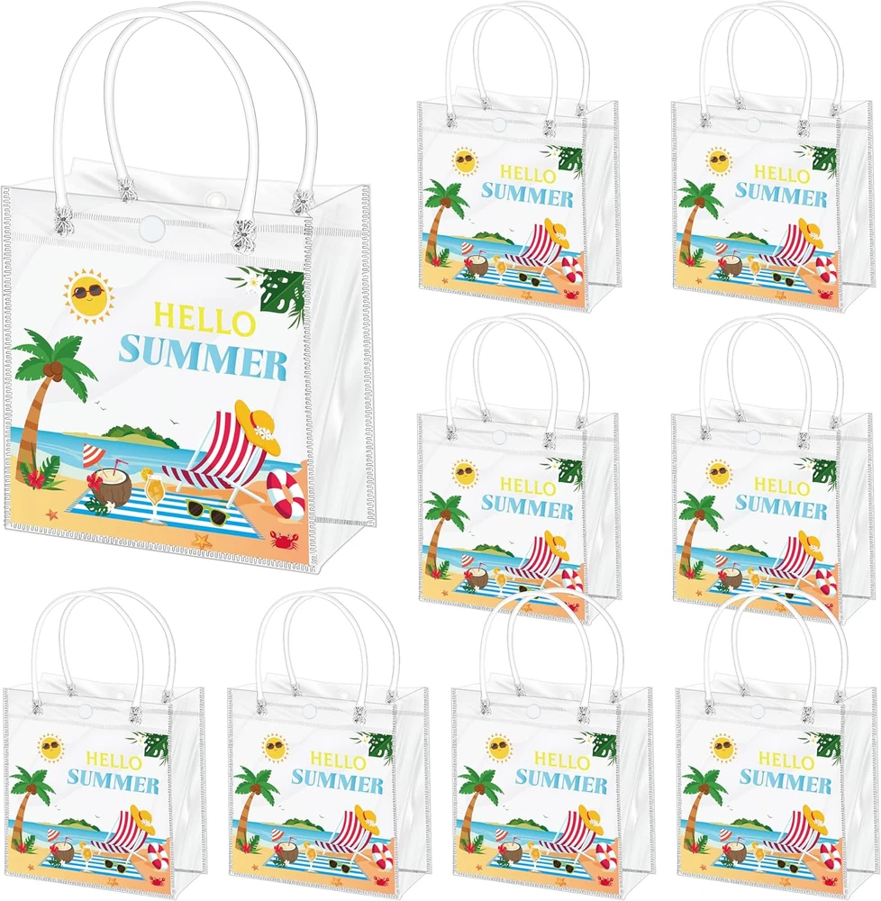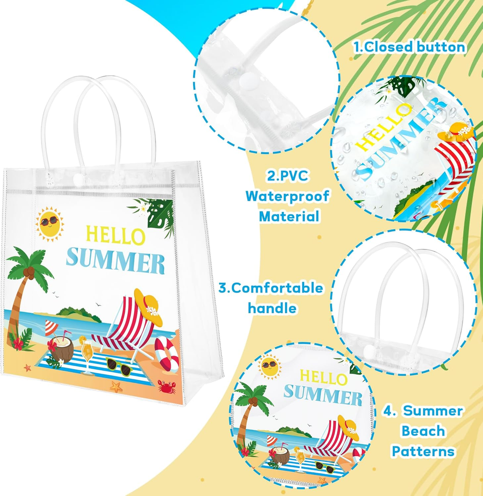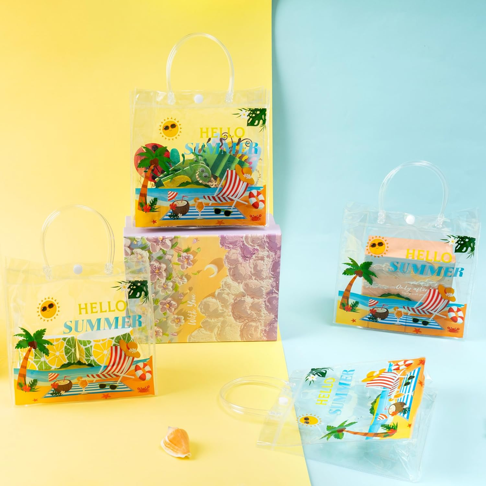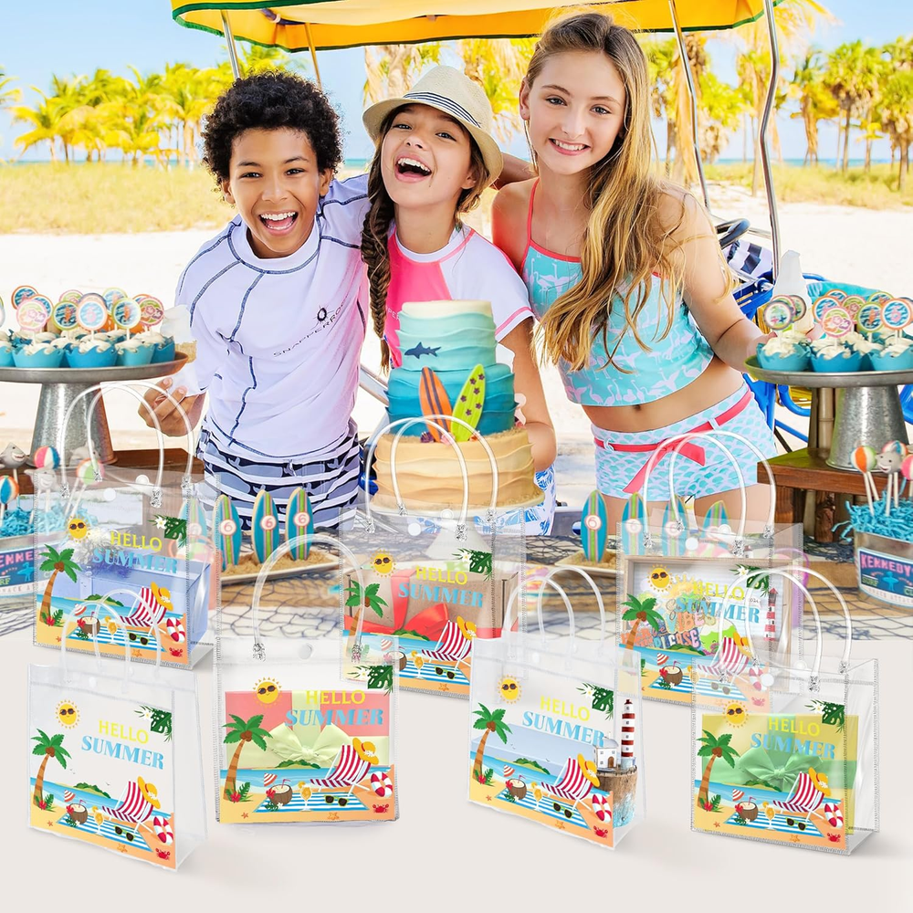 1. These summer gift bags are perfect for parties! The clear PVC is sturdy and waterproof, and the colorful beach prints add a fun touch. Love that they come with handles—makes them easy to carry. Great size for small gifts, treats, or party favors. The pack of 24 is a lifesaver for big events. So reusable and cute, definitely worth it for any summer celebration!