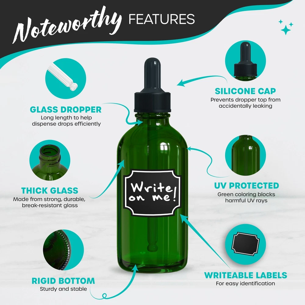 Benefit from Versatile Small Glass Bottle with Dropper : Put your liquids in this glass dropper bottle 4 oz capacity & keep them safe. These green mini dropper bottles for travel can serve as oil bottles for hair , glass tincture bottles with dropper , eye dropper bottles , & more. Stylish & practical, this 4 oz dropper bottles glass set is ideal for homemade blends & self-care needs. With secure seals, our serum bottles with dropper are great for daily eye, face & body care, wherever you go. Keep Contents Fresh with our Green Apothecary Bottles : Safeguard your liquids with our 118ml dropper bottles . Made from thick colored glass, our dropper bottle 4oz design features sturdy twist tops & corrosion-resistant silicone caps. These droplet bottles defend against evaporation & chemical breakdown from UV rays, so this handy mini oil dropper bottle 4oz set will maintain the quality of your blends. Have fresh homemade mixes with our protective small dark glass bottles with droppers ! Complete Kit for 4oz Dropper Bottles : Our comprehensive glass eye dropper bottle 4oz set is perfect your DIY creations. This kit includes everything you need: 24-4 oz glass dropper bottles for accurate dispensing, a funnel for effortless filling, a 5.5" brush for easy cleaning, 1 white marker, 24 label stickers (1.5"x1.25"), & 30 shrink wrap pieces (3"x5.12") to seal and gift. Stylish & multipurpose, this glass bottle dropper set is ready for any project or gift-giving occasion. Easy Transport Empty Dropper Bottles : Benefit from convenience with our bottle with dropper for oil , perfect for individuals on the move or looking for practical liquid storage options. These mini glass dropper bottles are compact, portable & stylish whether used as an ear dropper bottle , sample dropper bottles , eye drop bottle , mini serum bottles for travel & more. Ideally sized green mini dropper bottles designed to hold up during both daily commutes & long trips. Customer Care: At , we prioritize our customers & stand by our 4oz glass dropper bottle design. We offer a 1-year warranty on these dark bottles with dropper for oils . Let us know if you have questions about our oil bottles with dropper . Experience the 4oz glass bottles with dropper as tincture bottles with dropper , an essential oil dropper bottle kit, eyedropper bottle glass containers, or glass medicine dropper set! Satisfaction with our liquid dropper bottle is our priority!