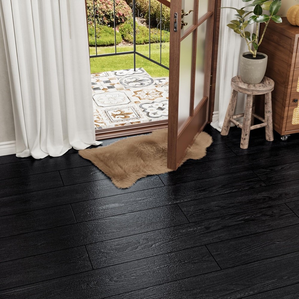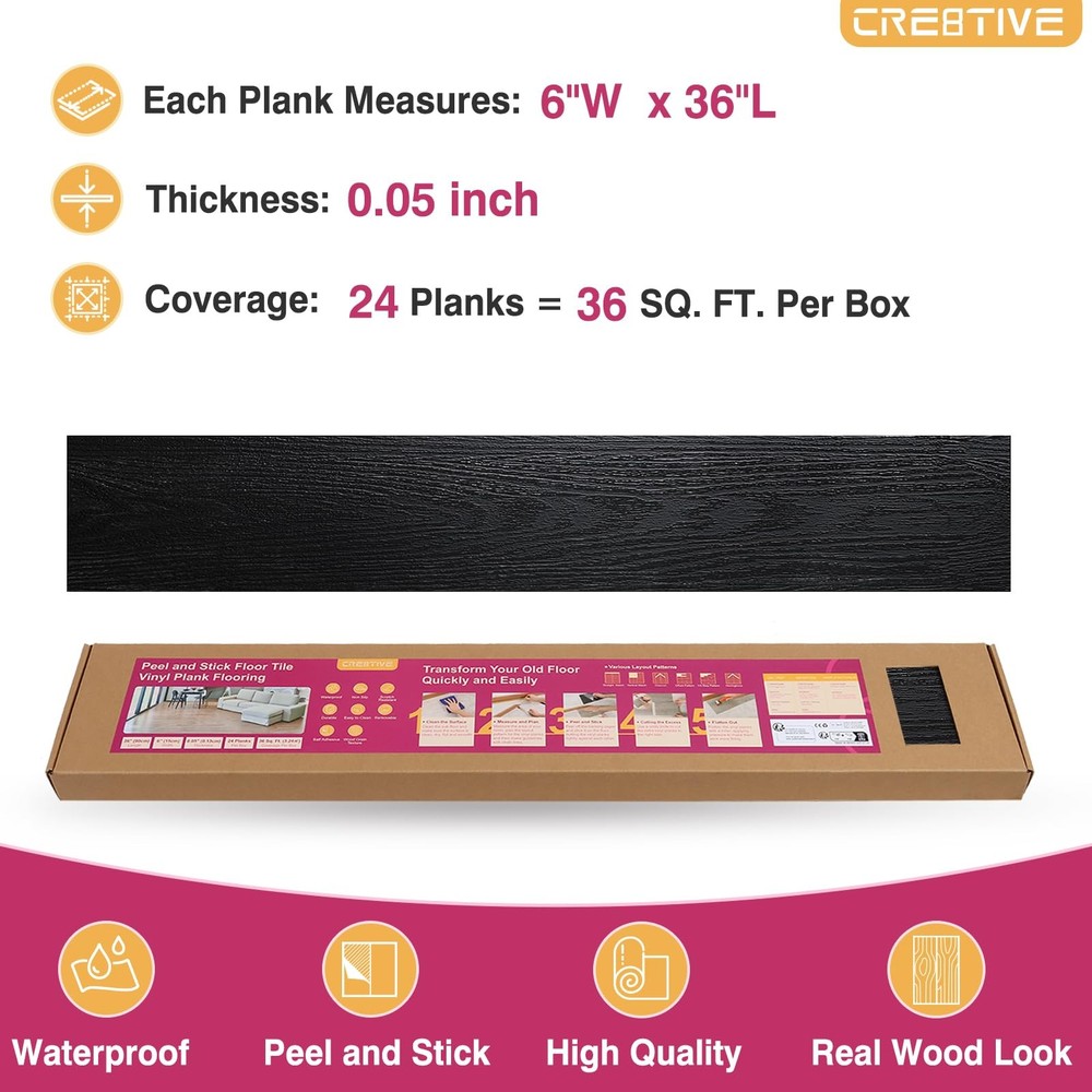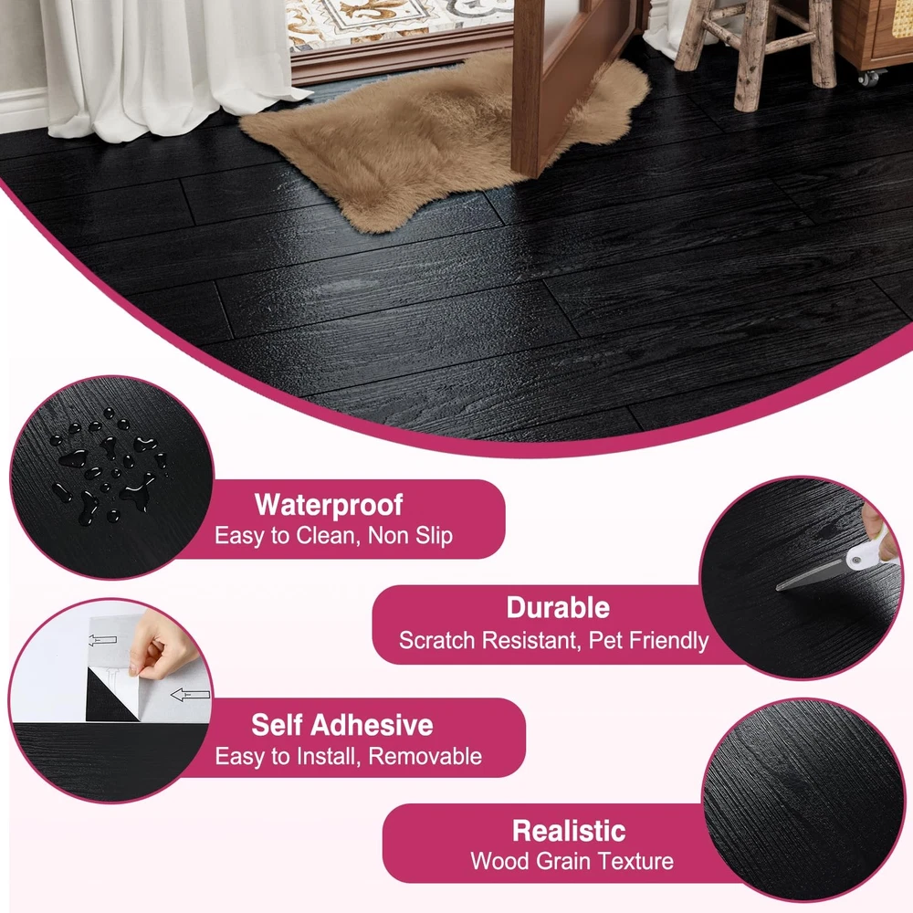 black peel and stick floor tile waterproof vinyl plank flooring self adhesive vinyl tiles temporary laminate peel and stick flooring DETAILS: Black vinyl plank flooring, each plank measures 6"W x 36"L, 1.3mm thick, 24 planks per box, covers 36 Sq. Ft. Realistic and natural wood look, low glossy, textured finish, ideal for those on a budget but looking for aesthetics FEATURES: Black peel and stick floor tile, waterproof, oil-proof, moisture-proof, easy to clean and maintain, durable, wear resistant, scratch-resistant, pet-friendly, long-lasting, suitable for high-traffic areas, or wet environments such as bathrooms and kitchens EASY TO INSTALL: Peel and stick vinyl floor tile, self adhesive backing, no extra glue or special tools needed, easy to cut, easy to use, simply clean the floor, peel off the backing and stick it for quick installation. Temporary flooring, removable, renter friendly WIDELY USED: Peel and stick flooring for bathroom, bedroom, kitchen, living room, dining room, laundry room, hallway, entryway, basement, garage, classroom, office, RV, camper, flooring, stairs, various layout patterns, suitable for any dry and flat sub-floor, such as polished concrete, vinyl laminate, wood, ceramic tile WARM TIPS: *For best adhesive result, please make sure the sub-floor is smooth, flat, clean, dust-free and dry. *Make sure to roll or flatten the planks after installation, applying pressure to make them stick more firmly. *Do not clean or wash the floor or place any heavy furniture on the floor within 24 hours of installation