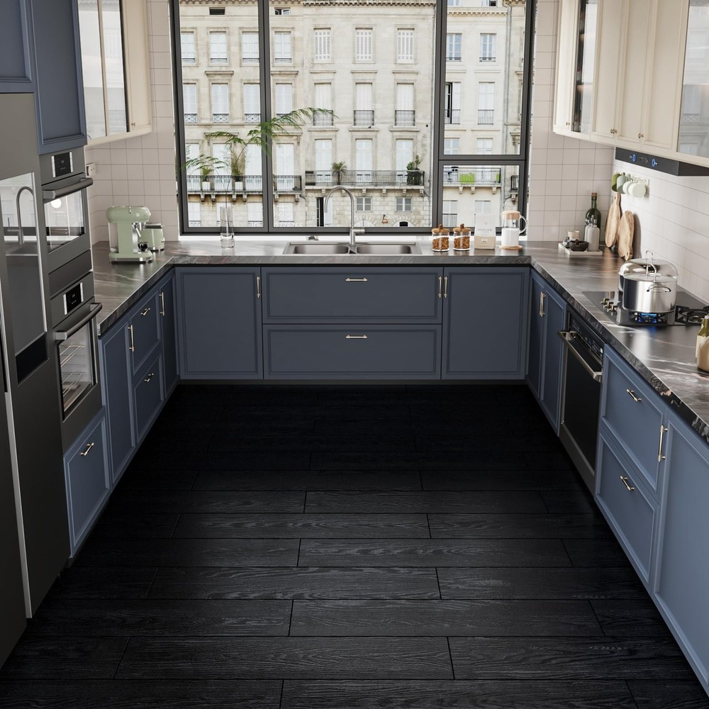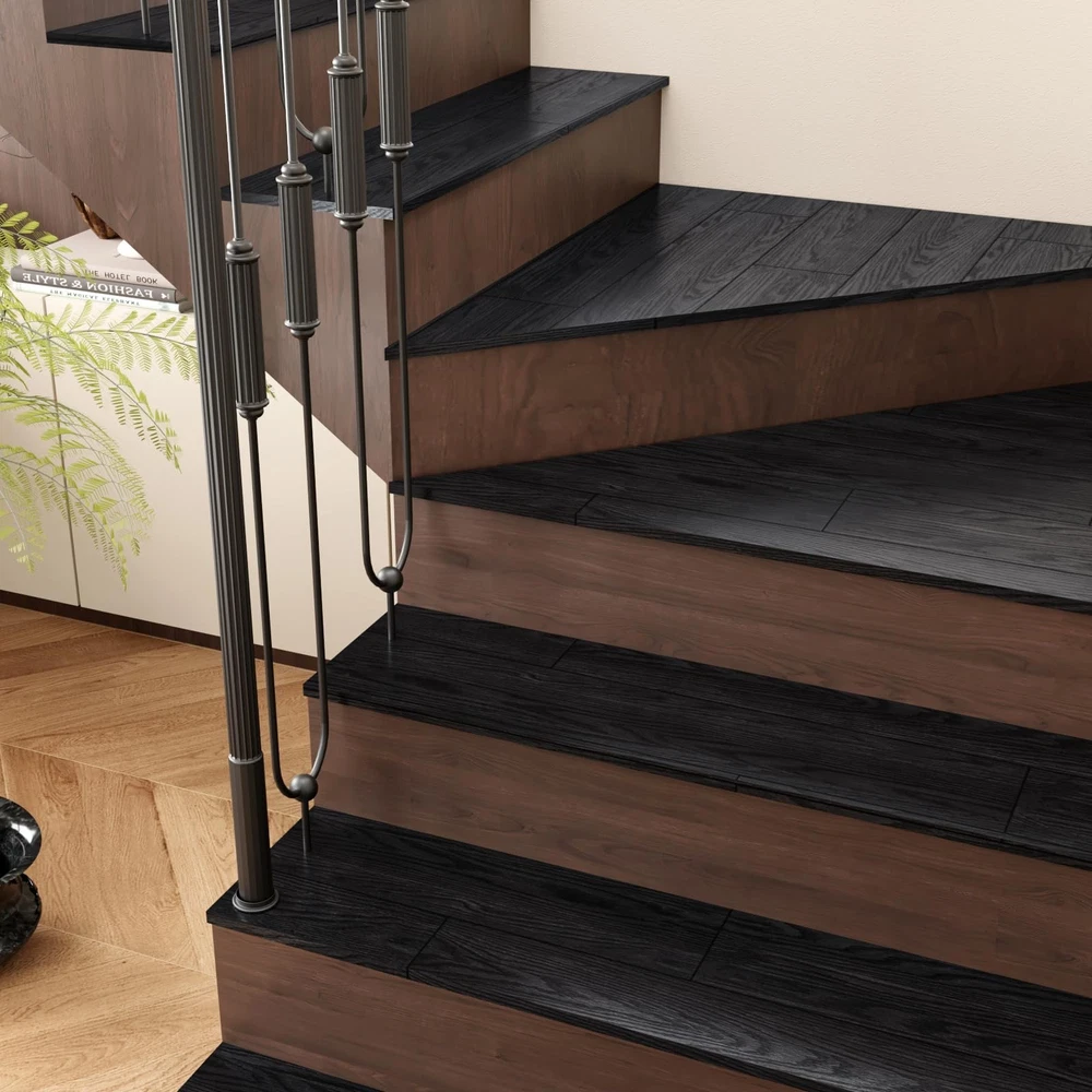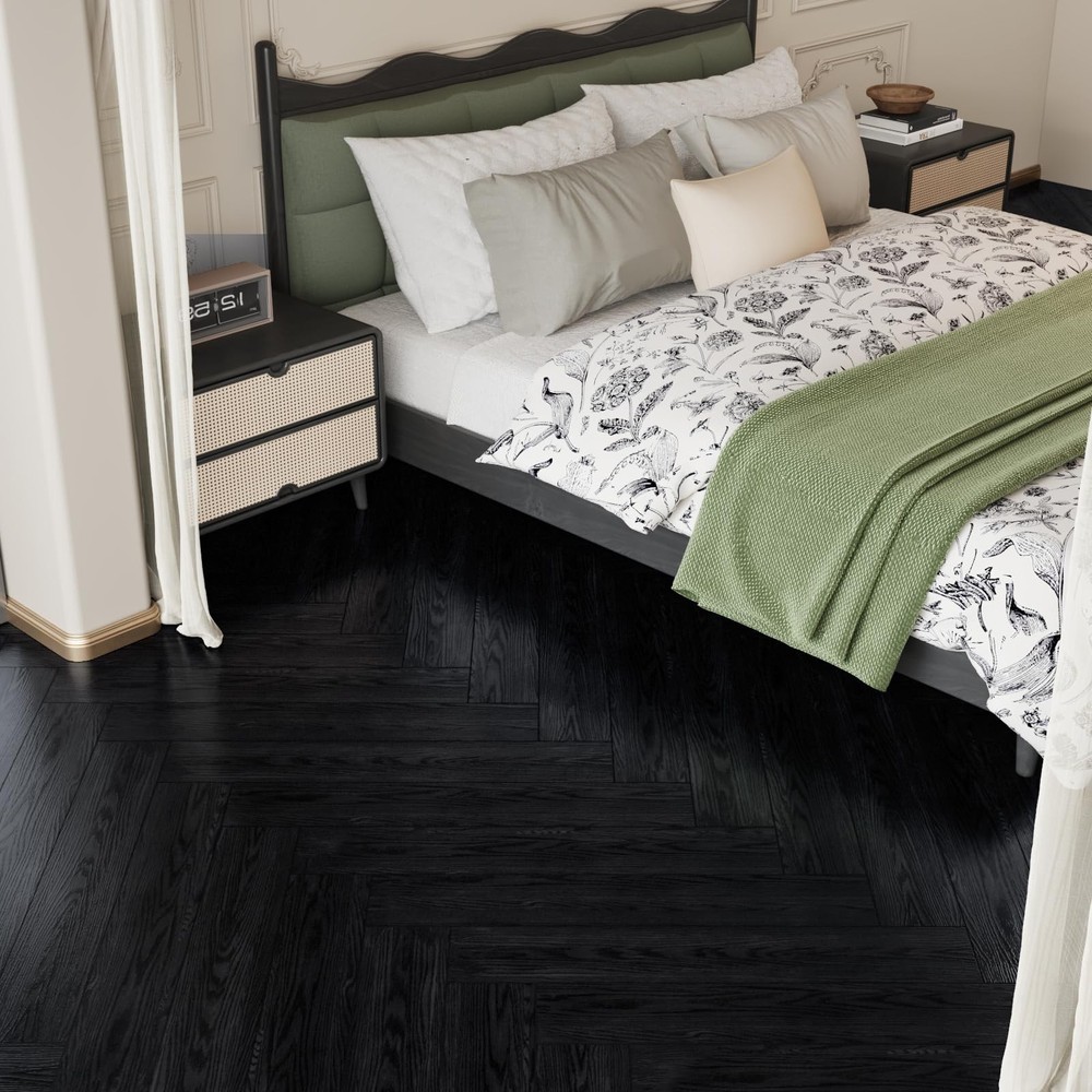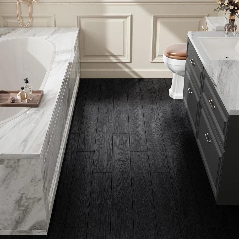 black peel and stick floor tile waterproof vinyl plank flooring self adhesive vinyl tiles temporary laminate peel and stick flooring DETAILS: Black vinyl plank flooring, each plank measures 6"W x 36"L, 1.3mm thick, 24 planks per box, covers 36 Sq. Ft. Realistic and natural wood look, low glossy, textured finish, ideal for those on a budget but looking for aesthetics FEATURES: Black peel and stick floor tile, waterproof, oil-proof, moisture-proof, easy to clean and maintain, durable, wear resistant, scratch-resistant, pet-friendly, long-lasting, suitable for high-traffic areas, or wet environments such as bathrooms and kitchens EASY TO INSTALL: Peel and stick vinyl floor tile, self adhesive backing, no extra glue or special tools needed, easy to cut, easy to use, simply clean the floor, peel off the backing and stick it for quick installation. Temporary flooring, removable, renter friendly WIDELY USED: Peel and stick flooring for bathroom, bedroom, kitchen, living room, dining room, laundry room, hallway, entryway, basement, garage, classroom, office, RV, camper, flooring, stairs, various layout patterns, suitable for any dry and flat sub-floor, such as polished concrete, vinyl laminate, wood, ceramic tile WARM TIPS: *For best adhesive result, please make sure the sub-floor is smooth, flat, clean, dust-free and dry. *Make sure to roll or flatten the planks after installation, applying pressure to make them stick more firmly. *Do not clean or wash the floor or place any heavy furniture on the floor within 24 hours of installation