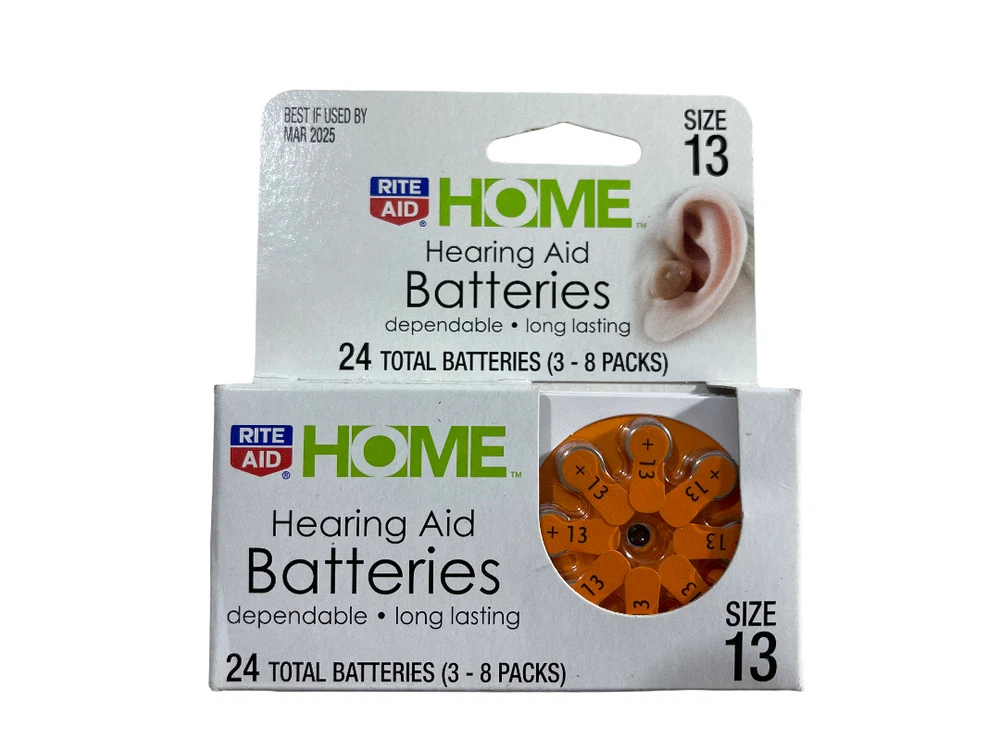 24-Pack FACTORY FRESH Rite Aid Pharmacy Hearing Aid Batteries SIZE 13 - Expire 3/2025 24 BATTERY VALUE PACK - You get THREE 8-Packs 4 Years Dependable Shelf Life. Effortlessly and effectively increase and control sound volume with Rite Aid Hearing Aid Batteries. Simply place the battery in a compatible hearing aid to instantly boost the volume of voices and noises around you. These dependable hearing aid batteries provide long-lasting power. Value pack includes three 8-packs of size 13 batteries.