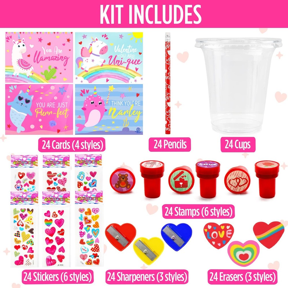 Valentines Day Gifts for Kids - 24 Pack Valentines Day Stationery Gift with Cards Pencils Stickers Erasers Stampers Sharpener Cups Classroom Prize School Exchange Boys Girls Party Favors Product Details Color: Pink Material: Plastic Brand: ORIENTAL CHERRY Unit Count: 1.0 Count Manufacturer: ShenZhen MaoDun MaoYi YouXianGongSi Age Range (Description): Kid Package Dimensions: 11.02 x 7.24 x 4.88 inches Item Weight: 2.46 pounds Date First Available: September 8, 2022 Valentine's Day stationery set includes 24 cups, 24 pencils, 24 cards, 24 stickers, 24 stampers, 24 sharpeners and 24 erasers. Total of 168 pieces. Plastic cup measures 4.1" tall. Holds a variety of stationery Card measures 4.8" x 2.2". 4 styles of unicorn design Bulk cards and stationery are great for DIY unique gifts with kids Ideal for school exchange, teacher classroom prizes, Party Favors Supplies
