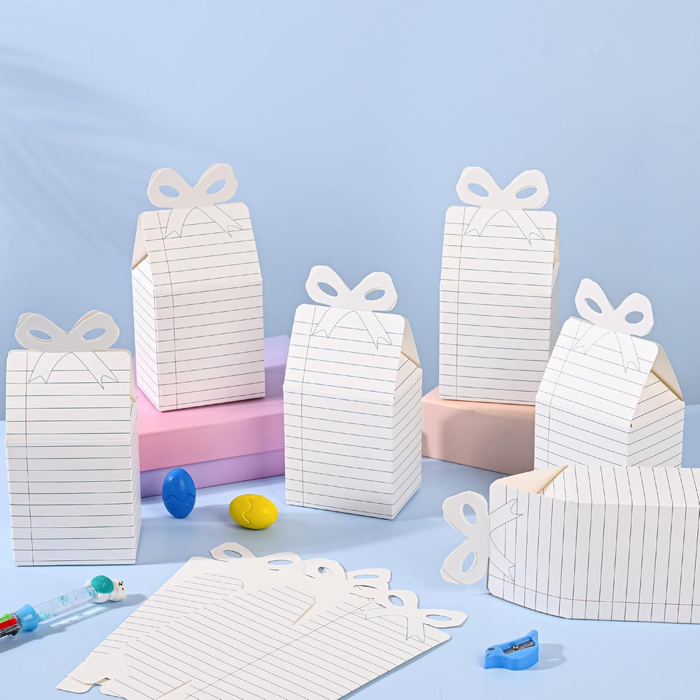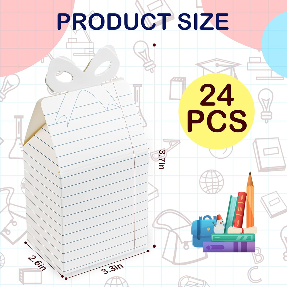 Menu Other Items Feedbacks About Us Contact Us Add To Favorites 24Pcs Back to School Gift Boxes Notebook Graduation Candy Box First Day of School Classroom Treat Box with Bow for Party Favors Thanks Teacher School Classroom Decoration Back to School Surprises: Delight students and teachers with 24 charming foldable gift boxes! Ideal for first-day treats, classroom rewards, or teacher appreciation gifts, these adorable boxes add a playful touch to cookies, candies, small toys, or heartfelt notes Effortless Assembly, Maximum Impact: Pre-creased boxes fold into shape in seconds—no scissors or tape needed! Includes glue dots for secure closures. Flat storage saves space until party day, making them stress-free for busy teachers and parents Premium Design: Made of sturdy, double-sided cardstock with vibrant photo-quality prints. Non-toxic, odor-free, and built to hold treats securely. Features cute school notebook themed designs with bows—perfect for boys and girls to personalize Multi-Use Celebration Essential: Use beyond classrooms: birthday party favors, holiday goodie bags, or wedding loot boxes. Doubles as festive desk decor or DIY craft projects. Bulk 24-pack ensures every student gets a memorable surprise Value-Packed Party Starter Kit: Get 24 boxes + glue dots for large groups. Teachers love using them for icebreaker activities, while parents rave about their worthy graduation Get 24 ready to decorate notebook design boxes! Great for classrooms, school carnivals, or teacher thank-you Size for storing items inside: 3.5 inches tall. Hide treats, notes, or classroom rewards inside. Add ribbons to create festive desk decor or loot boxes Works as birthday party favors, holiday loot bags, or wedding welcome gifts. Doubles as desk decor for school spirit Specifications: Materials: paper Size: 3.75 x 3.55 x 2.55inch Package includes: 24 x notebook gift boxes 40 x glue dots Notes: Manual measurement, these may vary in sizes slightly Arrives flat, some assembly required Item Specification Item model number Back to School Gift Boxes Part Number Back to School Gift Boxes Batteries Required? No Number of Items 24 Unit Count 24.0 Count Color White Pattern Cartoon Material Cardboard Country of Origin China Item Weight 12.3 ounces Theme Notebook Cartoon Batteries Included? No Occasion Birthday, Back To School Size 1 Count (Pack of 24) Package Dimensions 9.41 x 6.18 x 1.34 inches Included Components 24 Gift Boxes, 40 Glue Dots SHIPPING FREE FAST SHIPPING FREE SHIPPING We are always working hard to ensure your package arrives as soon as possible. Please understand that some factors like weather, high postal traffic, and the performance of shipping companies are outside of our control. We offer free shipping to the lower 48 states. We do not accept P.O. Boxes. Please provide a physical address. If you have a problem or question regarding your transaction please contact us immediately. We will work with you to resolve any problem you may have. Thank you