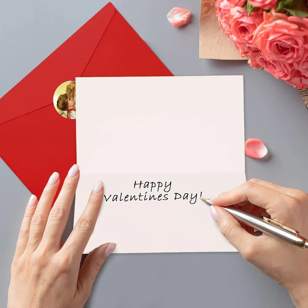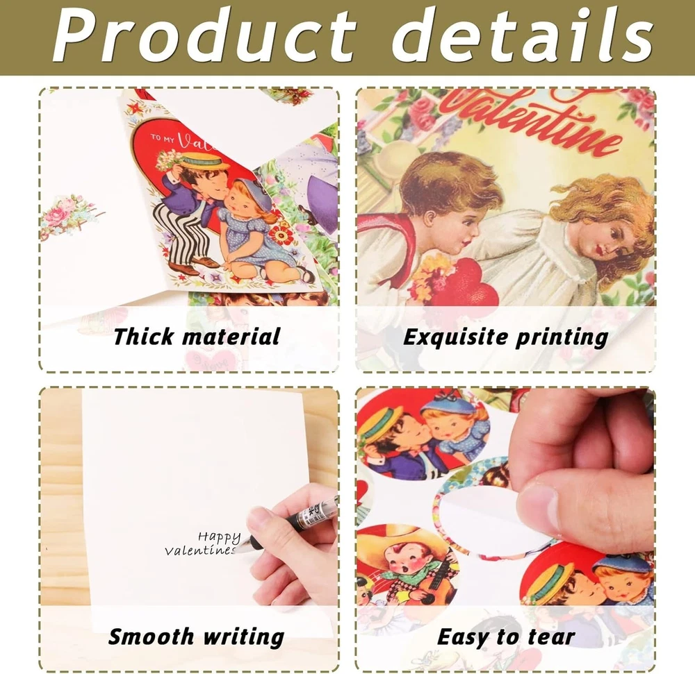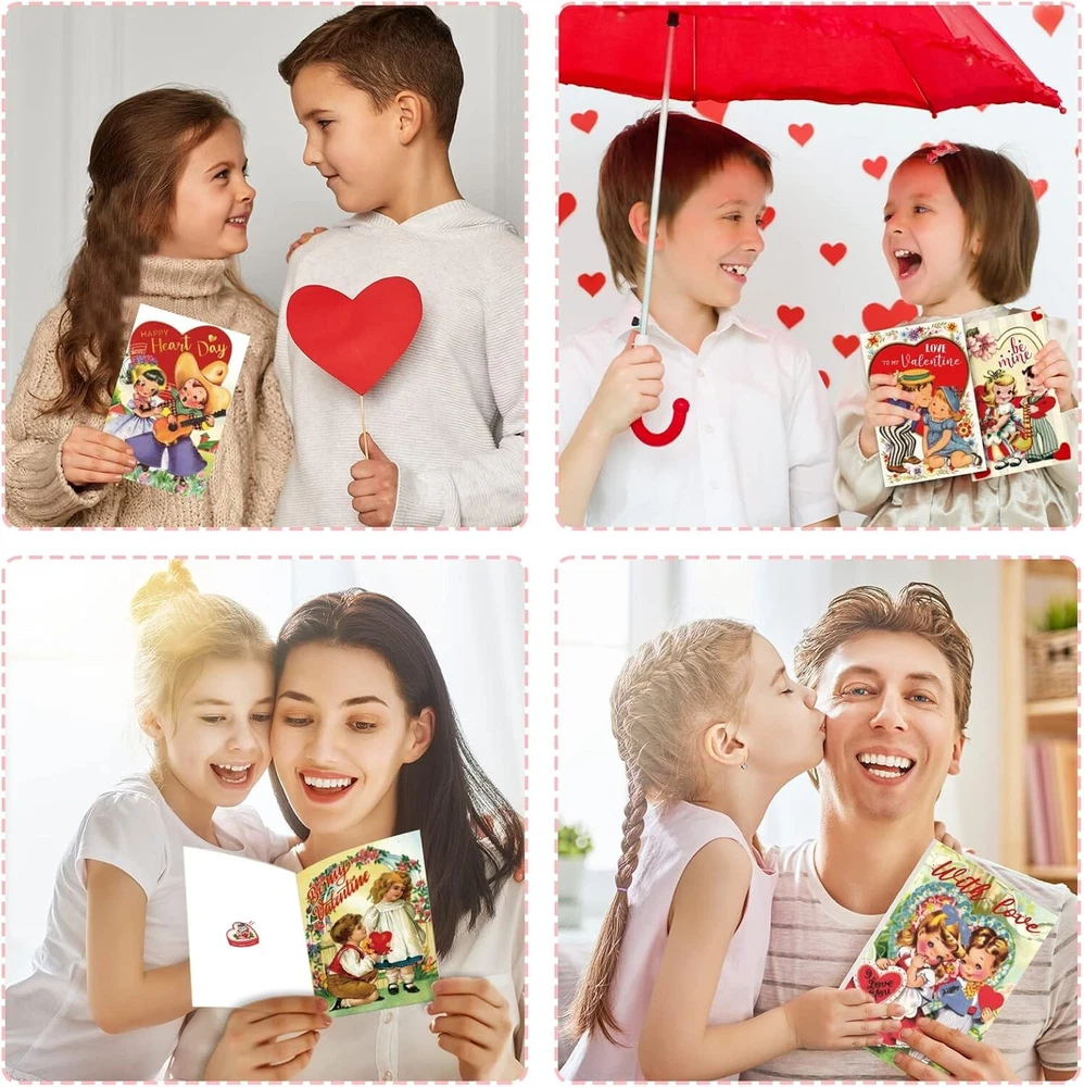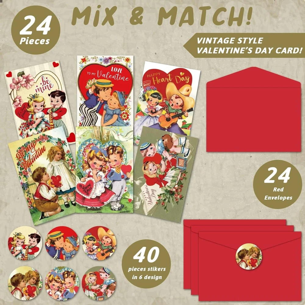 24 Pack Vintage Valentine's Day Cards with Envelopes and Stickers Valentines Day Greeting Cards Assortment for Kids Holiday Crafting All Occasions Anniversary Baby Shower Classroom Exchange Supplies About this item What You Will Receive : The Valentine's Day card pack contains 24pcs greeting cards in 6 designs , 24pcs envelopes and 40pcs stickers.This Valentine's Day cards assortment is designed for kids to spread their wishes on Valentine's Day. Elements Full of Valentine's Day Atmosphere:The hearts and roses on the picture are very suitable for the sweet and warm atmosphere of Valentine's Day. The choice of card color is very retro ,it’s also different from ordinary greeting cards, which will be very impressive to your friends. Reliable Material: Valentine's Day cards are made from well-managed forests,this kind of material does not contain any chemical ingredients.It don’t cause any harm to your health and it’s the best choice for your kids. More Space to Write:The Valentine's Day cards' measurement are Approx. 8"x6" (20.32cm x 15.24cm). Valentine's Day cards have more space for writing than normal cards.The surface of the Valentine's Day cards made of this material is very smooth, kids can draw and paint on it at will to fully express their emotions. Suit for Many Places:Valentine's Day cards can be used in many places.For example, you can write or draw on them to send your greetings to your friends. You can also give it as a birthday gift to your kids.