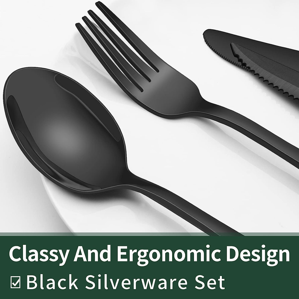 PREMIUM 24-PIECE BLACK SILVERWARE SET FOR 4: This flatware set contains 4 dinner forks, 4 salad forks, 4 dinner spoons, 4 dessert spoons, 4 dinner knives and 4 steak knives. It’s the ideal set for home daily use, and also for restaurants, pubs, cafes, and hotels. This cutlery set also help your dinner full of design while having a party. 4 STEAK KNIVES INCLUDED: 4 additional steak knives are offered in this pack that are also made of stainless steel with sharp serrations on the blades help it easy to cut meat, and being ideal to use for eating. The triple riveting handle is strong and durable even when cut hard, and the ergonomic design makes it very comfortable to hold. USE AND MAINTENANCE: Recommend hand wash first, storage them after drying. Wire brush, hard sponge, cleaning cloth or any other hard material are not recommend , it will damage the silver. COMFORTABLE DESIGN: This flatware set has a classic silhouette with clean lines and polish-finish surface in all black, a good choice to go with your existing tableware. The smooth edge of the handle is pleasure to hold, appropriate weight and perfect balance are added to ensure maximum comfort during use. HIGH-QUALITY STAINLESS STEEL: Made of premium food-grade stainless steel, providing the longest term value and the best properties, it offers nice resistance to rust and corrosion to get the most sturdy and healthy experience while using, never bend in daily use. Product Description UNIQUE MODERN BLACK FLATWARE SET WITH METALLIC LOOK, MAKE YOUR TABLE SETTING ELEGANT AND DIFFERENT EWFEN 24-Piece Great Value Flatware Set is made of the premium 18/0 stainless steel will not bend, break, or get damaged by heat. This elegant silverware set would elevate your everyday meals into a fine dining experience. LUXURY BLACK SILVERWARE Satin black makes it looks more retro, creating an elegant, noble and luxurious dining atmosphere, elevating everyday meals into a fine dining experience. USING INSTRUCTION: 1. Please wash the silverware set with warm soapy water before first using to wash off any processing residue left from manufacturing. 2. Please clean the silverware set after using and dry the pieces for their durability. 24 PIECES CUTLERY SET, SERVICE FOR 4 Black Dinner Knife x 4 Black Dinner Fork x 4 Black Dinner Spoon x 4 Black Salad Fork x 4 Black Tea Spoon x 4 Black Steak Knife x 4 Proper gauge thickness and weight, sleek curved edges ensure the utmost comfort. The handles, in particular, provide a natural, balanced feel in hand. Ergonomic design for comfortable grip by both adults and children. In this pack comes with 4 steak knives, no need to purchase another meat knives to fit in the existing silverware set. Sharp serrated blades of the steak knives can easily cut and slice various steaks and other meats. No complicated handle decoration, elegant and simple designis favored by most people, match any style of your dinnerware or tableware set. Highly reflective finishing increase taste of your everyday meals. We are committed to provide unique style and premium quality tableware set to customers. Hope you have a good dining experience!