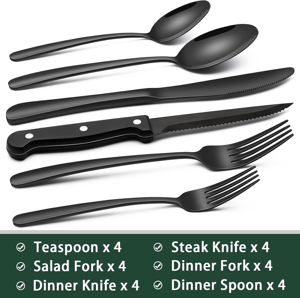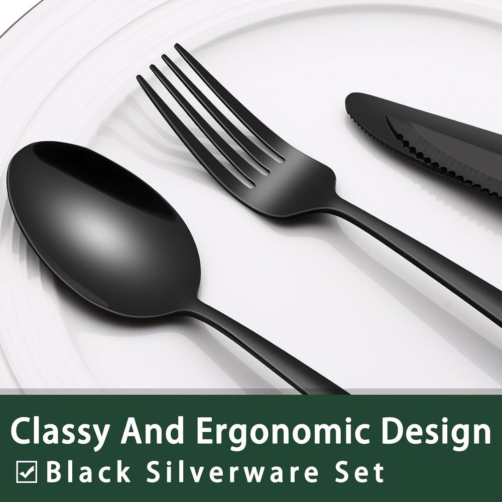 Black Heavy Duty Silverware Set, 24-Piece Stainless Steel Flatware Set Product Details Brand: EWFEN Number of Pieces: 24 Material: Stainless Steel Color: Black Product Care Instructions: Dishwasher Safe Recommended Uses For Product: Camping Special Feature: Mirror Polished, Dishwasher Safe Finish Type: Mirror Satin Included Components: 4 Dinner Forks, 4 Salad Forks, 4 Dinner Spoons, 4 Dessert Spoons, 4 Dinner Knives, 4 Steak Knives Style: Heavy Duty Is Stain Resistant: Yes Is Dishwasher Safe: Yes Manufacturer: EWFEN Package Dimensions: 9.57 x 3.43 x 2.13 inches Item Weight: 2.78 pounds Item model number: xike-1013CA PREMIUM 24-PIECE BLACK SILVERWARE SET FOR 4: This flatware set contains 4 dinner forks, 4 salad forks, 4 dinner spoons, 4 dessert spoons, 4 dinner knives and 4 steak knives. It’s the ideal set for home daily use, and also for restaurants, pubs, cafes, and hotels. This cutlery set also help your dinner full of design while having a party. COMFORTABLE DESIGN: This flatware set has a classic silhouette with clean lines and polish-finish surface in all black, a good choice to go with your existing tableware. The smooth edge of the handle is pleasure to hold, appropriate weight and perfect balance are added to ensure maximum comfort during use. HEAVY DUTY: 1.5 to 2 times the thickness of ordinary flatware set, thick construction will not bend or flimsy after heavy use, heavy-weight feel with exceptional balance, each eating utensil is a pleasure to hold. USE AND MAINTENANCE: Recommend hand wash first, storage them after drying. Wire brush, hard sponge, cleaning cloth or any other hard material are not recommend , it will damage the silver. HIGH-QUALITY STAINLESS STEEL: Made of premium food-grade stainless steel, providing the longest term value and the best properties, it offers nice resistance to rust and corrosion to get the most sturdy and healthy experience while using, never bend in daily use.