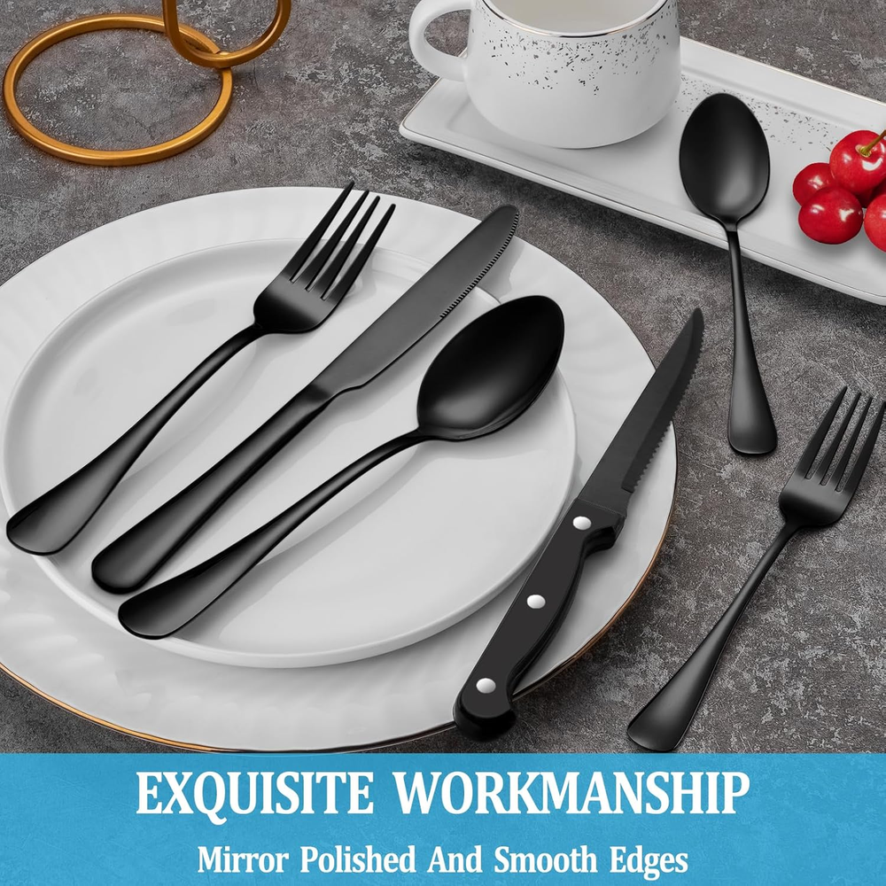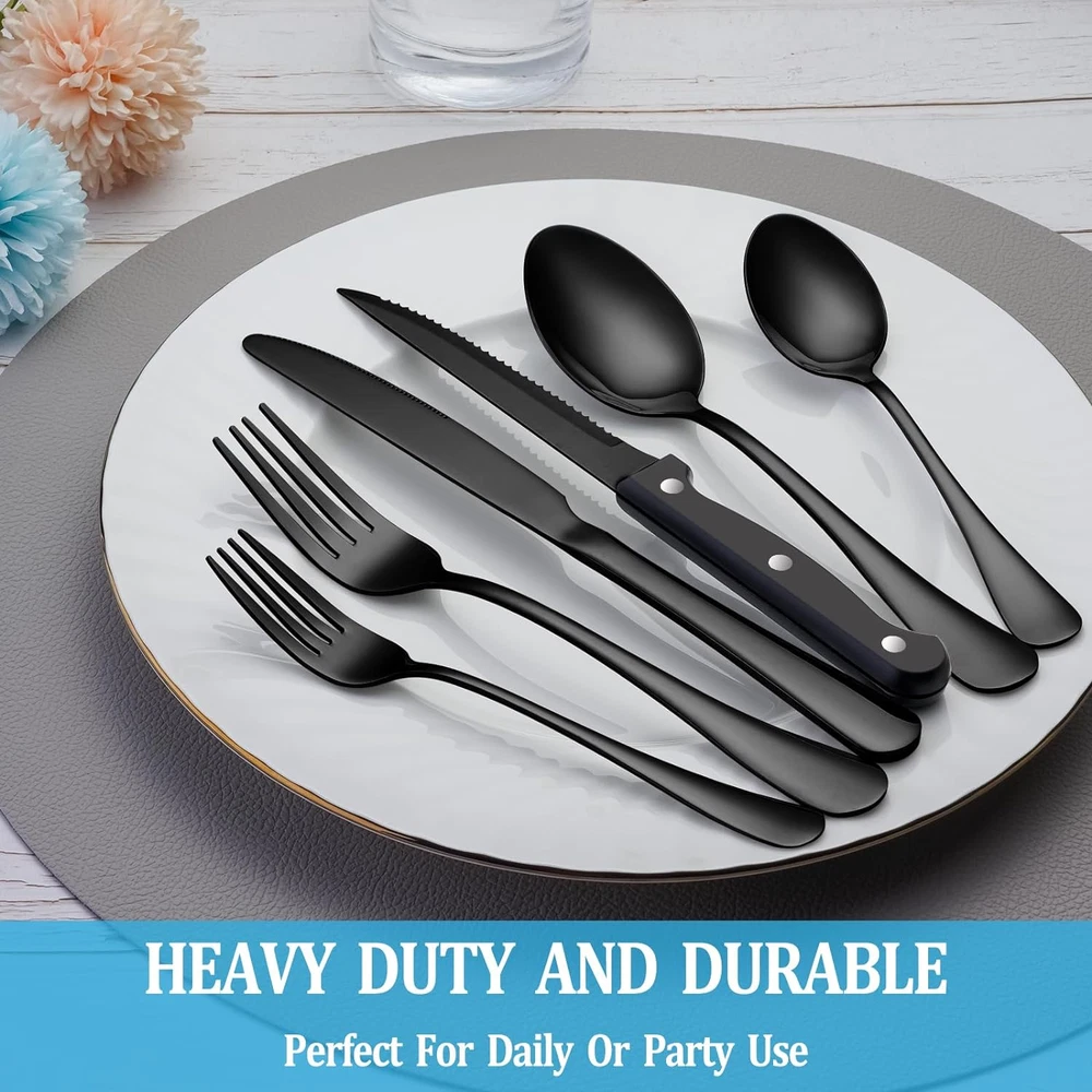 24 PCS BLACK SILVERWARE SET FOR 4: This black silverware set comes with 4 Dinner Knife, 4 Steak Knives, 4 Dinner Forks, 4 Dinner Spoons, 4 Salad/Dessert Fork and 4 Dessert/Tea Spoons, essential for families or restaurants. The set is also an irreplaceable dining tool whether it is for daily use or for preparing dinners or parties. PREMIUM STAINLESS STEEL: This flatware set is made of high quality food grade stainless steel which is very durable, rust-proof, corrosion resistant, non-toxic, BPA free, no metal aftertaste. Meanwhile, its sturdiness ensures that it will not bend easily providing you with long - term use. UNIQUE BLACK LOOK: The mysterious black appearance stands out from ordinary silverware, making it look more retro and vintage, just like a noble flatware used in the manor, smooth surface and fine workmanship make it more luxurious and create an elegant, noble and luxurious dining atmosphere. There is no need to worry about fading or cracking, as this is a metal layer from vacuum plating technology. If you want to be different in tableware, you won’t miss it. PROPER WEIGHT AND ERGONOMIC HANDLE: Unlike other brands, the curvature of our utensil handles is designed according to the posture of the hand, and the appropriate weight and perfect balance are added to ensure maximum comfort during use that avoids you feel tired. Moreover, the smooth edges ensure safety and no scratches. USE AND CARE: It is recommended to wash by hand, wipe dry before storing. Do not use wire brushes, hard sponges or clean cloths and other hard materials cleaning tools to avoid damage the silverware. Product Description MUTNITT black silverware set is made of top food grade stainless steel that ensures safety and durability. They are rust-proof, corrosion-resistant, non-toxic, sturdy structure and durable for daily use. With simple and elegant design, It is definitely the best set for serving families, entertaining guests or hosting parties, holiday meal, weddings, etc. Package includes: 9" Dinner Knife x 4 9" Steak Knives x 4 8" Dinner Spoon x 4 8" Dinner Fork x 4 6.7" Salad Fork x 4 6.7" Teaspoon x 4 Using instruction: 1.Please wash the silverware set before first use to make sure no manufacturing residue. 2.Please clean the silverware set after using and dry the pieces for their durability. 3.Please do not use iron wire to scratch the pieces to keep their smooth surface. 4.The silverware set is Dishwasher Safe so you can run it in dishwasher to save your labor. Comes with 4 steak knives, no need to purchase separately, the blade has sharp serrations, you can cut and slice various steaks and other meats effortlessly. The handle is reinforced by 3 layers of rivets, which is durable, and designed in line with holding posture, making it comfortable and easy to use. These tableware have proper thickness and uniform weight distribution, so that it has a good balance, which makes it more comfortable to use and not easy to feel fatigued. Also suitable for teenagers and young people. The curvature of our tableware handle is designed according to the posture of the hand, which makes it more comfortable to hold and will not feel tired after long-term use. The handle has some thickness, so it is comfortable to grip, and is strong enough not to bend or break.