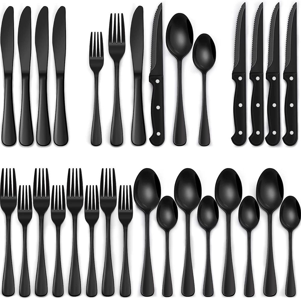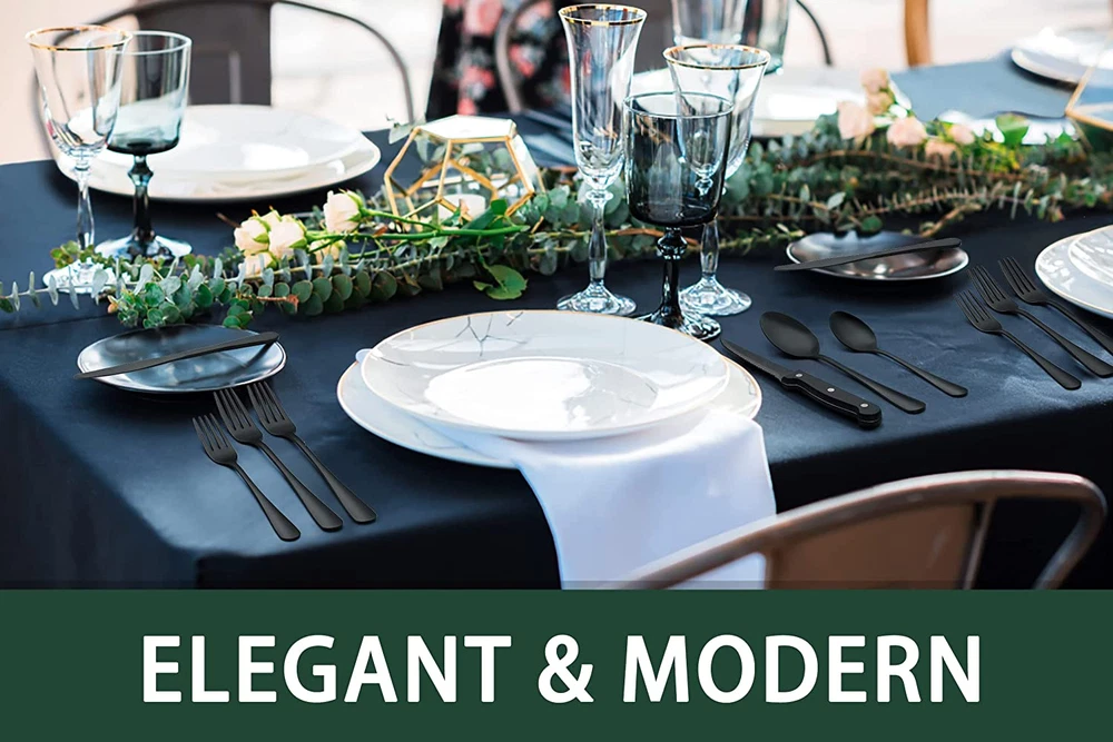 PREMIUM 24-PIECE BLACK SILVERWARE SET FOR 4: This flatware set contains 4 dinner forks, 4 salad forks, 4 dinner spoons, 4 dessert spoons, 4 dinner knives and 4 steak knives. It’s the ideal set for home daily use, and also for restaurants, pubs, cafes, and hotels. This cutlery set also help your dinner full of design while having a party. 4 STEAK KNIVES INCLUDED: 4 additional steak knives are offered in this pack that are also made of stainless steel with sharp serrations on the blades help it easy to cut meat, and being ideal to use for eating. The triple riveting handle is strong and durable even when cut hard, and the ergonomic design makes it very comfortable to hold. USE AND MAINTENANCE: Recommend hand wash first, storage them after drying. Wire brush, hard sponge, cleaning cloth or any other hard material are not recommend , it will damage the silver. COMFORTABLE DESIGN: This flatware set has a classic silhouette with clean lines and polish-finish surface in all black, a good choice to go with your existing tableware. The smooth edge of the handle is pleasure to hold, appropriate weight and perfect balance are added to ensure maximum comfort during use. HIGH-QUALITY STAINLESS STEEL: Made of premium food-grade stainless steel, providing the longest term value and the best properties, it offers nice resistance to rust and corrosion to get the most sturdy and healthy experience while using, never bend in daily use. Product Description UNIQUE MODERN BLACK FLATWARE SET WITH METALLIC LOOK, MAKE YOUR TABLE SETTING ELEGANT AND DIFFERENT EWFEN 24-Piece Great Value Flatware Set is made of the premium 18/0 stainless steel will not bend, break, or get damaged by heat. This elegant silverware set would elevate your everyday meals into a fine dining experience. LUXURY BLACK SILVERWARE Satin black makes it looks more retro, creating an elegant, noble and luxurious dining atmosphere, elevating everyday meals into a fine dining experience. USING INSTRUCTION: 1. Please wash the silverware set with warm soapy water before first using to wash off any processing residue left from manufacturing. 2. Please clean the silverware set after using and dry the pieces for their durability. 24 PIECES CUTLERY SET, SERVICE FOR 4 Black Dinner Knife x 4 Black Dinner Fork x 4 Black Dinner Spoon x 4 Black Salad Fork x 4 Black Tea Spoon x 4 Black Steak Knife x 4 Proper gauge thickness and weight, sleek curved edges ensure the utmost comfort. The handles, in particular, provide a natural, balanced feel in hand. Ergonomic design for comfortable grip by both adults and children. In this pack comes with 4 steak knives, no need to purchase another meat knives to fit in the existing silverware set. Sharp serrated blades of the steak knives can easily cut and slice various steaks and other meats. No complicated handle decoration, elegant and simple designis favored by most people, match any style of your dinnerware or tableware set. Highly reflective finishing increase taste of your everyday meals. We are committed to provide unique style and premium quality tableware set to customers. Hope you have a good dining experience!