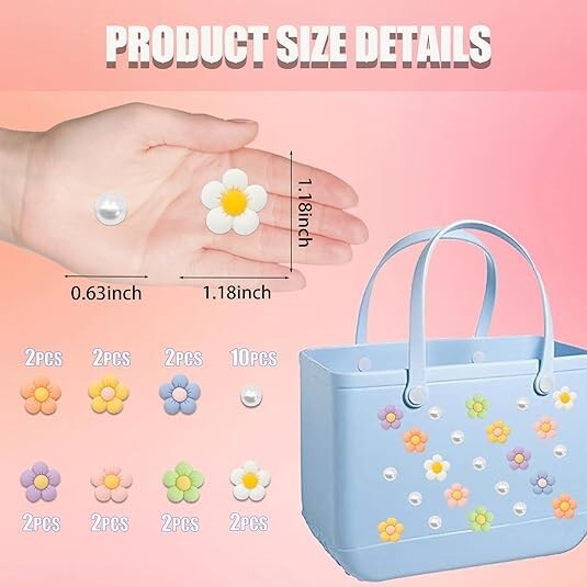 24 Pcs Charms for Bogg Bag Pearls and Flowers for Beach Tote Accessories New Bag Not Included Material: Silicone, pearl Metal type: No Metal Type Clasp type: Button Clasp Gem type: No Gemstone Compatible with Bog Bag Accessories Charms: This set includes 14 flower charms in 7 different colors, and 10 pearl charms, all essential components for adding a distinctive touch to your beach bag Easy Installation and Removal: The button diameter of the charm for Bogg bag is 0.59 inches, ensuring a secure fit that resists dislodgement. Installation is simple, the button can be easily inserted into the designated hole on your handbag bag without causing any damage High-Quality Materials: Each charm is meticulously crafted from premium PVC and resin materials, ensuring durability and longevity. These charms retain their integrity and aesthetic appeal over time, complementing your modern and stylish bag perfectly Versatile Applications: This accessory set, featuring pearl and flower charms, is ideal for enhancing the appearance of your beach bag for various occasions such as beach outings, poolside relaxation, picnics, and parties. It adds a playful yet elegant touch to your summer style, showcasing your personality and individuality Ideal Gift: These charming accessories make a perfect gift for mothers, daughters, friends, or anyone who owns a beach handbag. They serve as a thoughtful and personalized addition to any handbag, adding flair and individuality Return Policy: We offer a 30 day return policy from the receiving date. Please contact us for a Free Return Label. Please use our return label so it will go back to our supplier and we can do a refund or replacement afterwards. Feedback: Your satisfaction is very important to us! If you have any problem with your order, please contact us and we will do our very best to make you satisfied. As long as you are happy with your purchase, please leave a positive feedback for us. We will always leave you a positive feedback in return. If you have any problem with your purchase, please do not leave a negative feedback. Please Contact us ... and your issue will be solved quickly and positively We are a small family-owned business trying to make a living, not a huge company that does not care ... We will ALWAYS do our best for you!