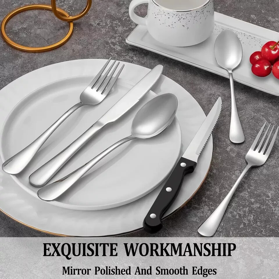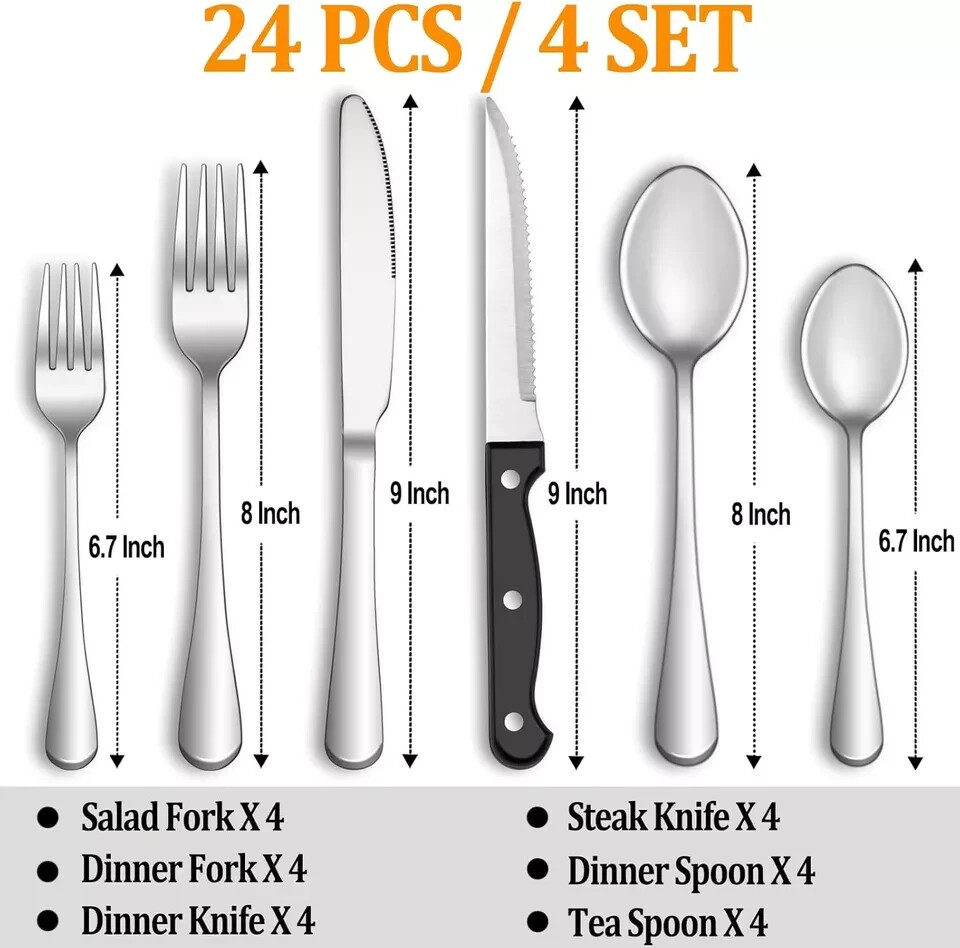 About this item 24 PCS SILVERWARE SET SERVICE FOR 4: This silverware set comes with 4 Dinner Knife, 4 Steak Knives, 4 Dinner Forks, 4 Dinner Spoons, 4 Salad/Dessert Fork and 4 Dessert/Tea Spoons, essential for families or restaurants. The set is also an irreplaceable dining tool whether it is for daily use or for preparing dinners or parties. PREMIUM STAINLESS STEEL: This flatware set is made of high quality food grade stainless steel which is very durable, rust-proof, corrosion resistant, non-toxic, BPA free, no metal aftertaste. Meanwhile, its sturdiness ensures that it will not bend easily providing you with long - term use. Most importantly, they're dishwasher safe. PROPER WEIGHT AND COMFORTABLE HANDLE: Unlike other brands, the curvature of our utensil handles is designed according to the posture of the hand, and the appropriate weight and perfect balance are added to ensure maximum comfort during use that avoids you feel tired. Moreover, the smooth edges ensure safety and no scratches. ELEGANT SHAPE AND EXQUISITE WORKMANSHIP: Highly mirror polished, smooth edges and the classic shape design make this flatware set stunning and look expensive. It is very suitable for all your home styles and can match any tableware you have. There are no rough spots or sharp edges, very comfortable to use without hurting your mouth at all. MULTIPLE USES: Choosing a good set of cutlery is not only for everyday use, but also for upcoming holiday parties, gatherings, weddings, camping and entertainment, or for buffets and banquets at restaurants or hotels. It's also a wonderful choice as a gift.
