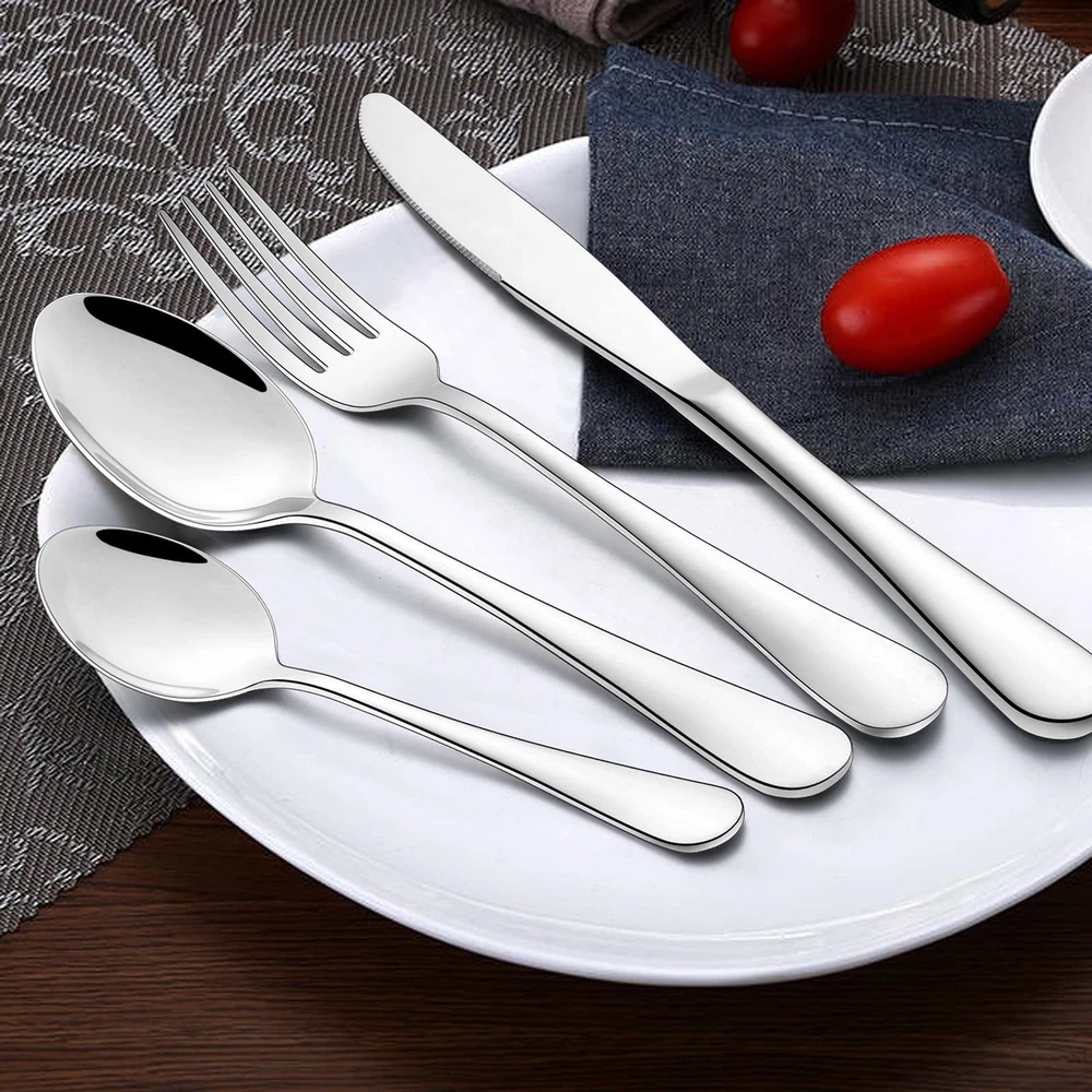 SERVICE FOR 4: 24-piece stainless steel silverware set includes 4 steak knives, 4 dinner knives, 4 dinner forks, 4 dinner spoons, 4 salad forks and 4 tea spoons. HIGH QUALITY: This flatware set is made of high quality 18/0 stainless steel, rust resistance and healthy for daily use. Easy clean and dishwasher safe. ELEGANT DESIGN: Mirror polished surface, smooth edges no rough spots, nice with a good length and proper weight, these tableware utensils provides a comfortable grip for both adults and big children. FUNCTIONAL: Perfect for any formal or informal occasions, such as home, hotels, restaurants, gathering, parties, wedding, picnics, camping, etc. USE AND MAINTENANCE: It’s recommended to wash by hand, wipe dry before storing. Wire brush, hard sponge, cleaning cloth or any other hard material are not recommended, it will damage the silverware.