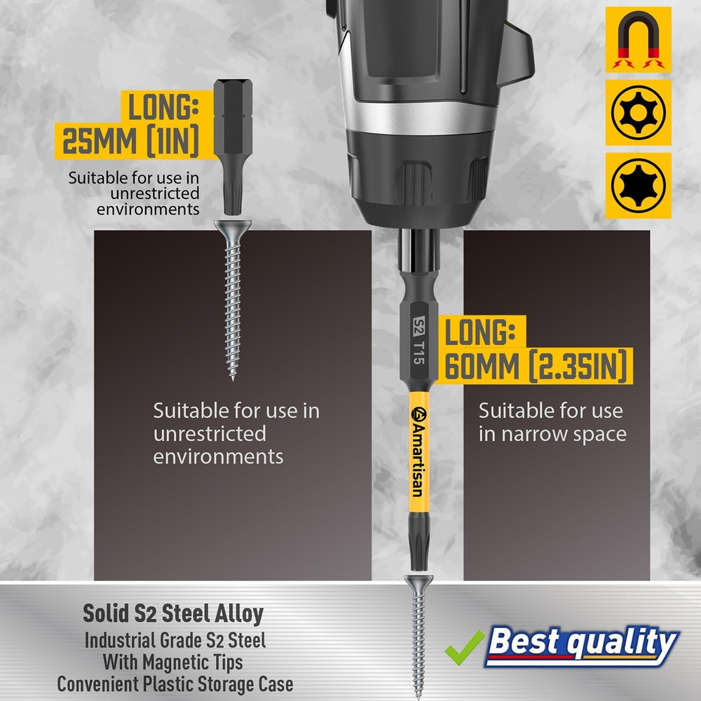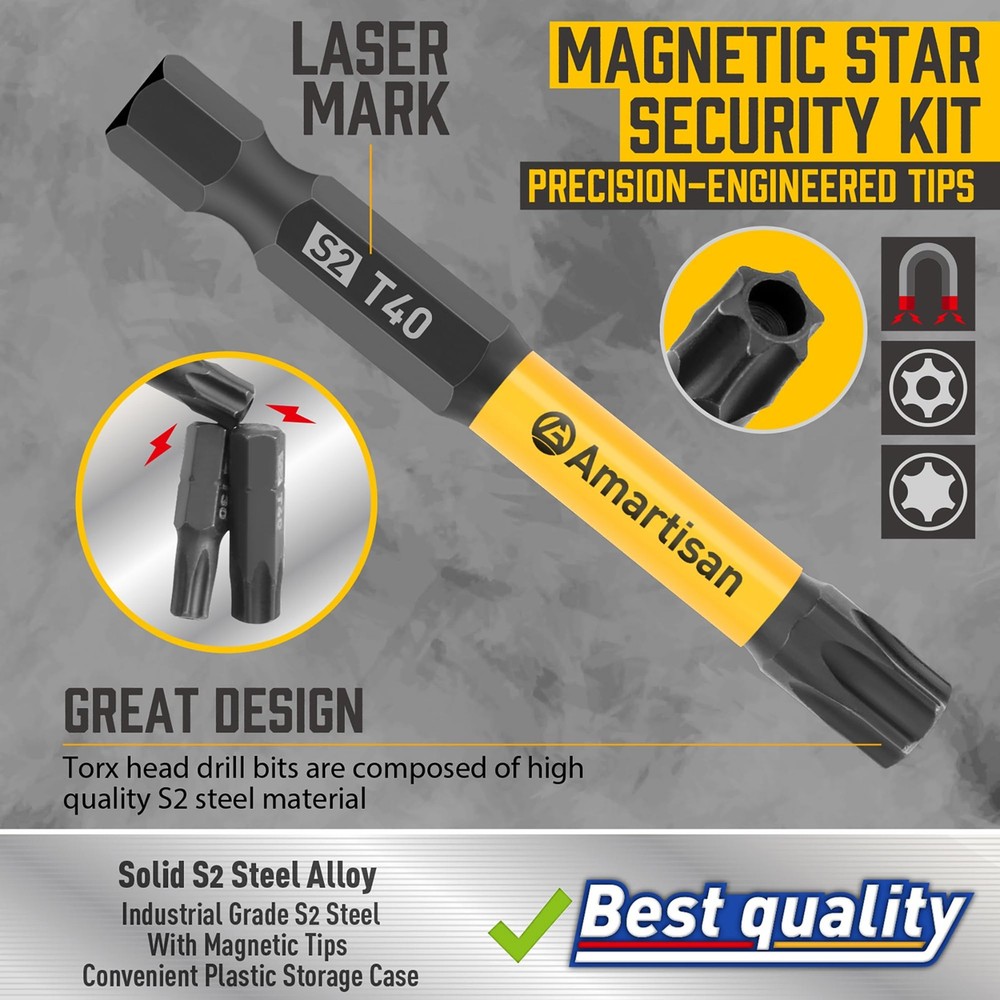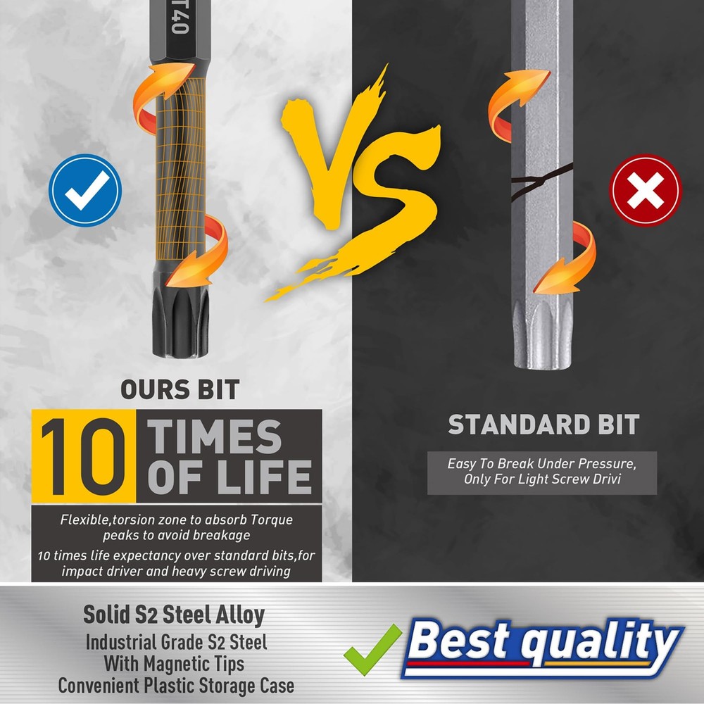 This Torx bit set is a game-changer! The S2 steel construction makes them super durable, and they grip screws tightly without stripping. Love the variety of sizes and lengths—perfect for both small electronics and tougher jobs. The tamper-resistant design is a nice bonus. Definitely worth the money!