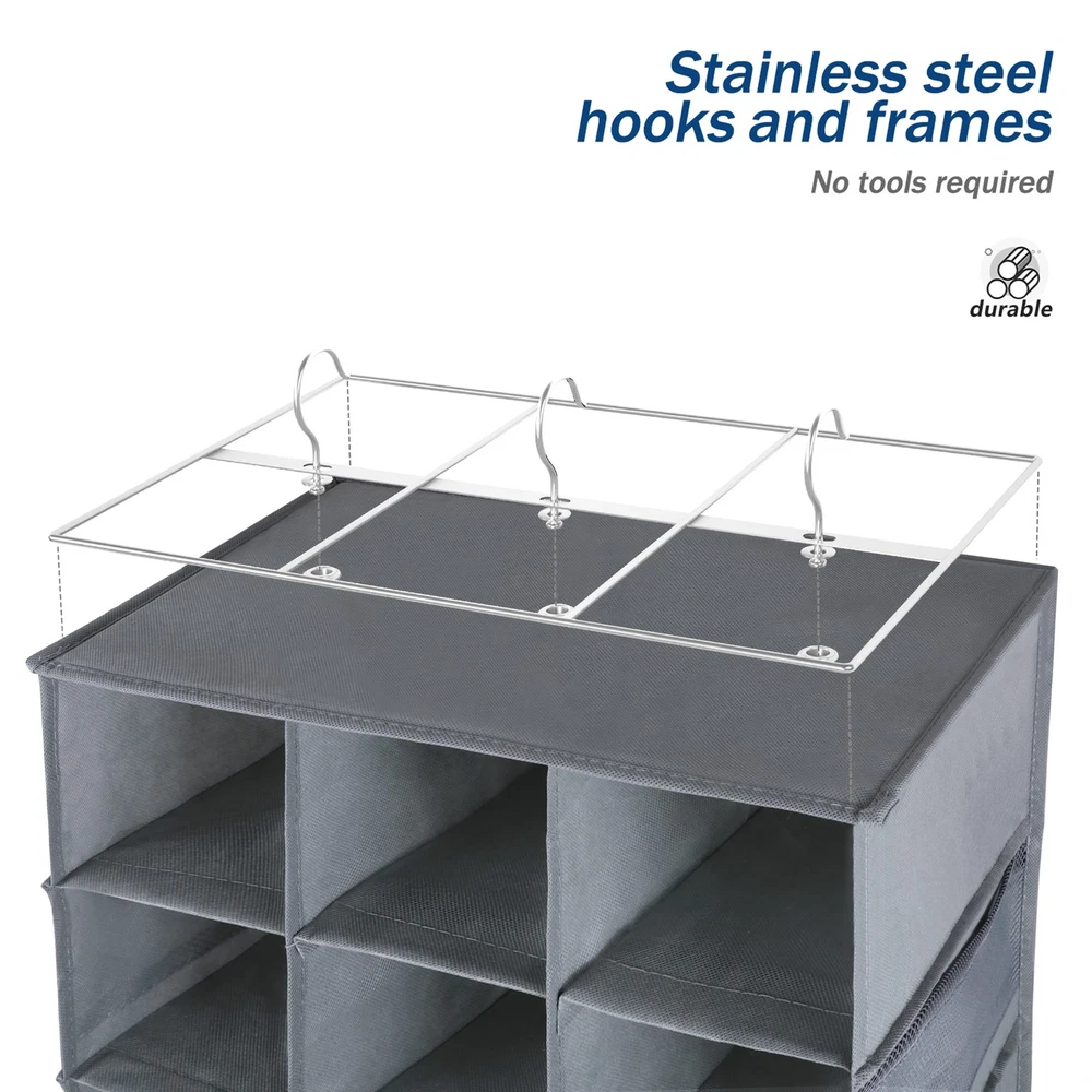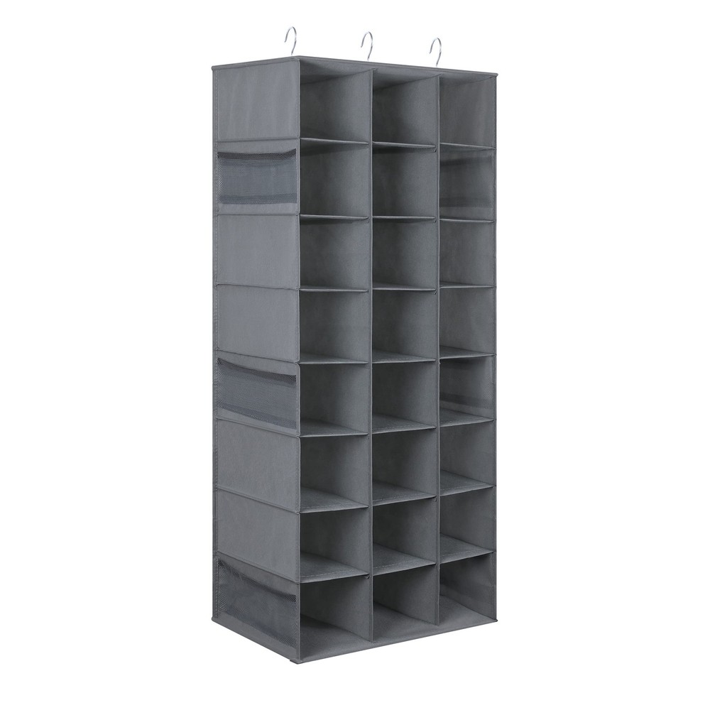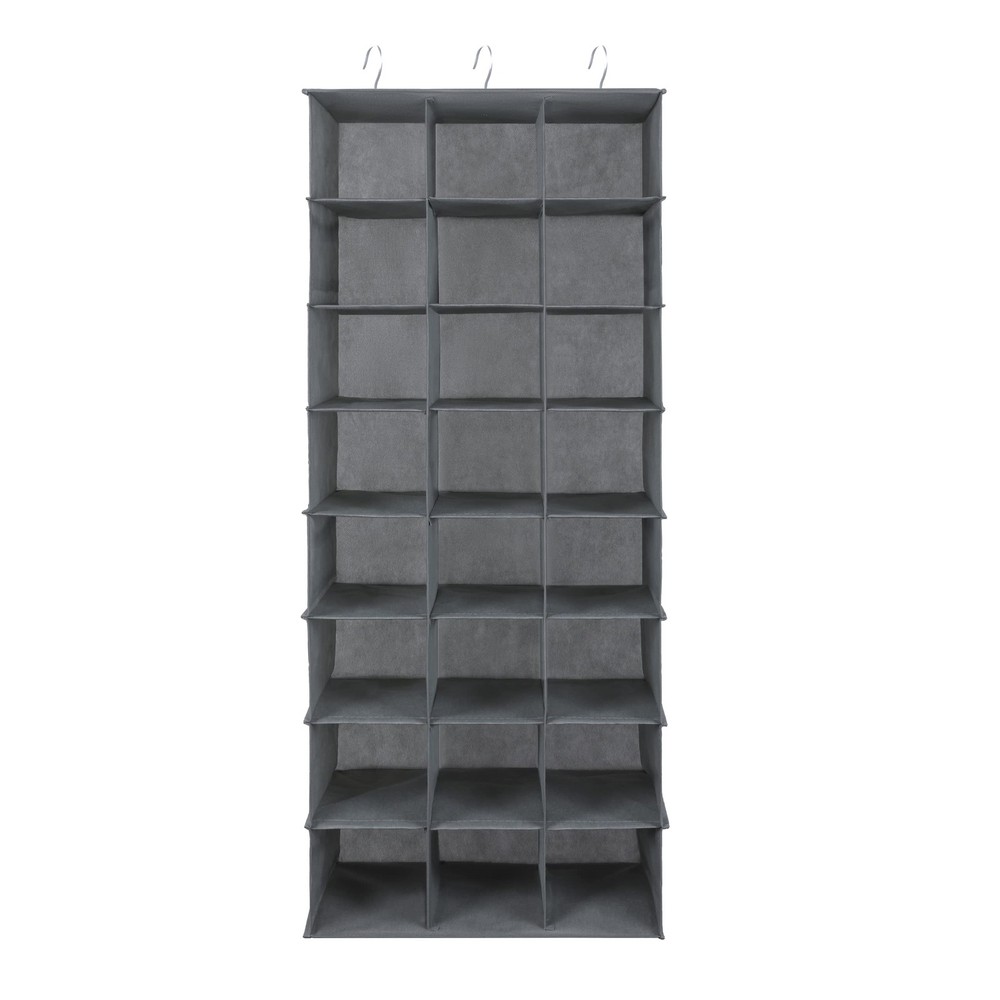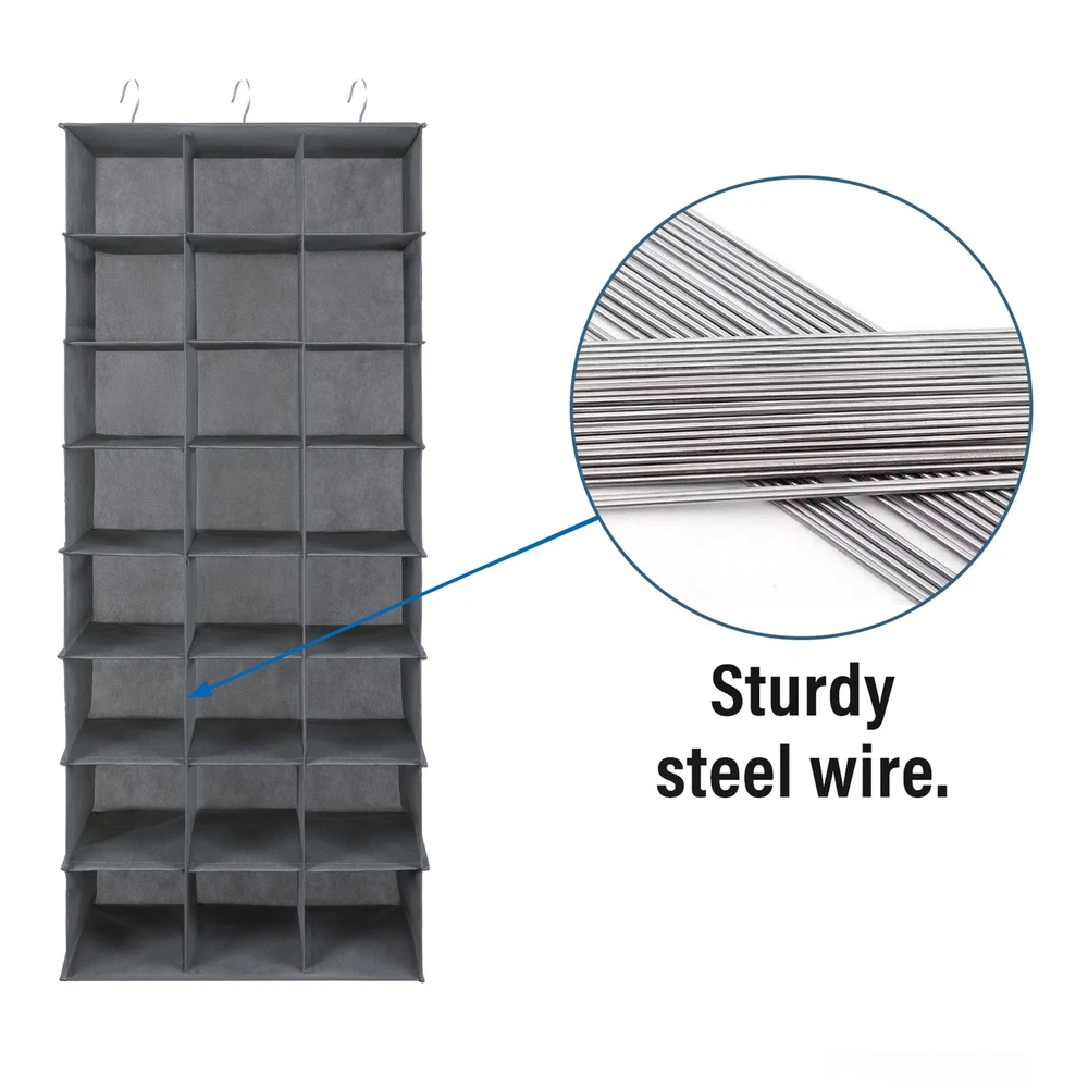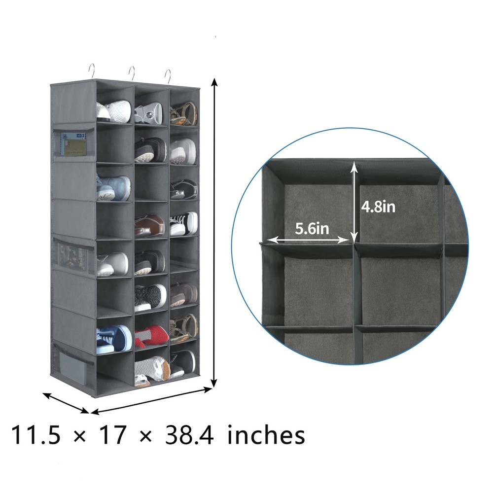 【24 Compartments for Hanging Shoe Storage】 With 24 slots, more than other closet shelf organizers, it can hold 24 pairs of regular shoes and has 6 mesh side pockets for additional storage of other small items without taking up extra floor space, helping you to eliminate the clutter in your room. 【Heavy-duty Shoe Organizer】 3 metal hooks and a sturdy steel shelf at the top ensure that the shoe closet organizers and storage supports its weight, and each shelf (including the top and bottom) is supported by steel wires that are tough to hold its shape and prevent sagging. 【Durable & Washable】 Made of durable professional seams and tear-resistant heavy-duty non-woven fabric, the foldable design makes the hanging shoe rack for closet easy to carry and simple to put away when not in use. No need to worry about leaving dirty marks on your shoes, just clean with a soft brush or damp cloth. 【Multifunctional Use】 The hanging shoe cubby storage can not only hold shoes but also socks, shawls, hats, towels, clothes, toys and documents, dorm room supplies, etc. Six mesh side pockets can store keys, wallets, hair clips, and other small accessories. Meet your different storage needs and keep your closet neat and organized. 【Quick Installation】This shoe hanger is easy to install, first combine the stainless steel hooks with the metal spacers, then hang it directly in the metal hole at the top of the shoe rack, the metal hooks can be hung directly on the closet rod or clothing rack, easy to hang in closets, lockers, shelves, camping, college dorms, and other places.