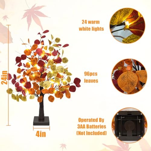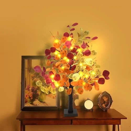 24in Artificial Fall Lighted Eucalyptus Tree with Timer, 24 LED Faux Fall 2ft