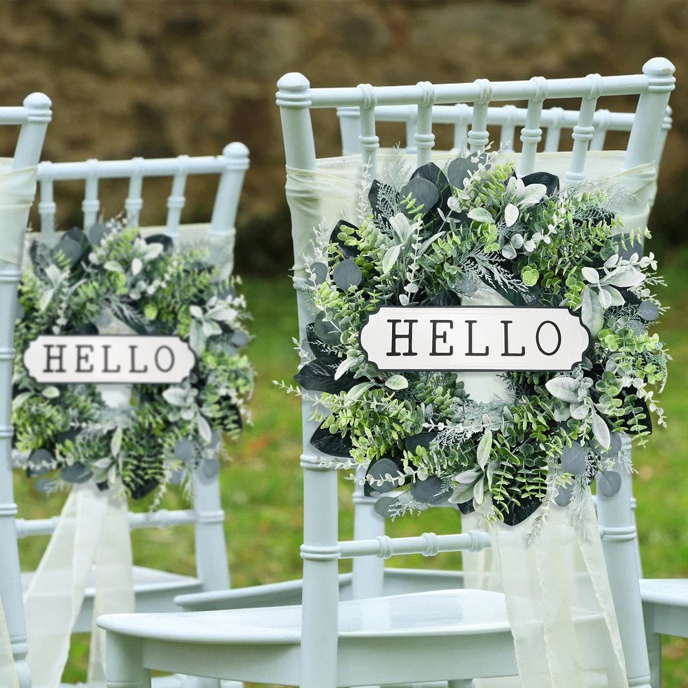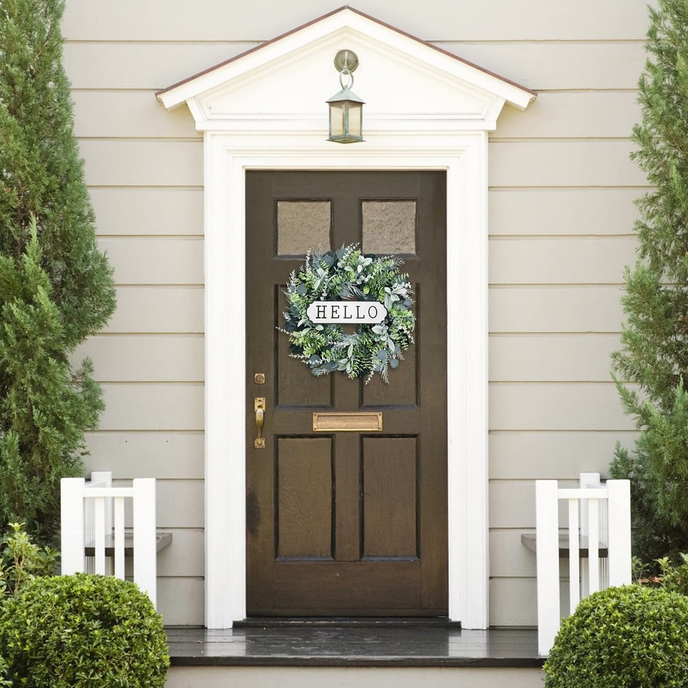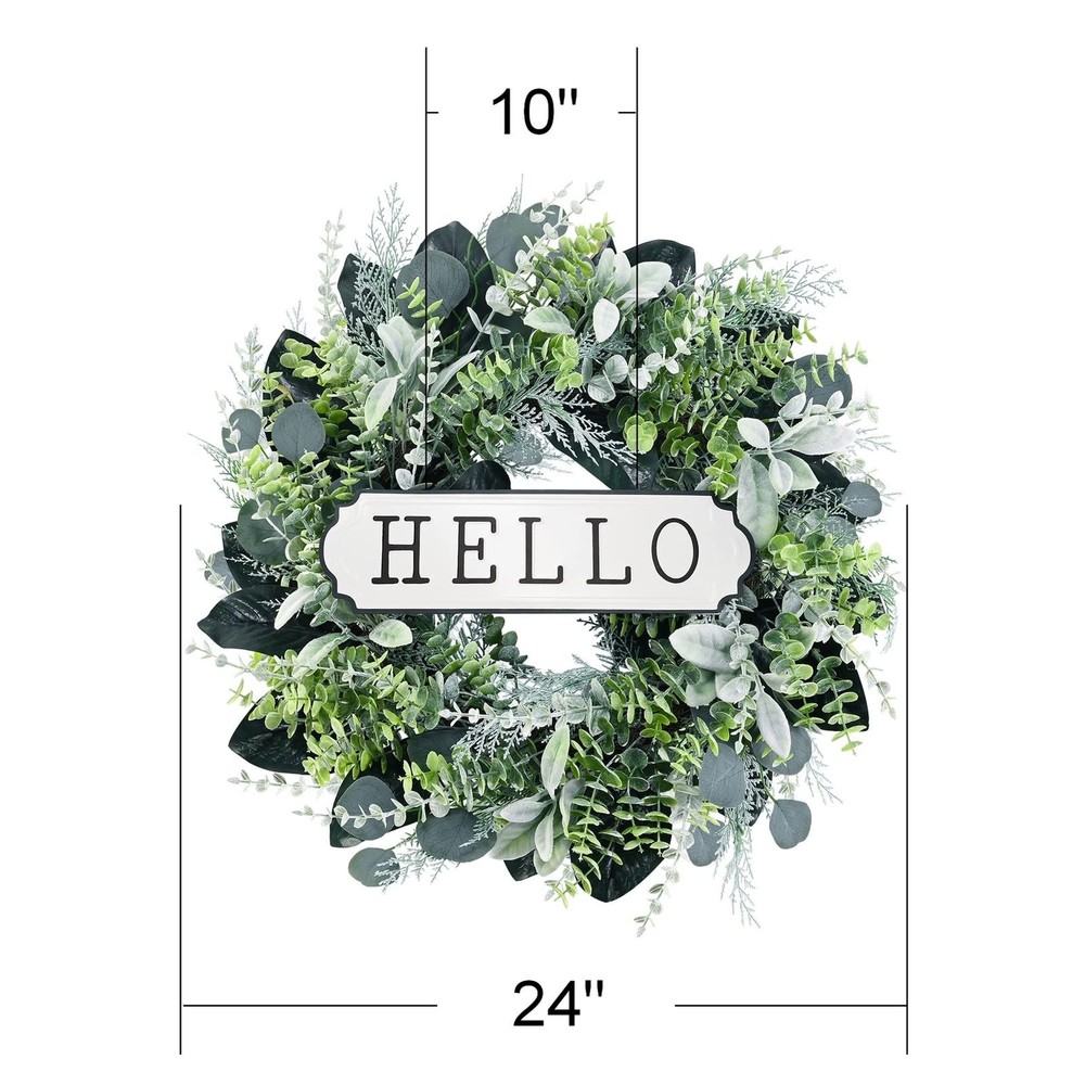 Front Door Wreath. The boxwood wreath works as indoor wreath, outdoor wreath, wedding wreath, welcome wreath, etc. It’s also suitable for sitting room, hotel, wedding scene, window, villa and wall decoration, photography background, etc. This Green wreath will bring an enjoyable ambiance all year round. Handmade Greenery Wreath. This artificial eucalyptus wreath for front door is made by hand. The eucalyptus leaves are made of silk cloth, and the boxwood, cypress, birch, lambs ear leaves are made of plastic. The back of the wreath is a natural grapevine wreath with built-in hook for easy hanging. The hello sign can be removed from the wreath. Spring Summer Wreath Size and Material. The front door wreath is 24'' and made from quality plastic and cloth, waterproof and UV protection, no maintenance, no trimming. Wipe clean with a soft damp cloth if needed. Works once you take it out of the box. You only need to adjust leaves to get a vivid appearance. Maintenance-Free. Artificial green leaves wreath always stays color and shape, and will look great for years to come. You can blow it with a hair dryer to make the wreath as bright as new. Suggest indoor use. If works outdoor, please try to avoid rain and snow. Note. Because the door wreath may be squeezed during transportation, they need to be re-shaped once removed from the box, to achieve their intended appearance and size. It is recommended to use after ventilation. Please don't hesitate to tell us if you have any concerns, and we will slove it in your favor.