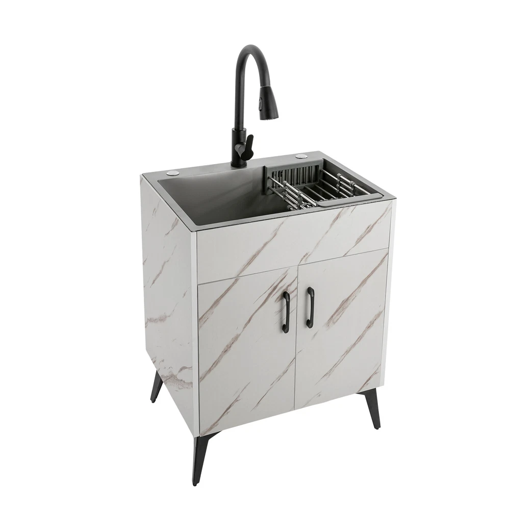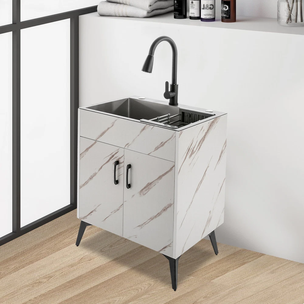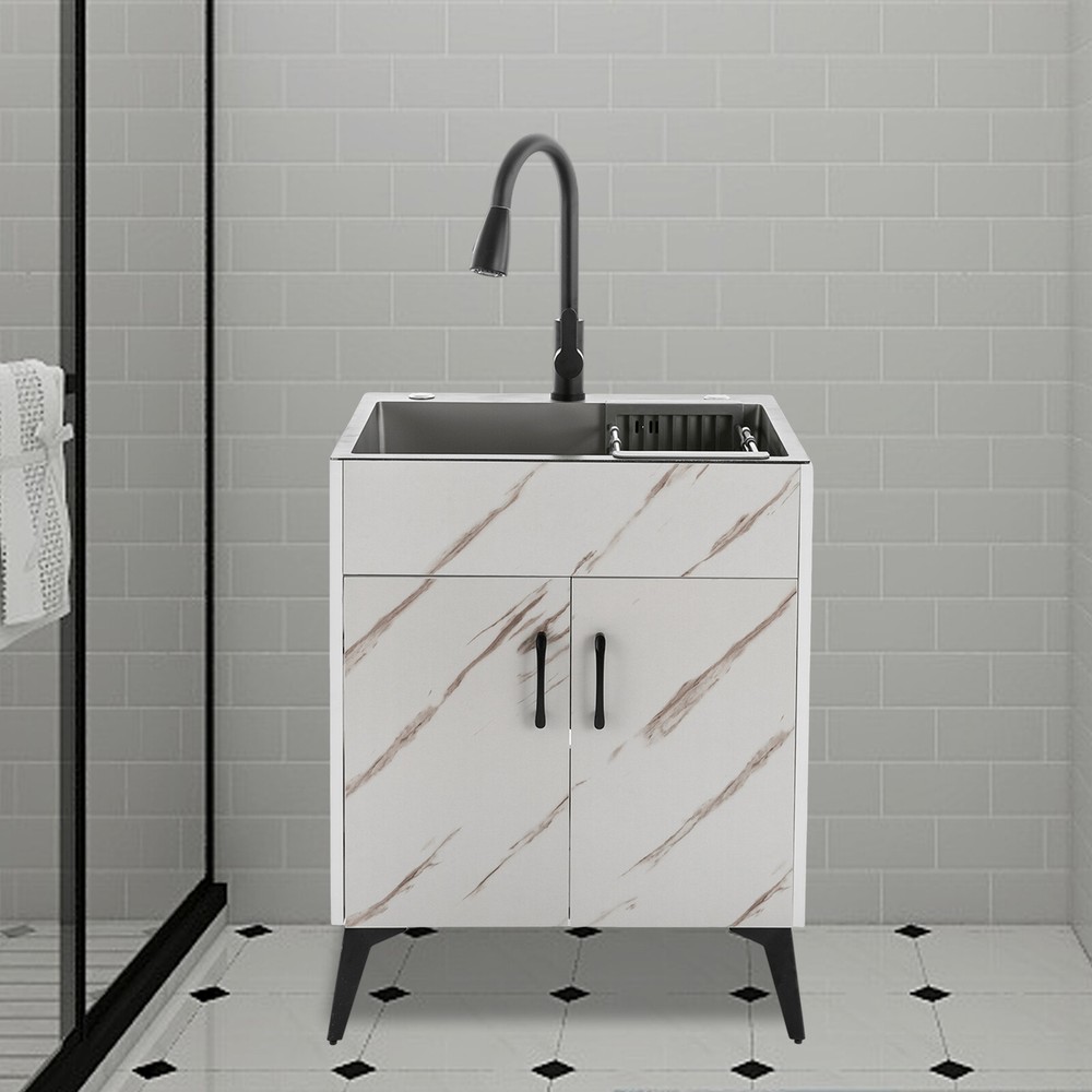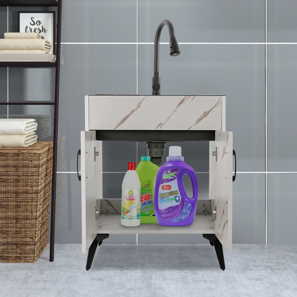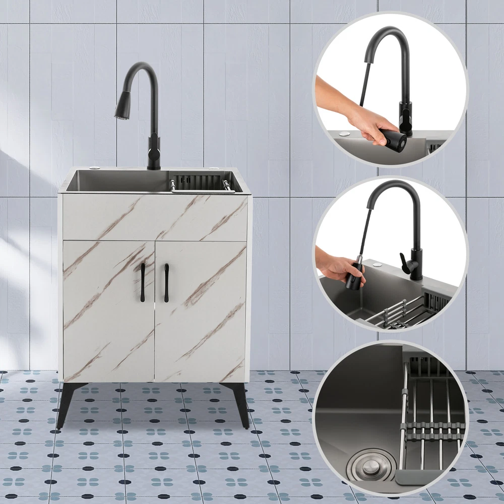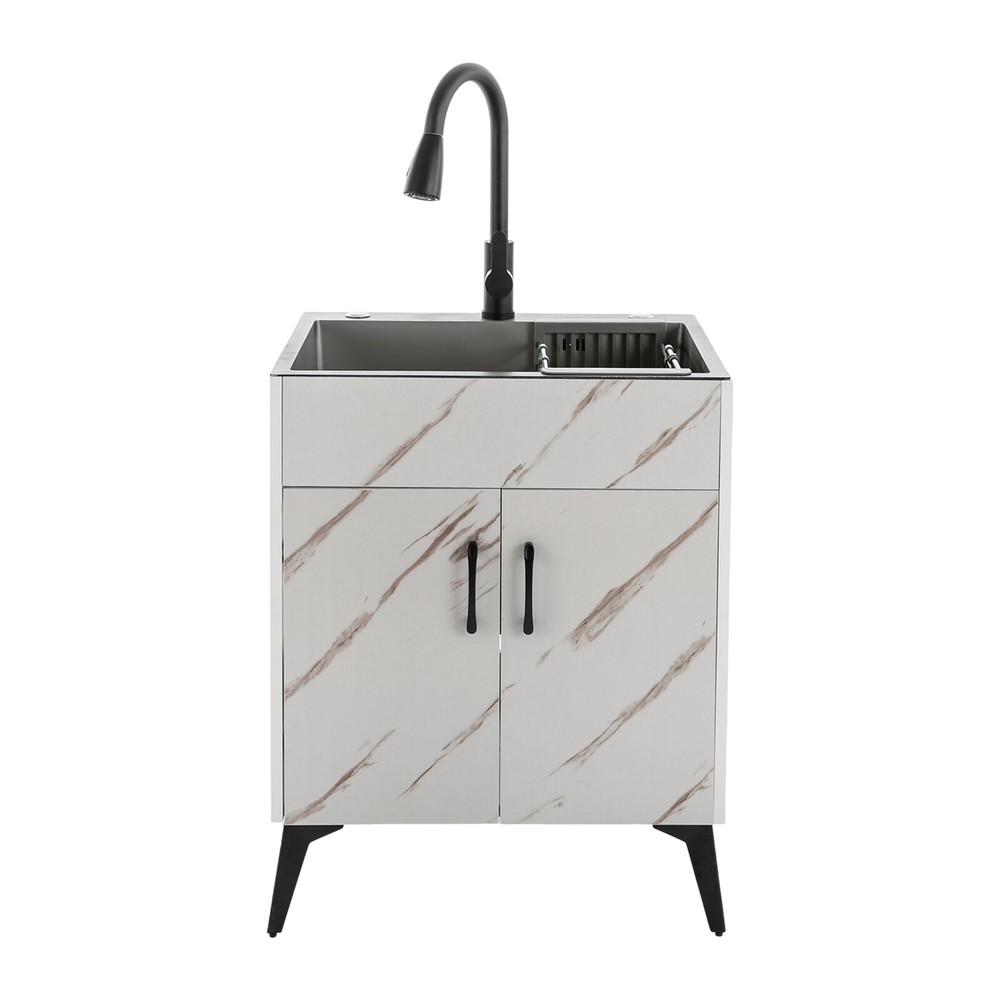 Description This sink with cabinet has a minimalist style and a beautiful appearance that is great for matching. It has a sturdy rectangular construction and a strong load-bearing capacity. The cabinet underneath also provides you with spacious storage space. The full set of accessories provides you with more comprehensive service, and the drain basket provides more convenience for you to clean your items. Come and pick one up! Key Features Sturdy and Durable: Stainless steel and bamboo scented panels and polishing, nano-coating, and glazed processes make this product odorless and resistant to deformation, water, corrosion, fade, rust, and wear. Thoughtful Design: The drainer with a lid makes it convenient for storing water. The cabinet door handles also make it easy for you to open and 24in White Laundry Utility Cabinet w/ Stainless Steel Sink and Faucet Combo Welcom to yiyibushe-4 24in White Laundry Utility Cabinet w/ Stainless Steel Sink and Faucet Combo ------------------??????------------------ Description This sink with cabinet has a minimalist style and a beautiful appearance that is great for matching. It has a sturdy rectangular construction and a strong load-bearing capacity. The cabinet underneath also provides you with spacious storage space. The full set of accessories provides you with more comprehensive service, and the drain basket provides more convenience for you to clean your items. Come and pick one up! ------------------??????------------------ Key Features Sturdy and Durable : Stainless steel and bamboo scented panels and polishing, nano-coating, and glazed processes make this product odorless and resistant to deformation, water, corrosion, fade, rust, and wear. Thoughtful Design : The drainer with a lid makes it convenient for storing water. The cabinet door handles also make it easy for you to open and close and access your items. The reserved holes on the sink facilitate the installation of a soap dispenser(not included). The sink has a thick soundproof pad at the bottom, which can minimize excess noise and prevent moisture accumulation. Multi-function Faucet : The pull-out faucet is 360° rotatable, allowing for convenient washing at different angles and positions. You can switch its spray and stream water modes through the button on the spout and adjust the water temperature and water volume with the single handle. Plenty of Space: The spacious sink (23.62*17.71*7.87in) can accommodate large bowls or dishes, which can meet daily washing needs without afraid of water splashing. The cabinet under the sink also provides ample storage space to conveniently store laundry detergent, soap, and other items while allowing for easy access to them when needed. Fast Drainage: The drainer adopts a dual filtration design. The coarse filter can intercept large garbage such as bones and vegetable leaves, while the fine filter can intercept small garbage such as minced meat and vegetable residue, so that the residue does not enter the drainage pipe or affect the drainage speed. Moreover, the V-drain pipe and enlarged drain opening ensure fast drainage and prevent odor spillage. Strong Bearing Capacity : High-quality material, rectangular structure, and thickened panels make the product support up to 220.5 lbs, so you can rest assured to use it without worrying about collapsing. Complete Set : The combination of a sink and a range of accessories meets your needs in one go and is easy to install. In addition, we offer you a draining basket to facilitate the draining of your dishes and allow for convenient fruit washing. Easy to Clean : The rounded corner is hard to hide dirt, together with the smooth surface and simple structure, you can rinse the sink with clean water. Customer Service : We aim to provide quality products and services. If you have any problems, please feel free to contact us. We will reply and solve the problem for you as soon as possible. ------------------??????------------------ Details Overflow Holes : The design of the high overflow holes prevents water from overflowing due to forgetting to turn off the faucet, and protects a dry floor. Seal Ring : It ensures a tight connection and prevents leakage. X-Deflector Line : The X-shaped traction guide water line can effectively drain water, avoid water accumulation inside the sink, and prevent bacterial growth. Stable Support Feet: They can stably support this product without sliding and raise the bottom to facilitate ventilation and floor cleaning. ------------------??????------------------ Application It can be widely used in homes, kitchens, backyards, garages, balconies, laundry rooms, restaurants, hotels, cafes, utility rooms, workshops, art studios, basements, RVs, vacation cabins, and more. It's ideal for cleaning paintbrushes, washing kitchen utensils, bathing puppies, or removing mud from trousers. ------------------??????------------------ Specifications Color: White Style: Modern Shape: ‎Rectangular Material: Stainless Steel, Bamboo Scented Panel, Rubber, Surface Treatment: Polishing, Nano, Glazed Installation Type: ‎Freestanding Assembly Required: Yes Drain Outlet Diameter: 4.2cm/1.65in Drainage Pipe Length: 60cm/23.62in Water Inlet Pipe Length: 60cm/23.62in Bearing Capacity: 100kg/220.5lbs Sink Size: 60*45*20cm/23.62*17.71*7.87in Cabinet Size: 60*45*77cm/23.62*17.71*30.31in Overall Product Height: 1.17m/3.83ft Sink, Faucet, and Accessories: Gross Weight: 15.1kg/33.3lbs Package Size: 80*54*16cm/31.5*21.3*6.3inc Cabinet: Gross Weight: 7.8kg/17.2lbs Package Size: 70*51*26cm/27.6*20.1*10.2in Package Included 1*Sink 1*Faucet 1*Drainer 2*Water Inlet Pipes 2*Drainage Pipes 1*Drain Basket 1*Cabinet 1*Chinese Installation Instruction All Accessories for Assembly Notes Please check the size carefully before ordering. Please do not scratch its surface with sharp objects for a longer service life. We ship the sink separately from the sink cabinet and accessories to protect the product from damage during ship