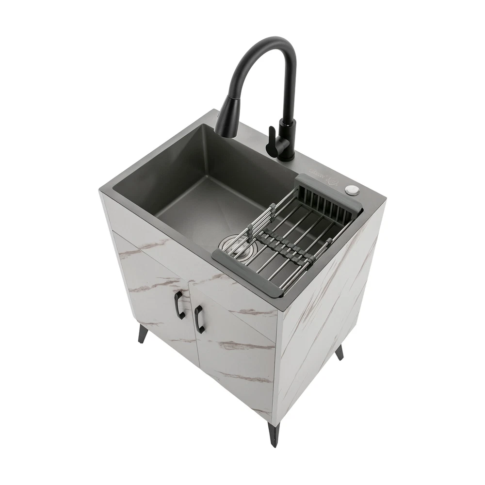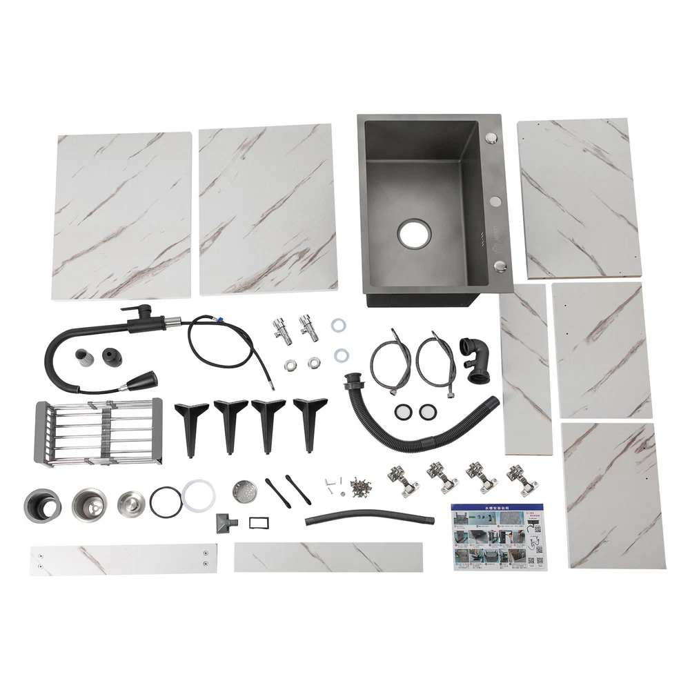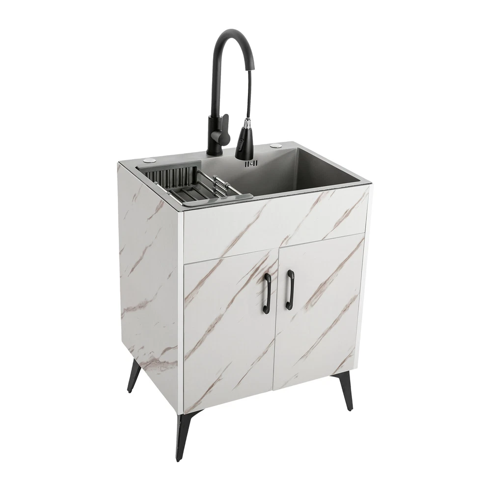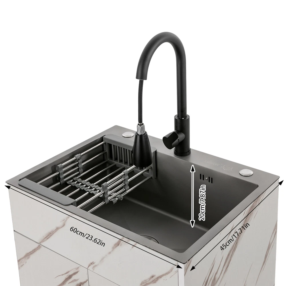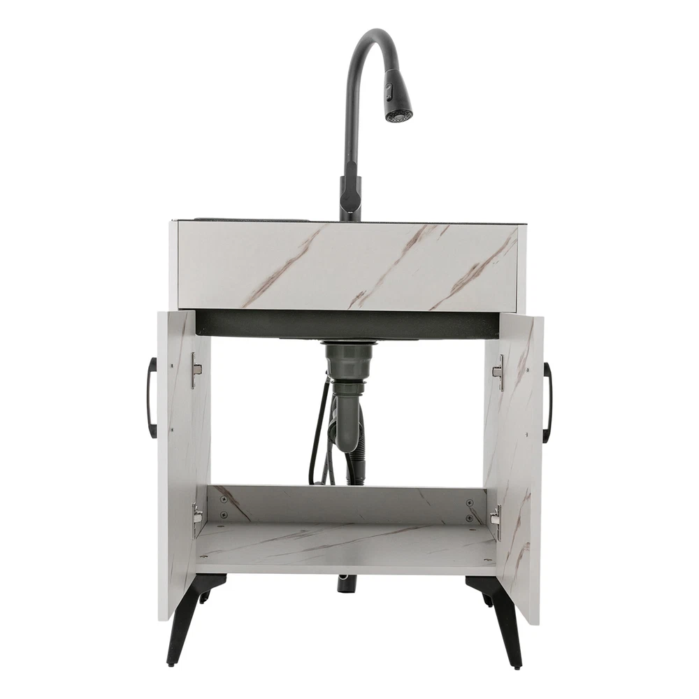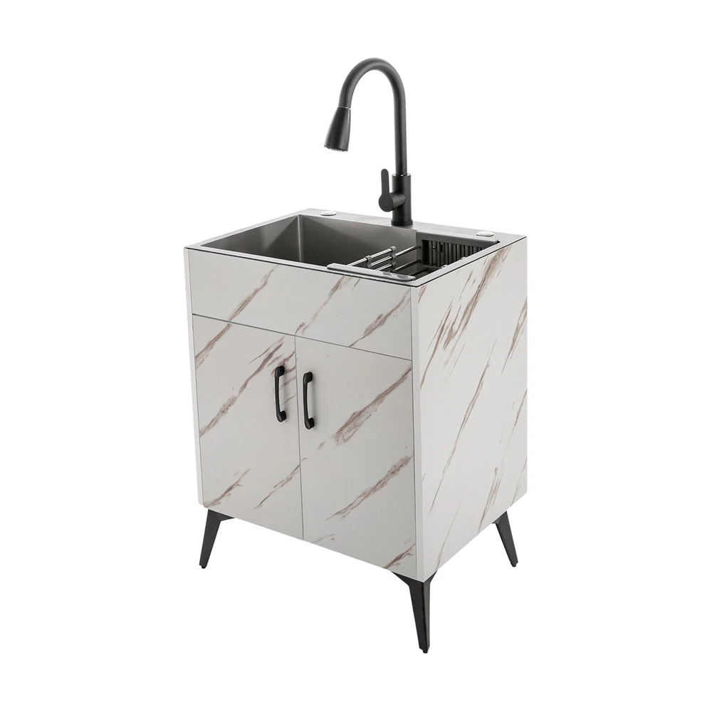 Description This sink with cabinet has a minimalist style and a beautiful appearance that is great for matching. It has a sturdy rectangular construction and a strong load-bearing capacity. The cabinet underneath also provides you with spacious storage space. The full set of accessories provides you with more comprehensive service, and the drain basket provides more convenience for you to clean your items. Come and pick one up! Key Features Sturdy and Durable: Stainless steel and bamboo scented panels and polishing, nano-coating, and glazed processes make this product odorless and resistant to deformation, water, corrosion, fade, rust, and wear. Thoughtful Design: The drainer with a lid makes it convenient for storing water. The cabinet door handles also make it easy for you to open and 24in White Laundry Utility Cabinet w/ Stainless Steel Sink and Faucet Combo Welcom to yiyibushe-4 24in White Laundry Utility Cabinet w/ Stainless Steel Sink and Faucet Combo ------------------??????------------------ Description This sink with cabinet has a minimalist style and a beautiful appearance that is great for matching. It has a sturdy rectangular construction and a strong load-bearing capacity. The cabinet underneath also provides you with spacious storage space. The full set of accessories provides you with more comprehensive service, and the drain basket provides more convenience for you to clean your items. Come and pick one up! ------------------??????------------------ Key Features Sturdy and Durable : Stainless steel and bamboo scented panels and polishing, nano-coating, and glazed processes make this product odorless and resistant to deformation, water, corrosion, fade, rust, and wear. Thoughtful Design : The drainer with a lid makes it convenient for storing water. The cabinet door handles also make it easy for you to open and close and access your items. The reserved holes on the sink facilitate the installation of a soap dispenser(not included). The sink has a thick soundproof pad at the bottom, which can minimize excess noise and prevent moisture accumulation. Multi-function Faucet : The pull-out faucet is 360° rotatable, allowing for convenient washing at different angles and positions. You can switch its spray and stream water modes through the button on the spout and adjust the water temperature and water volume with the single handle. Plenty of Space: The spacious sink (23.62*17.71*7.87in) can accommodate large bowls or dishes, which can meet daily washing needs without afraid of water splashing. The cabinet under the sink also provides ample storage space to conveniently store laundry detergent, soap, and other items while allowing for easy access to them when needed. Fast Drainage: The drainer adopts a dual filtration design. The coarse filter can intercept large garbage such as bones and vegetable leaves, while the fine filter can intercept small garbage such as minced meat and vegetable residue, so that the residue does not enter the drainage pipe or affect the drainage speed. Moreover, the V-drain pipe and enlarged drain opening ensure fast drainage and prevent odor spillage. Strong Bearing Capacity : High-quality material, rectangular structure, and thickened panels make the product support up to 220.5 lbs, so you can rest assured to use it without worrying about collapsing. Complete Set : The combination of a sink and a range of accessories meets your needs in one go and is easy to install. In addition, we offer you a draining basket to facilitate the draining of your dishes and allow for convenient fruit washing. Easy to Clean : The rounded corner is hard to hide dirt, together with the smooth surface and simple structure, you can rinse the sink with clean water. Customer Service : We aim to provide quality products and services. If you have any problems, please feel free to contact us. We will reply and solve the problem for you as soon as possible. ------------------??????------------------ Details Overflow Holes : The design of the high overflow holes prevents water from overflowing due to forgetting to turn off the faucet, and protects a dry floor. Seal Ring : It ensures a tight connection and prevents leakage. X-Deflector Line : The X-shaped traction guide water line can effectively drain water, avoid water accumulation inside the sink, and prevent bacterial growth. Stable Support Feet: They can stably support this product without sliding and raise the bottom to facilitate ventilation and floor cleaning. ------------------??????------------------ Application It can be widely used in homes, kitchens, backyards, garages, balconies, laundry rooms, restaurants, hotels, cafes, utility rooms, workshops, art studios, basements, RVs, vacation cabins, and more. It's ideal for cleaning paintbrushes, washing kitchen utensils, bathing puppies, or removing mud from trousers. ------------------??????------------------ Specifications Color: White Style: Modern Shape: ‎Rectangular Material: Stainless Steel, Bamboo Scented Panel, Rubber, Surface Treatment: Polishing, Nano, Glazed Installation Type: ‎Freestanding Assembly Required: Yes Drain Outlet Diameter: 4.2cm/1.65in Drainage Pipe Length: 60cm/23.62in Water Inlet Pipe Length: 60cm/23.62in Bearing Capacity: 100kg/220.5lbs Sink Size: 60*45*20cm/23.62*17.71*7.87in Cabinet Size: 60*45*77cm/23.62*17.71*30.31in Overall Product Height: 1.17m/3.83ft Sink, Faucet, and Accessories: Gross Weight: 15.1kg/33.3lbs Package Size: 80*54*16cm/31.5*21.3*6.3inc Cabinet: Gross Weight: 7.8kg/17.2lbs Package Size: 70*51*26cm/27.6*20.1*10.2in Package Included 1*Sink 1*Faucet 1*Drainer 2*Water Inlet Pipes 2*Drainage Pipes 1*Drain Basket 1*Cabinet 1*Chinese Installation Instruction All Accessories for Assembly Notes Please check the size carefully before ordering. Please do not scratch its surface with sharp objects for a longer service life. We ship the sink separately from the sink cabinet and accessories to protect the product from damage during ship