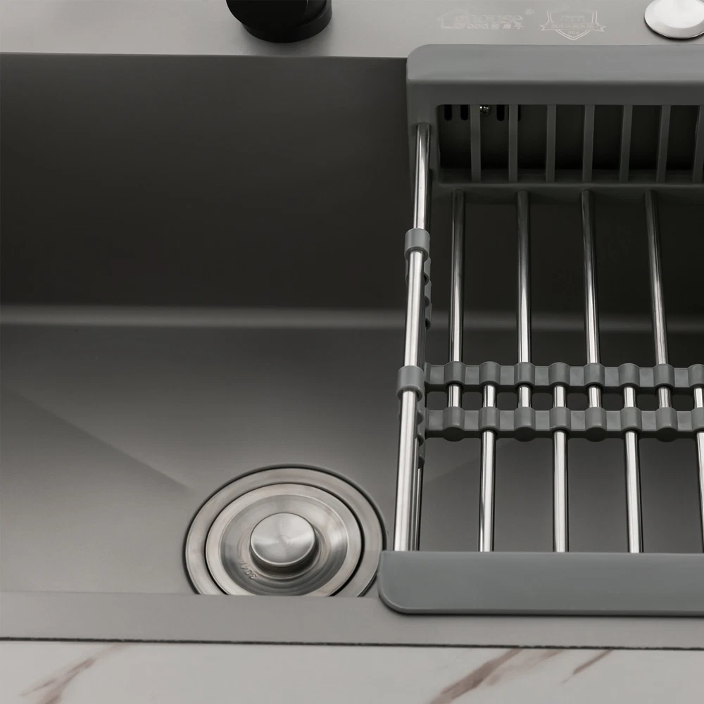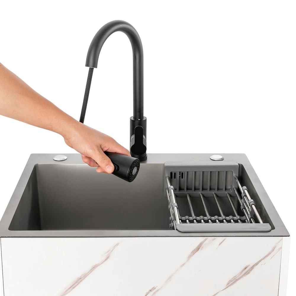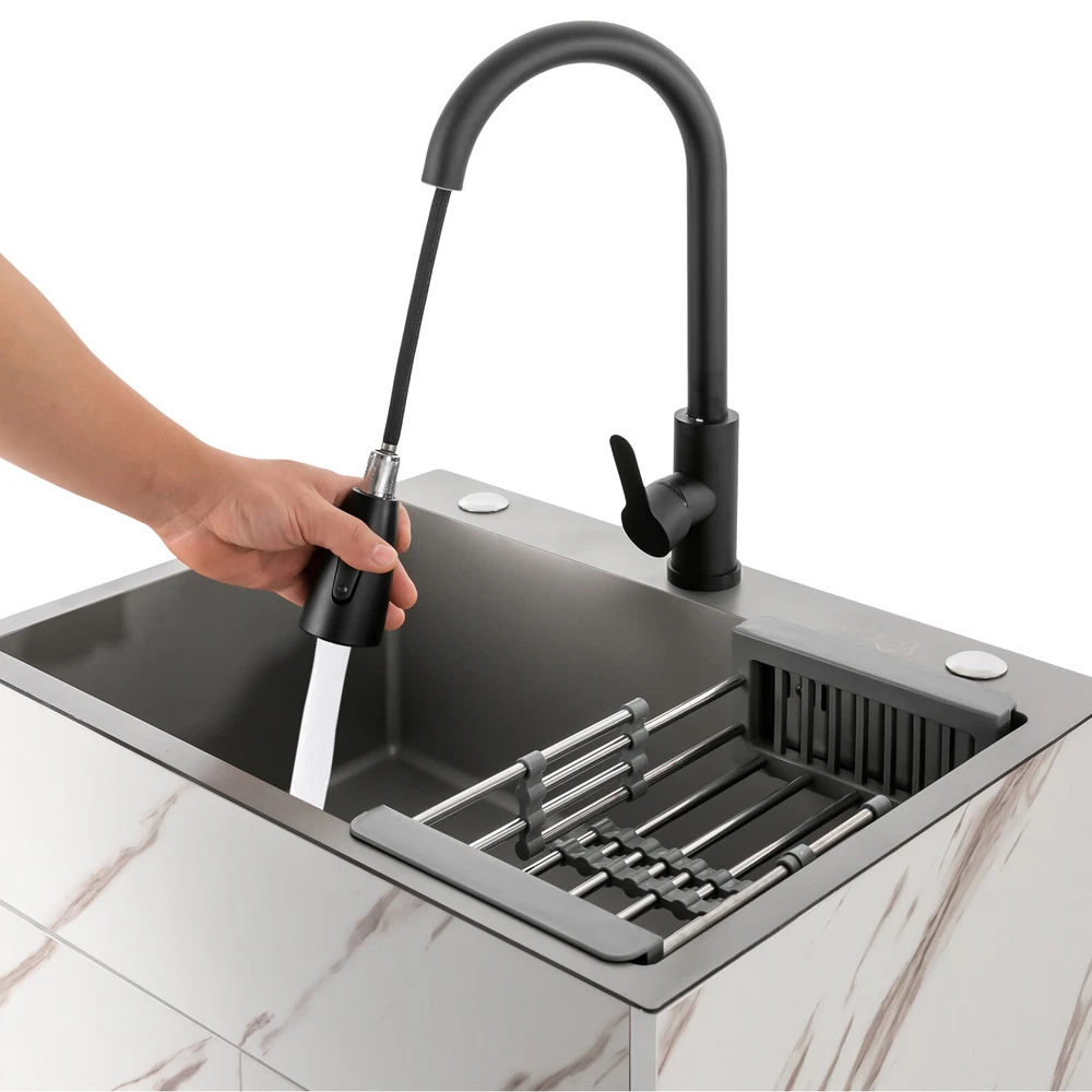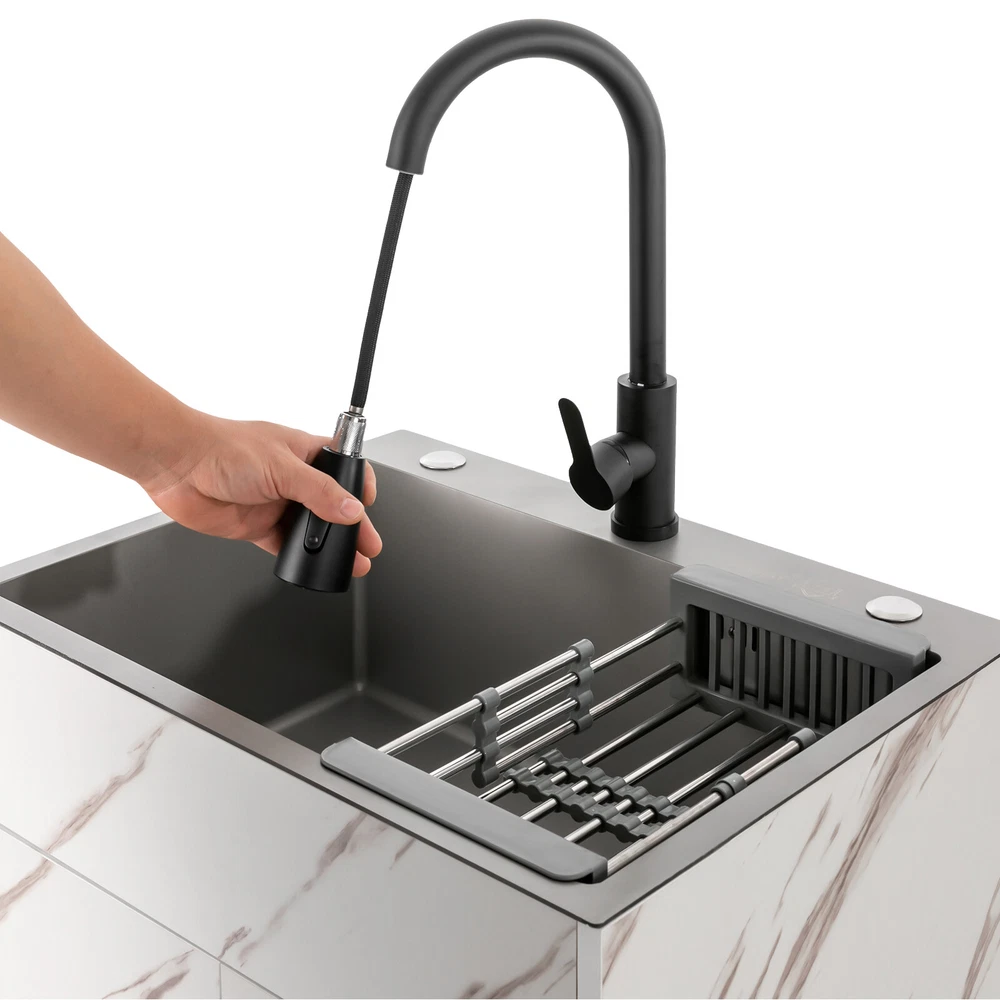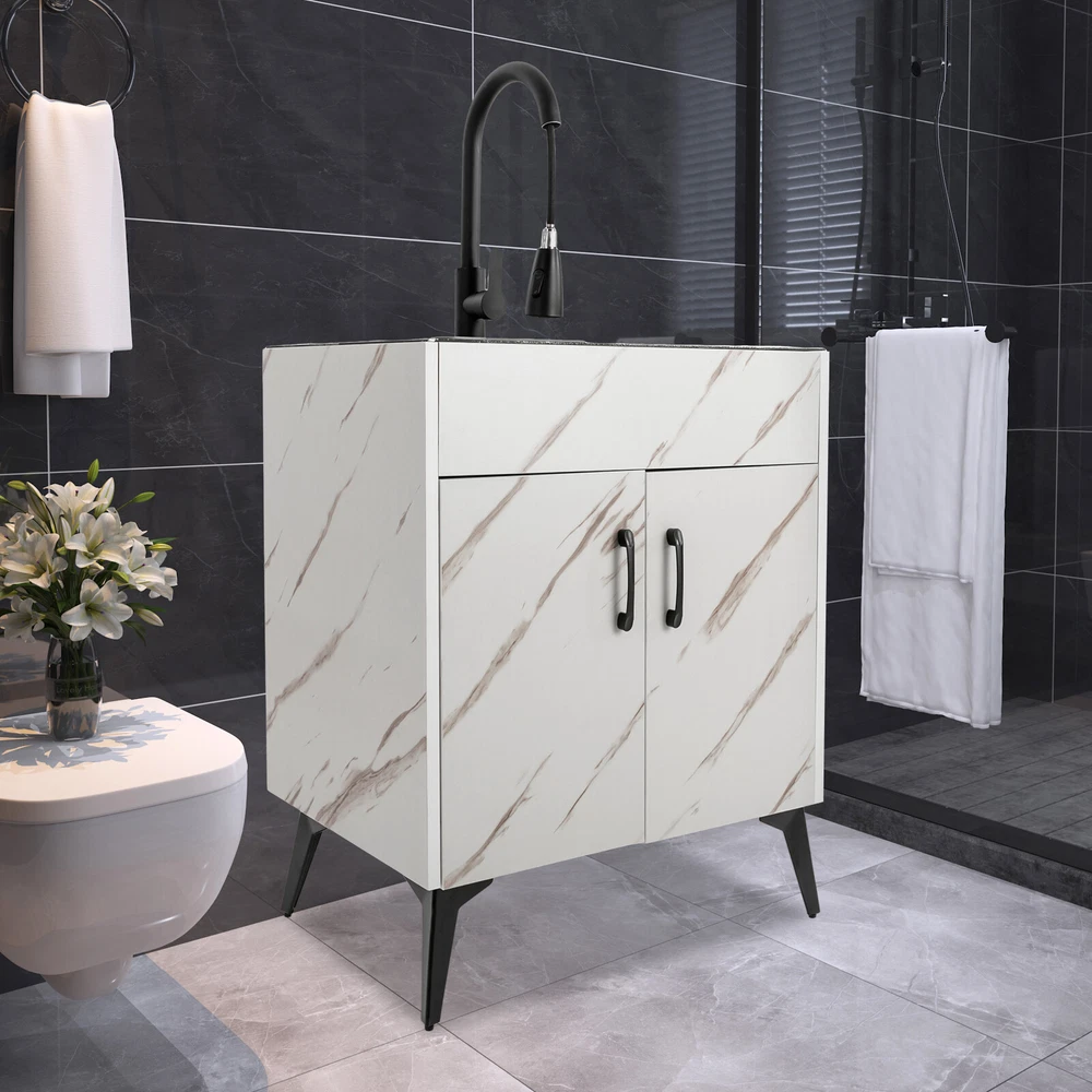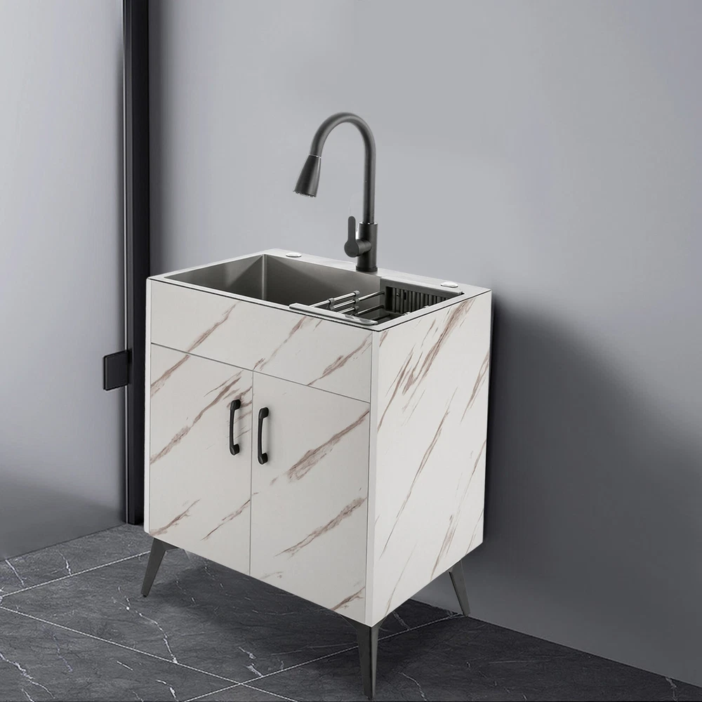 Description This sink with cabinet has a minimalist style and a beautiful appearance that is great for matching. It has a sturdy rectangular construction and a strong load-bearing capacity. The cabinet underneath also provides you with spacious storage space. The full set of accessories provides you with more comprehensive service, and the drain basket provides more convenience for you to clean your items. Come and pick one up! Key Features Sturdy and Durable: Stainless steel and bamboo scented panels and polishing, nano-coating, and glazed processes make this product odorless and resistant to deformation, water, corrosion, fade, rust, and wear. Thoughtful Design: The drainer with a lid makes it convenient for storing water. The cabinet door handles also make it easy for you to open and 24in White Laundry Utility Cabinet w/ Stainless Steel Sink and Faucet Combo Welcom to yiyibushe-4 24in White Laundry Utility Cabinet w/ Stainless Steel Sink and Faucet Combo ------------------??????------------------ Description This sink with cabinet has a minimalist style and a beautiful appearance that is great for matching. It has a sturdy rectangular construction and a strong load-bearing capacity. The cabinet underneath also provides you with spacious storage space. The full set of accessories provides you with more comprehensive service, and the drain basket provides more convenience for you to clean your items. Come and pick one up! ------------------??????------------------ Key Features Sturdy and Durable : Stainless steel and bamboo scented panels and polishing, nano-coating, and glazed processes make this product odorless and resistant to deformation, water, corrosion, fade, rust, and wear. Thoughtful Design : The drainer with a lid makes it convenient for storing water. The cabinet door handles also make it easy for you to open and close and access your items. The reserved holes on the sink facilitate the installation of a soap dispenser(not included). The sink has a thick soundproof pad at the bottom, which can minimize excess noise and prevent moisture accumulation. Multi-function Faucet : The pull-out faucet is 360° rotatable, allowing for convenient washing at different angles and positions. You can switch its spray and stream water modes through the button on the spout and adjust the water temperature and water volume with the single handle. Plenty of Space: The spacious sink (23.62*17.71*7.87in) can accommodate large bowls or dishes, which can meet daily washing needs without afraid of water splashing. The cabinet under the sink also provides ample storage space to conveniently store laundry detergent, soap, and other items while allowing for easy access to them when needed. Fast Drainage: The drainer adopts a dual filtration design. The coarse filter can intercept large garbage such as bones and vegetable leaves, while the fine filter can intercept small garbage such as minced meat and vegetable residue, so that the residue does not enter the drainage pipe or affect the drainage speed. Moreover, the V-drain pipe and enlarged drain opening ensure fast drainage and prevent odor spillage. Strong Bearing Capacity : High-quality material, rectangular structure, and thickened panels make the product support up to 220.5 lbs, so you can rest assured to use it without worrying about collapsing. Complete Set : The combination of a sink and a range of accessories meets your needs in one go and is easy to install. In addition, we offer you a draining basket to facilitate the draining of your dishes and allow for convenient fruit washing. Easy to Clean : The rounded corner is hard to hide dirt, together with the smooth surface and simple structure, you can rinse the sink with clean water. Customer Service : We aim to provide quality products and services. If you have any problems, please feel free to contact us. We will reply and solve the problem for you as soon as possible. ------------------??????------------------ Details Overflow Holes : The design of the high overflow holes prevents water from overflowing due to forgetting to turn off the faucet, and protects a dry floor. Seal Ring : It ensures a tight connection and prevents leakage. X-Deflector Line : The X-shaped traction guide water line can effectively drain water, avoid water accumulation inside the sink, and prevent bacterial growth. Stable Support Feet: They can stably support this product without sliding and raise the bottom to facilitate ventilation and floor cleaning. ------------------??????------------------ Application It can be widely used in homes, kitchens, backyards, garages, balconies, laundry rooms, restaurants, hotels, cafes, utility rooms, workshops, art studios, basements, RVs, vacation cabins, and more. It's ideal for cleaning paintbrushes, washing kitchen utensils, bathing puppies, or removing mud from trousers. ------------------??????------------------ Specifications Color: White Style: Modern Shape: ‎Rectangular Material: Stainless Steel, Bamboo Scented Panel, Rubber, Surface Treatment: Polishing, Nano, Glazed Installation Type: ‎Freestanding Assembly Required: Yes Drain Outlet Diameter: 4.2cm/1.65in Drainage Pipe Length: 60cm/23.62in Water Inlet Pipe Length: 60cm/23.62in Bearing Capacity: 100kg/220.5lbs Sink Size: 60*45*20cm/23.62*17.71*7.87in Cabinet Size: 60*45*77cm/23.62*17.71*30.31in Overall Product Height: 1.17m/3.83ft Sink, Faucet, and Accessories: Gross Weight: 15.1kg/33.3lbs Package Size: 80*54*16cm/31.5*21.3*6.3inc Cabinet: Gross Weight: 7.8kg/17.2lbs Package Size: 70*51*26cm/27.6*20.1*10.2in Package Included 1*Sink 1*Faucet 1*Drainer 2*Water Inlet Pipes 2*Drainage Pipes 1*Drain Basket 1*Cabinet 1*Chinese Installation Instruction All Accessories for Assembly Notes Please check the size carefully before ordering. Please do not scratch its surface with sharp objects for a longer service life. We ship the sink separately from the sink cabinet and accessories to protect the product from damage during ship