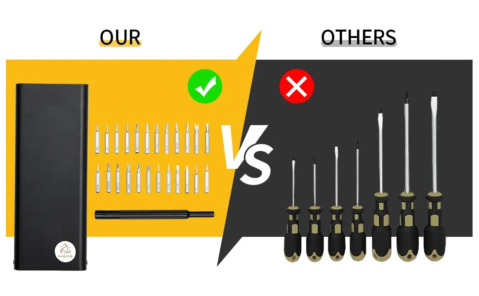 [Magnetic Design]The magnetic screwdriver bits bring convenience and wonderful user experience. Much easier to catch and hold screws. Not easy to slip. [High Hardness & Anti-rust]screwdriver bits made of S2 steel.S2 steel has high hardness, high torque, high abrasion resistance, good toughness so it is ultra-durable. [Aluminum Handle & Case]Aluminum handle with anodic oxidation process and special anti-slip matte surface treatment. Material: S2 alloy steel Size: 66x16x167mm .Nice driver handle, and a wide range of useful bits. .The kit items are stored in a very rugged aluminum storage case, and the bits are secured from chaos with little magnets that assure each stays in its intended storage slot. .The set consists of a very nice aluminum handle and screwdriver bits. .The bits are claimed to be chrome vanadium steel.