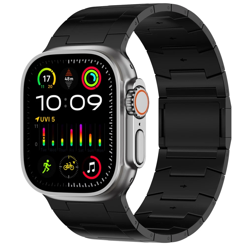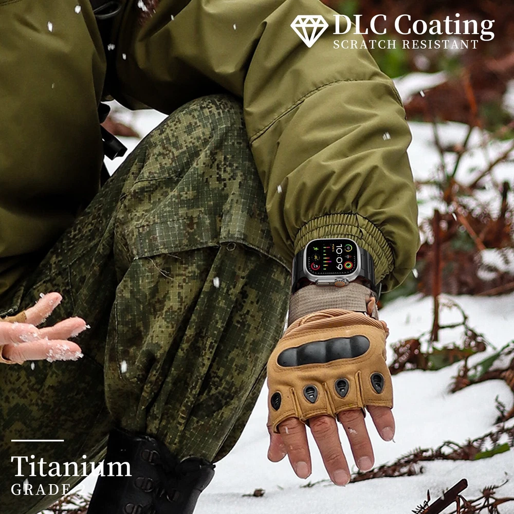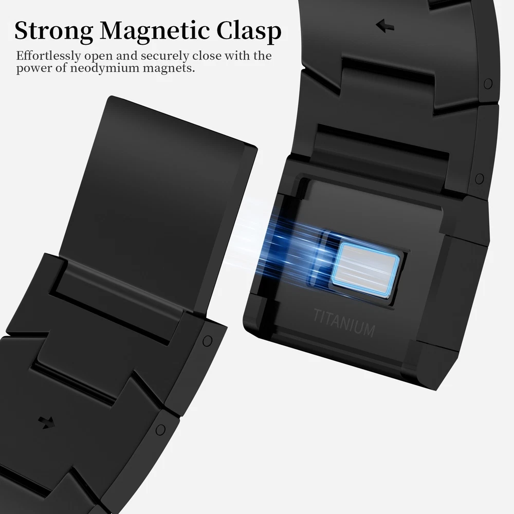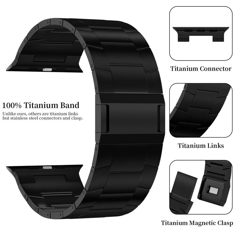 Specification Color Black Special Features Full titanium;DLC Coating Compatibility For Apple Watch Ultra 49mm / Series 10 46mm / Series 9 8 7 45mm / Series 6 5 4 SE2 SE 44mm Clasp Titanium Magnetic Clasp Connector Titanium Connector Titanium Grade Titanium Grade 2 Herring 800+HV Band Width 24mm Band Weight 61g(max) Band Thickness 2.8mm Band Length 210mm Clasp Thickness 5.5mm Wrist Size 170mm to 234mm Feature Lightweight;Corrosion-Resistant;Anti-Allergy Included Components Titanium watch band Warn tips: If you have specific requirements on packaging and components such as minor adjustment links、removal tool、tool pins and instruction, please contact online customer service. Product Description Full Titanium Band VS Titanium Band: All components include links, magnetic clasp, and connectors are crafted from Grade2 titanium, setting our bands apart from others with clasps and connectors made of non-titanium material 24MM Wider Design: The wider watch band best fits the Ultra. Design for any bold soul. Compatible with Apple Watch Ultra 49mm / Ultra 2 49mm / Series 10 46mm / Series 9 8 7 45mm / Series 6 SE 5 4 44mm. Fit wrist size 6.7" to 9.2"(170 to 234mm). We provide a minor adjustment link to adjust the band to fit for your wrist accurately Lightweight and Corrosion-Resistant: 61g(max). Experience the extraordinary benefits of full titanium - our titanium bands are not only lighter but also more corrosion-resistant than non-full titanium alternatives. Dive into the ocean or pool without worry, as our bands are built to withstand various environments Titanium Connectors: CNC high precision craftsmanship and unique titanium connectors ensure a tight and stable connection with original watch interface. Make sure your watch band stays securely attached, providing a seamless and comfortable fit Titanium Magnetic Buckle & Hook and Loop Closure: Sensitive skin? No problem. Our titanium magnetic buckle is an excellent choice, offering comfort without compromising style. Say goodbye to allergies associated with non-full titanium watch bands. Ensuring your watch band is comfortable to wear all day long. Magnetic buckle & hook and loop closure lock your watch easily and securely DLC (Diamond-Like Carbon): Our aerospace-grade titanium bands are not only a perfect match in material and color for the original watch, but also The DLC coating gives it extra scratch prevention, durability and protection, far higher wear resistance than non DLC