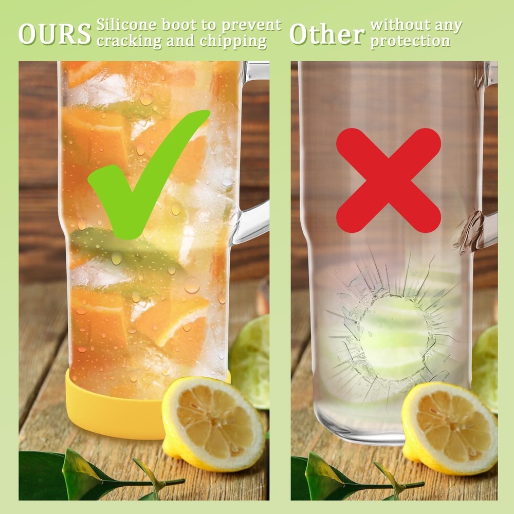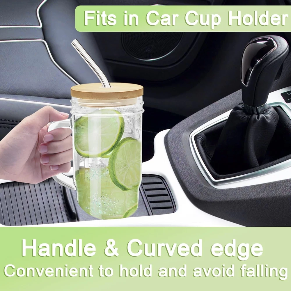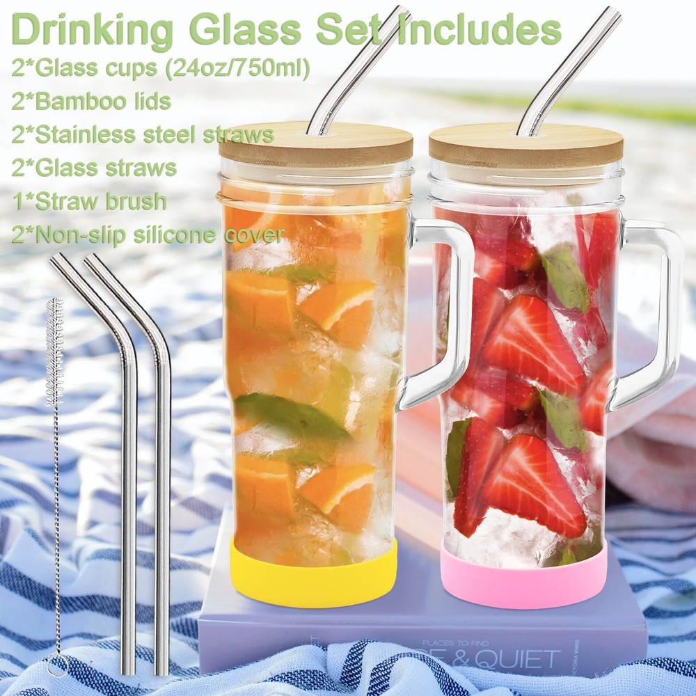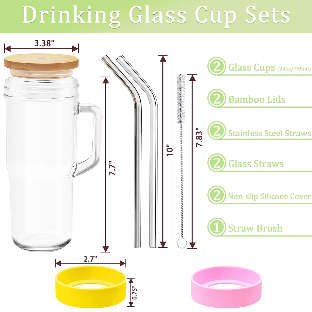 Glass Cups with Lids Straws 2Pack 24oz Mason Jar Tumblers Cup with Handle Wide Mouth Iced Coffee Cup Reusable Drinking Glasses Travel Mug for Smoothie Beer Juice Tea Clear Product Details Color: 2 Sets of 24oz Brand: GiftsFU MPN: GF-CUP-02 UPC: Does not apply EAN: Does not apply Brand: GiftsFU Color: 2 Sets of 24oz Special Feature: 24oz Large Capacity, Wide mouth, Dishwasher Safe, Non-slip, BPA-Free, Multi-purpose,on-the-go Style: Modern Theme: Party, Sports, Birthday, Wedding, Christmas, Mother's Day, Teacher's Day and More Brand: GiftsFU Color: 2 Sets of 24oz Special Feature: 24oz Large Capacity, Wide mouth, Dishwasher Safe, Non-slip, BPA-Free, Multi-purpose,on-the-go Style: Modern Theme: Party, Sports, Birthday, Wedding, Christmas, Mother's Day, Teacher's Day and More Recommended Uses For Product: Home Occasion: 24oz mason jars drinking tumbler mug can be your go-to everyday mug for travel, on-the-go, school, office, work, shopping, picnic, restaurant, party, etc. Included Components: 2*Glass Cups with Handle (24oz/750ml) 2*Bamboo Lids 2*Stainless Steel Straws 2*Glass Straws 1*Straw Brushes 2*Non-slip Silicone Cover Specific Uses For Product: Perfect for tapioca pearls, bubble tea, water, smoothies, iced coffee, juices, milkshakes, protein shakes and more cold drinks. Shape: Round Pattern: Solid Product Care Instructions: Dishwasher Safe Age Range (Description): Adult Material Feature: BPA-free Reusability: Reusable Unit Count: 2.0 Count Product Dimensions: 3.4"W x 7.6"H Material Type Free: Lead Free, BPA Free Number of Items: 2 Manufacturer: GiftsFU Size: medium Item Weight: 3.16 pounds Country of Origin: China Item model number: GF-CUP-02 Date First Available: August 25, 2024 Glass Cups Set: Come with 2*glass cups with handles (24oz/750ml), 2 *bamboo lids with spill-proof silicone seal, 2*stainless steel straws,2*Glass straws, 1* straw brushes, 2*non-slip silicone cover. Portable: The glass tumbler with a handle, a bigger top, and a smaller base, fits securely in most car cup holders. The glass cups with lid have a silicone seal, the seal is very strong, and the glass tumbler can prevent liquid from leaking or the lid from popping off when you encounter bumps on the road. Great for on-the-go and perfect as a travel cup, you can enjoy your favorite drinks wherever you are! Wide Mouth: The wide-mouth mason jar cups for easy sipping and pouring. Perfect for tapioca pearls, tea, water, smoothies, iced coffee, juices, milkshakes, protein shakes and more drinks. Without imprints, you can DIY your unique glass smoothie cup mason jar drinking glasses with cute stickers or decorations. Safe Materials: Crafted from PVC and BPA-free materials, our reusable clear iced coffee cups with bamboo lids and stainless steel straws ensure a safe drinking experience. Dishwasher-safe and easy to clean, they're built to last. Wide Application: This glass cup with lid and straw is perfect for any hot or cold drink on any occasion, the glass drinking set is loved by, home, kitchen, bar, dessert shops, offices, and restaurants. Great gift for friends and family on birthdays, and holidays, also an amazing Mother's Day, Teacher's Day, Thanksgiving, Anniversaries, or Christmas gift!