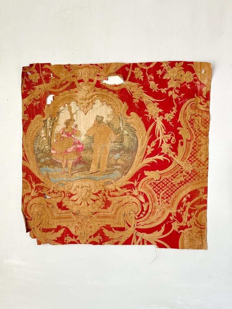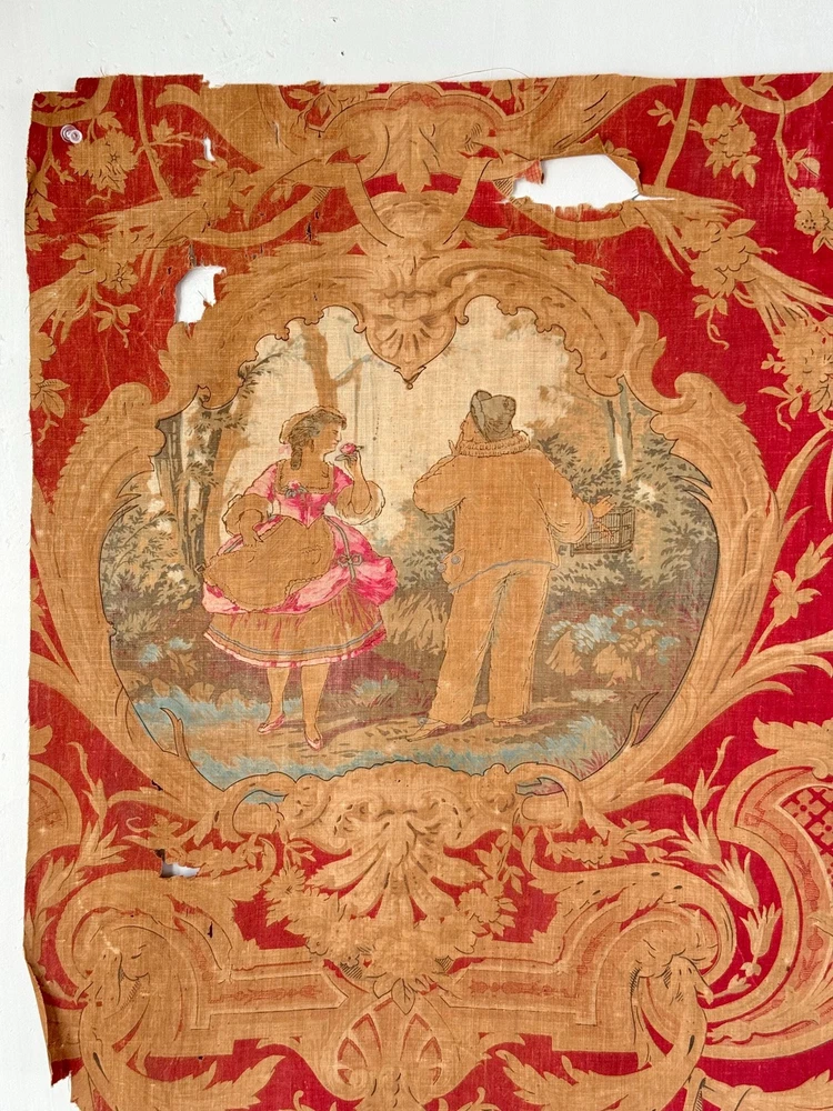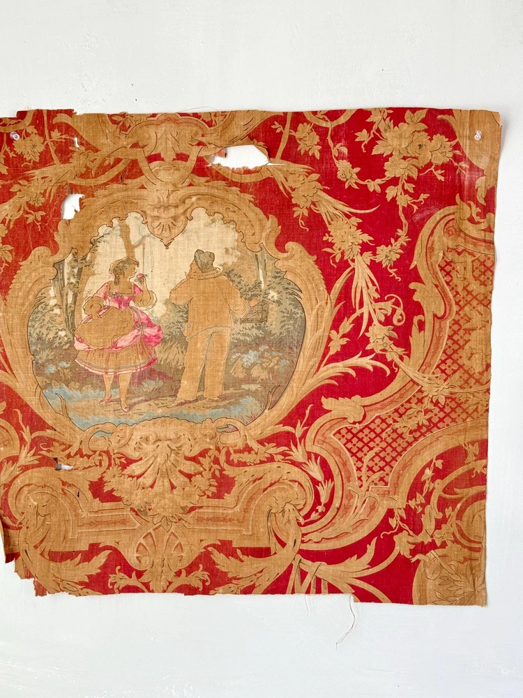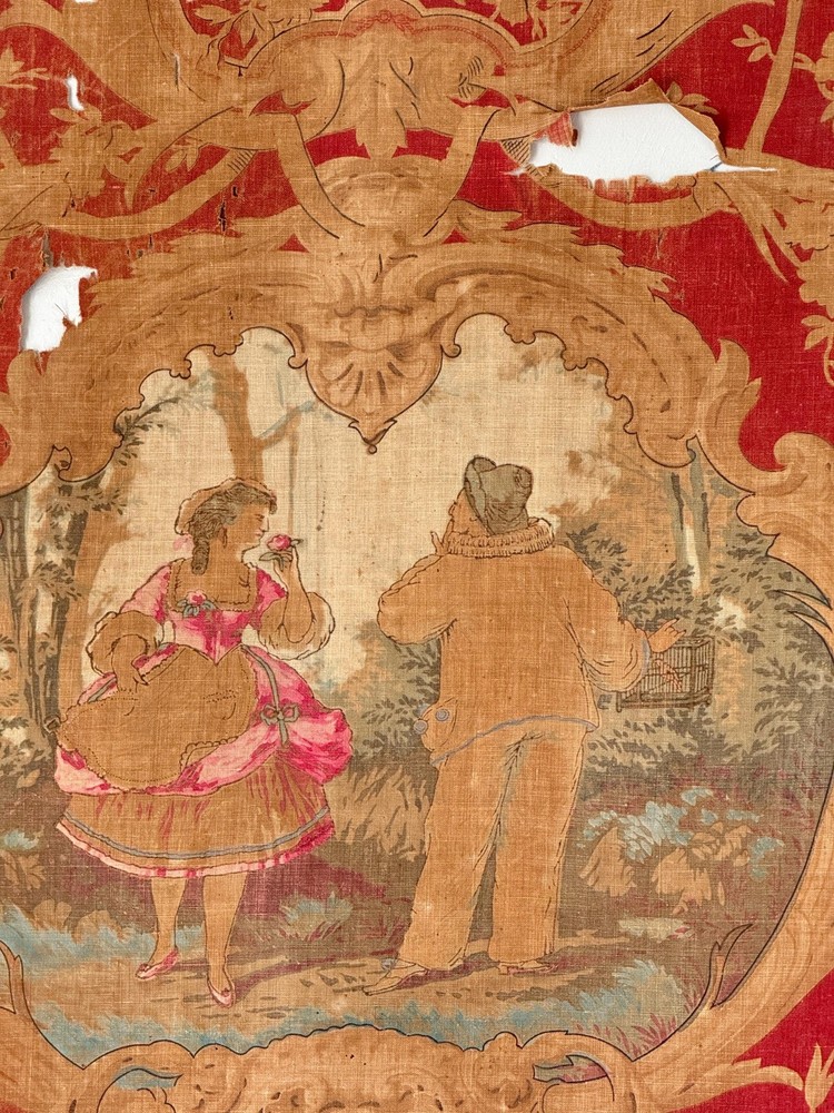 Welcome to The Textile Trunk ~ please follow us on Instagram, we are @textiletrunk What an absolutely special find this is! Very fragile, but gorgeous! This antique French fabric, dating to around 1830 or earlier, It's a very early fabric, and I KNOW I've come across it before in one of my many museum jaunts, but my 57 years old brain is having trouble recalling! The Harlequin pattern is a very rare find! I found a collection of pieces, to view the others simply search my store for the word Harlequin and they will appear! ~*~ ~ This fabric is a lightweight linen-cotton blend, hand block printed with incredible artistry. The design includes scenes inspired by the Commedia dell’Arte, with a harlequin figure and a pastoral couple, evoking the playful and romantic spirit of the early 19th century. Fabrics like this were created for the most elegant interiors, often used as decorative panels, wall hangings, or fine drapery, bringing beauty and storytelling into everyday spaces. The early 1800s saw a love for patterns like this, combining theatrical and romantic themes It’s such a joy to imagine how this fabric must have added drama and charm to a grand French interior so many years ago. While this fabric is no longer strong enough for sewing or projects (please see condition details), it’s absolutely perfect for framing, historical study, or as a treasured piece in a collection of rare textiles. MEASUREMENTS Approximately 24 inches by 23 inches. CONDITION This fabric is in as found, not freshly laundered condition. It is very brittle and tearing easily, with no strength left for projects or sewing. There are many small tears, some holes, and overall fragility. Because of the delicate nature of this fabric, it will be mailed in a mailing tube, so please be cause when opening! ~*~ It's is perfect for framing, historical study, or adding to a collection of antique textiles. Please use the zoom feature on the photographs to examine the exact condition. Not only do I feel so fortunate to share this antique work of art for use in our homes today, but this also supports eco-friendly practices by giving old materials a new life through upcycling and creative reuse. Inventory: P 201