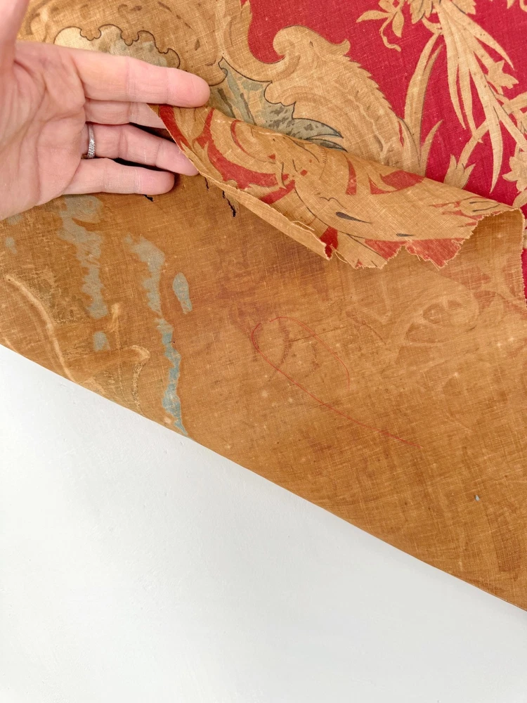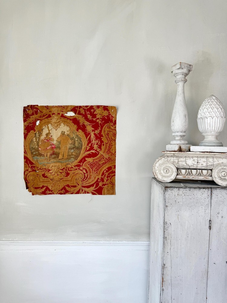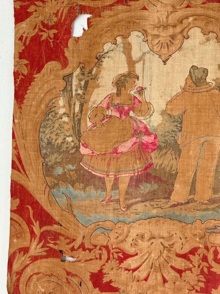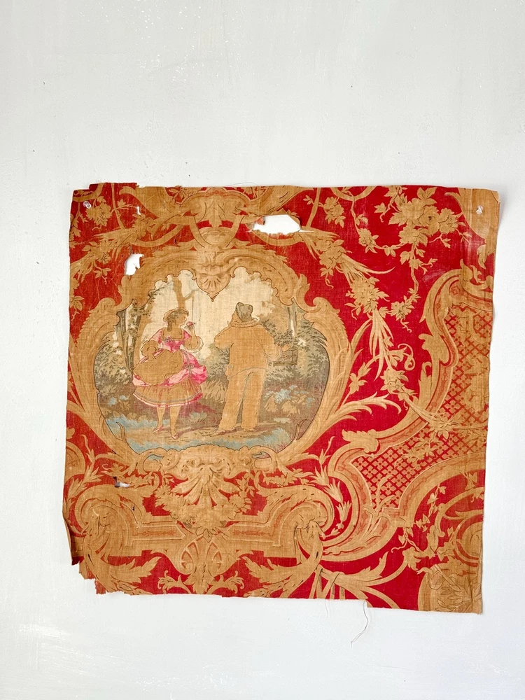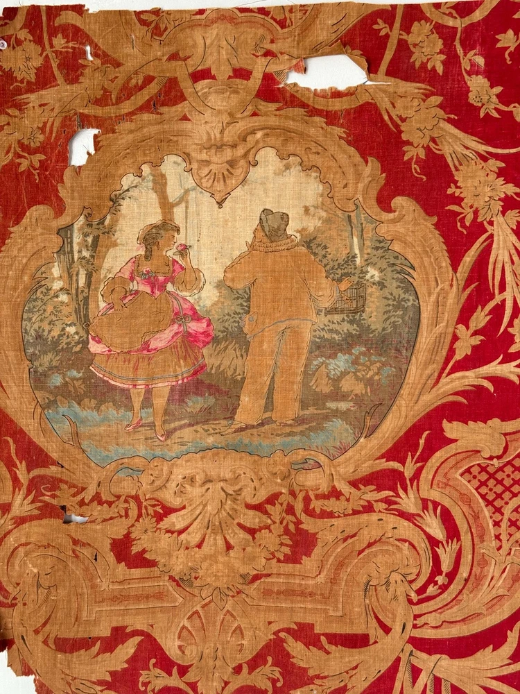 Welcome to The Textile Trunk ~ please follow us on Instagram, we are @textiletrunk What an absolutely special find this is! Very fragile, but gorgeous! This antique French fabric, dating to around 1830 or earlier, It's a very early fabric, and I KNOW I've come across it before in one of my many museum jaunts, but my 57 years old brain is having trouble recalling! The Harlequin pattern is a very rare find! I found a collection of pieces, to view the others simply search my store for the word Harlequin and they will appear! ~*~ ~ This fabric is a lightweight linen-cotton blend, hand block printed with incredible artistry. The design includes scenes inspired by the Commedia dell’Arte, with a harlequin figure and a pastoral couple, evoking the playful and romantic spirit of the early 19th century. Fabrics like this were created for the most elegant interiors, often used as decorative panels, wall hangings, or fine drapery, bringing beauty and storytelling into everyday spaces. The early 1800s saw a love for patterns like this, combining theatrical and romantic themes It’s such a joy to imagine how this fabric must have added drama and charm to a grand French interior so many years ago. While this fabric is no longer strong enough for sewing or projects (please see condition details), it’s absolutely perfect for framing, historical study, or as a treasured piece in a collection of rare textiles. MEASUREMENTS Approximately 24 inches by 23 inches. CONDITION This fabric is in as found, not freshly laundered condition. It is very brittle and tearing easily, with no strength left for projects or sewing. There are many small tears, some holes, and overall fragility. Because of the delicate nature of this fabric, it will be mailed in a mailing tube, so please be cause when opening! ~*~ It's is perfect for framing, historical study, or adding to a collection of antique textiles. Please use the zoom feature on the photographs to examine the exact condition. Not only do I feel so fortunate to share this antique work of art for use in our homes today, but this also supports eco-friendly practices by giving old materials a new life through upcycling and creative reuse. Inventory: P 201