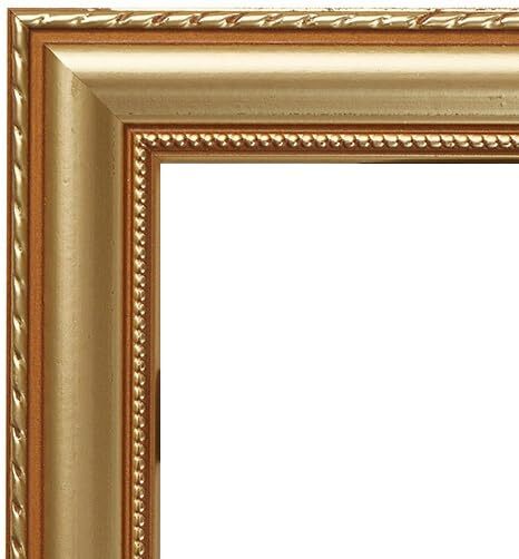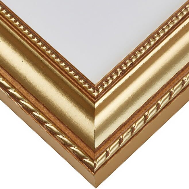Victorian style; gold with ornate detail; painted finish Frame includes: clear acrylic facing, rigid cardboard backing and wire hanging hardware kit (some assembly required) Frame holds a 24 by 36 inch photo/print/poster (viewable area reduced by .25" on each side due to frame lip) Frame moulding is 1.375 inches wide; solid wood construction Frame is designed for WALL HANGING only (hanging hardware allows for portrait or landscape orientation)