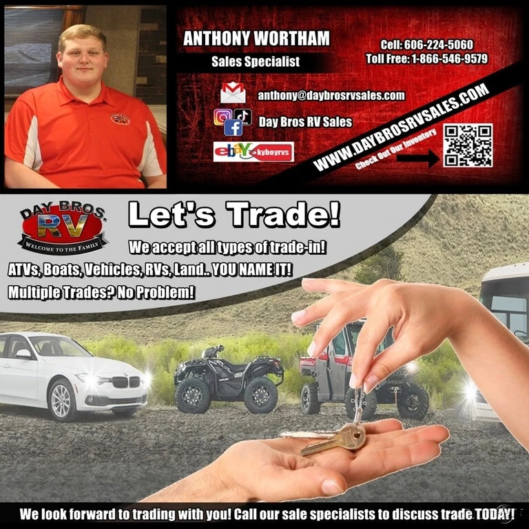 Vehicle Information Year: 2025 Make: Forest River Model: Cherokee Wolf Pup Condition: New Contact Day Bros RV Sales 3054 South Laurel Rd London Kentucky 40744 View Map Ask for: Anthony Wortham Contact: Contact Us Main: (866) 546-9579 Hours Mon, Tues, Thurs, Fri: 09:00 AM-06:00 PM EST Wednesday: 09:00 AM-05:00 PM EST Saturday: 09:00 AM-04:30 PM EST Sunday: Closed Why Buy From Day Bros In Kentucky **Click "See full description" in Item Description for more specs and photos!** Come visit us in scenic Laurel County, KY! Our location in London, KY is just five miles off Exit 38 on I-75 and places us in the middle of some of the most beautiful scenery in the country. We're just north of Cumberland Fall State Resort Park, a vacation destination that's home to the "Niagara of the South." Cumberland Falls is one of the largest waterfalls in North America and one of the precious few places in the world where you can see a moonbow. People come from all across America to take in the beauty of this local treasure, and with its RV park you can make a long weekend of your purchase from Day Bros. It's also home to miles of hiking trails, making it the perfect RV destination. Come on by and plan to stay for a few days after you drive your new purchase off the lot! If anything goes wrong, we're right here to help make sure you make that long drive home with a reliable coach. A little closer but no less beautiful is Levi Jackson State Park, which is just up the road from our dealership. A historic park encompassing nearly 900 acres, you can visit parts of the Wilderness Road, where early settlers traveled to reach Kentucky. You can retrace the steps of Wilderness Road with two hiking trails totaling 8.5 miles. Levi Jackson is also home to an RV park for that long weekend--why not celebrate the purchase of your new coach with a mini vacation! Levi Jackson also boasts the Mountain Life Museum, which brings visitors into a pioneer settlement for some historic fun every Friday and Saturday Memorial Day through Halloween. Don't hesitate to ask us where to find good food and good fun in the local towns while you're here. London and Corbin are experiencing an exciting downtown revival of great food and local shops, and if you give us a call you can schedule a visit during one of our famous events, such as the World Chicken Festival. We want your RV buying experience to be a fun as possible and our location means there's plenty to be had. To get started on your RV buying journey, call us at 1-866-546-9579 or visit our website at www.daybrosrvsales.com NOTE: Some of our RVs are located at our NEW location in Monticello, KY! See pictures for more info. Anthony Wortham (866) 546-9579 3054 South Laurel Rd London Kentucky 40744 Day Bros RV Is Located In Scenic London, KY Credit Application Directions to Dealer Contact Us BBB Accredited Business London, KY Monticello, KY 25 Forest River Cherokee Wolf Pup 17EV Travel Trailer Towable RV Camper RearBath Video Apply Now Secure Credit Application Applying for a vehicle loan online is one of the quickest and easiest application methods. Our secure application is easy to complete, all you need are a few personal and employment details. Credit Application Directions to Dealer Contact Us Options and Standard Features Basic Information Year: 2025 Make: Forest River Model: Cherokee Wolf Pup Trim: 17EV Stock Number: 035018 VIN: 5ZT2CKFC5SY035018 Condition: New Type: Travel Trailer Length (Feet): 20 Sleeping Capacity: 3 Title: Clean Exterior Exterior Color: White/Blue Interior Interior Color: Tan Convenience Leveling Jacks Included: Standard Slide-Outs & Awnings Awnings: 1 Similar Vehicles Check out similar vehicles in our inventory. View Inventory Welcome Section Welcome Day Bros RV Sales is located in the Southeastern part of KY in the town of London, 5 miles off of exit 38 from I-75. We are one of the fastest growing dealerships in the Southeastern United States. We also have a location in Monticello, KY near Lake Cumberland and Somerset, KY to serve even more customers and make sure our stellar service is even easier to access! We’ve built our business from a small used RV lot to one of Kentucky’s top sellers of incredible brands such as Thor Motor Coach, Winnebago, Holiday Rambler, Coachmen, Tiffin, Forest River and more! Our expert staff work in perfect harmony to make sure our customers have a wonderful experience from selection to financing to driving their unit off the lot, and our certified technicians make sure you’re taken care of for the life of your rig. We have been selling motorhomes on eBay for over 27 years, and in that time we’ve become a top seller with 100 percent positive feedback. We have one of the largest selections of new and pre-owned motorhomes, 5th wheels, and travel trailers. We have been family owned and operated for over 25 years and we're still growing! Sales Department 1-866-546-9579 Our team is absolutely the best in going above and beyond to make your eBay buying experience a great one. With over 100 combined years of industry experience our helpful team understands RVs. Whether you know what you want or you’ve yet to make up your mind, our sales team can guide you through the selection process without pressure to buy. Day Bros understands you’re making a big purchase, and we can give you all the information you need to make sure it’s the perfect purchase for you. We also accept trades. We can give you an estimate on a trade in as little as 15 minutes. If you have questions, or want to talk about a trade-in, call us at (866) 546-9579, visit us at www.daybrosrvsales.com, or email us at sales@daybrosrvsales.com Parts & Service Department 1-866-546-9579 Our business is located on acreage of easy to access blacktop--there’s no mystery on where to pull in or how to maneuver into our 18-bay service and full body collision center. We have a full service center and parts store that have everything you need to keep any model of RV in great 