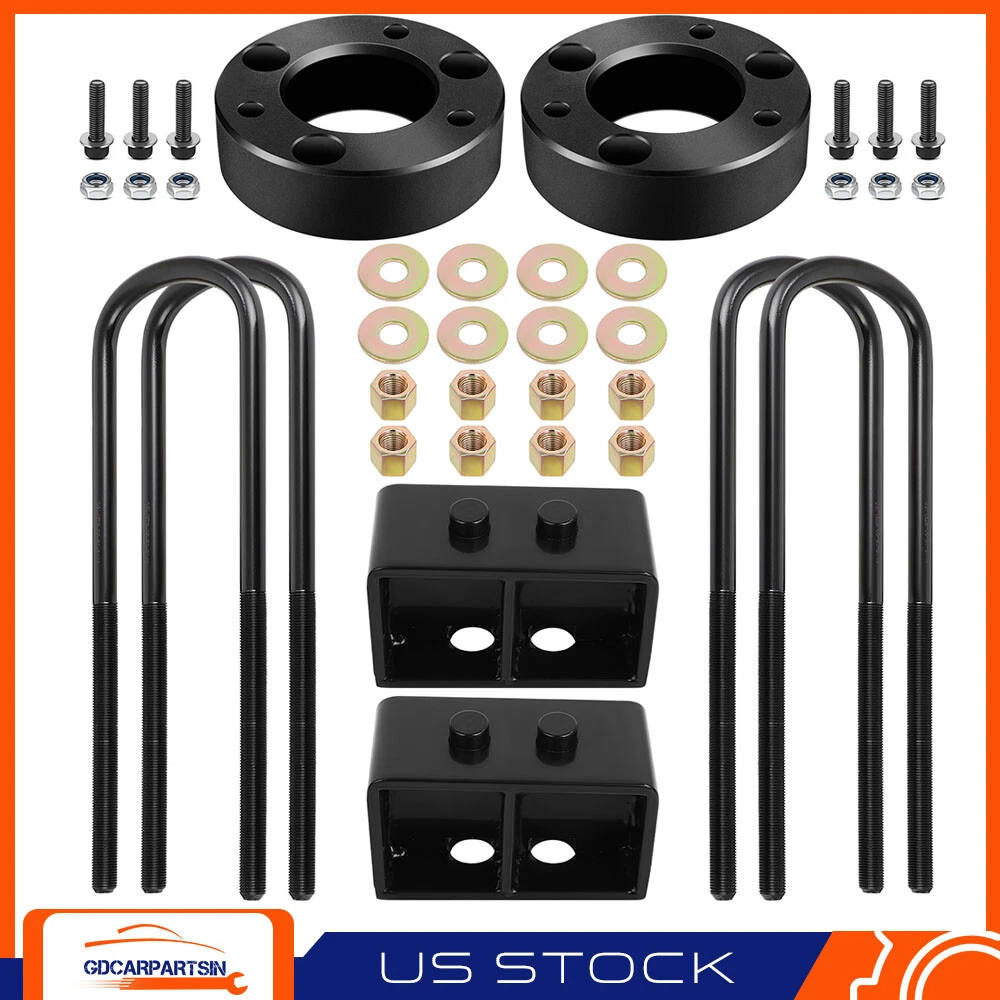 Front Spacers: After removing the wheel, remove any brake line and ABS line brackets, so you have enough slack in the lines. Use a wrench to remove the upper strut mount nuts and the upper ball joint nut. Strike the side of knuckle with a hammer to get the ball joint to separate. Using a wrench, remove the steering linkage nut. Remove the sway bar nut and bushing. Remove the two lower strut mount bolts and remove the strut from the vehicle. 2.5" Front & 3" Rear Leveling Lift Kit For Ford F150 2WD 4WD 2021 2022 2023 2024 Front Spacers: After removing the wheel, remove any brake line and ABS line brackets, so you have enough slack in the lines. Use a wrench to remove the upper strut mount nuts and the upper ball joint nut. Strike the side of knuckle with a hammer to get the ball joint to separate. Using a wrench, remove the steering linkage nut. Remove the sway bar nut and bushing. Remove the two lower strut mount bolts and remove the strut from the vehicle. Install the supplied bolts into the leveling kit spacer. These will act as the new studs when reinstalled. Bolt the spacer to the top of the strut using the supplied nuts. Rotate the strut 180 degrees and install it back into the truck. Re-insert the lower strut bolts. The lower mount bushing will rotate to correct the angle. Raise the lower control arm to raise the spindle while lowering the upper control arm to re-install the upper ball joint and Re-install the steering linkage. Complete the installation on the other side of the truck before reinstalling the sway bar nut and bushings. Rear Blocks: Support the rear axle with a jack and jack stands. Remove the brake and parking brake cables so there is slack in the lines. Remove the lower rear shock mount nut and bolt. Remove the factory rear U-bolts and discard them. Lower the axle to remove the factory block, or you can put new blocks on the factory block, get a new lift. Install the new rear block making sure the smaller side of the spacer is facing the front of the truck. Install the new supplied U-bolts and torque to factory spec. Complete the installation on the other side of the truck before reinstalling any brake or ABS lines. After 100 miles recheck torque to factory spec. Item Specifics Brand gdcarpartsin Manufacturer Part Number GD84702901car Lift Height 2.5" Front & 3" Rear Actual Spacer Thickness appr. 1.65"/ 42mm Note Lifting height is not exactly equal to spacer thickness Blocks Specs 5.12" Long x 2.48" Wide Included Hardware All Parts in pictures included Part Type Suspension Lift Kit Fitment Type Performance/Custom Placement on Vehicle Left Right Front Rear Warranty 1 Year Material Aluminum Steel Kit or Single Part Kit Kit Parts Included Strut Spacers Lift Blocks U-Bolts Instruction No Included Fitment For Ford F150 Drive Type 4x4 4WD / 4x2 2WD Color Black Interchange Part Number for 2021-2024 Ford F-150 2WD 4WD U Bolt Specs Square 12.8" Long / 3.15" Wide / 5.9" Threads / 9/16"-18 Quantity 2X Strut Spacers 2X Rear Blocks 4X U-bolts Shipping 1. Orders processed within 24 hours of payment verification.(if you want cancel orders or change address pls contact us within 6 hours after payment,or we are not responsible for shipping a replacement.) 2. We only ship to confirmed PAYPAL addresses. Your PAYPAL address must match your Shipping address. 3. Fast shipping:All our packages use USPS First Class/UPS/Fedex... Package Service 4. If you have not received your shipment within 15 days from payment , please contact! Return 1. You have 30 days to contact us and 10 days to return it from the date it was received. If this item is in your possession more than 7 days, it is considered used and we will not issue you a refund or replacement. There are NO EXCEPTIONS! 2. All returned items must be in the original packaging and you must provide us with the shipping tracking number, specific reason for the return, and item custom lable. 3. We will refund your full winning bid amount, upon receipt of the item in its original condition and packaging with all components and accessories included, AFTER both Buyer and Seller cancel the transaction from eBay. OR, you may choose to have a replacement. 4. Return shipping is to be paid by the Buyer Feedback We strive for 100% customer satisfaction! FEEDBACK IS VERY IMPORTANT TO US. We request that you contact us immediately BEFORE you give us neutral or negative feedback, so that we can satisfactorily address your concerns. Payment 1.We only accept PayPal. 2.Please do not use the PayPal note field to indicate us to ship to other address. The note there will NOT be read. If you want to change the shipping address, please contact us by eBay messages. 3.(if you want cancel orders or change address pls contact us within 6 hours after payment,or we are not responsible for shipping a replacement.) 4.Payment must be received within 10 days as auction ended or order might be delayed. Warranty 1,We stand behind every product we sell. 2,All of our brand new items come with a 60-Days money-back guarantee. 3,We define the item as defective only if it doesn't function as described. 4,It is the buyer's responsibility to understand the item description before bidding. 5,We will replace the defective items, provided that they are in stock within the warranty period posted with the listing and the buyer return the original item and pay for the S&H cost for the replacement. 6,We will refund the purchase price if the replacement is not available or buyer prefers a refund and send the original item back at his/her own cost. 7,Shipping & handling cost are not refundable. 8,Man-made damage by abuse or wrong operation is not covered by this warranty. 9,No product liability insurance is assumed. Shop Category Store Home Mirror Parts ◈ Vehicle Mirrors ◈ Truck Mirrors ◈ Mirror Glasses & Other Parts Brake Parts ◈ Brake Rotors ◈ Brake Pads ◈ Brake Rotors + Pads Mass Air Flow Sensors Oxygen Sensors Cooling Parts ◈ Radiators ◈ Radiator Hoses ◈ Cooling Fans 