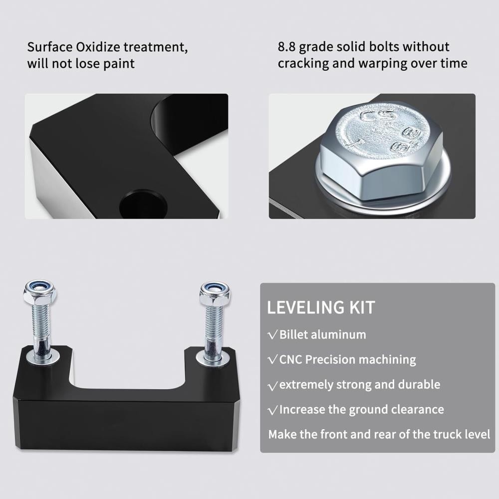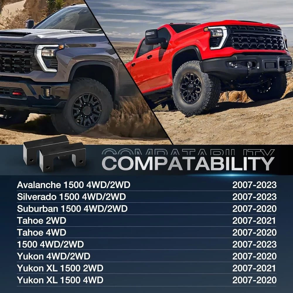 Specification: Product color: Black Product material: Aluminum Fits: 2007-2011&2013 avalanche 2WD/4WD 2007-2019 silverado 1500 2WD/4WD 2007-2012 suburban 1500 2WD/4WD & 2015-2016 2018-2019 Suburban 2007-2019 tahoe 2WD/4WD 2007-2009 | 2015 | 2017-2018 Sierra 2WD/4WD 2007-2019 sierra 1500 4WD/2WD 2007-2019 yukon 2WD/4WD 2016-2019 yukon xl 2008-2014 yukon xl 1500 Please note that it does not fit ''Trailboss" models''/''AT4'' models/2014-2018 "Denali" models/ "MagneRide" models/ and 2007 "Classic" models. Please note: Lift spacer thickness and lift is not a 1 to 1 ratio due to the suspension geometry. Package Include: 2pcs/Set X Front Lift Spacers Package Include:Leveling kit 2pcs(6061 Aluminum alloy),Screw × 4, nut × 4, gasket × 8 Compatible with:2007-2023 Avalanche 1500 4WD/2WD,2007-2023 Silverado 1500 4WD/2WD,2007-2020 Suburban 1500 4WD/2WD,2007-2021 Tahoe 2WD,2007-2020 Tahoe 4WD,2007-2023 Sierra 1500 4WD/2WD,2007-2020 Yukon 4WD/2WD,2007-2021 Yukon XL 1500 2WD,2007-2020 Yukon XL 1500 4WD This lift kit will raise the front of your Silverado or Sierra by a true 2.5". Can be installed in about 1 1/2-2 hours and does not require strut/coil disassembly like other kits. They are CNC machined out of billet aluminum and then anodized black to match you factory suspension. The quality of this kit cannot even be compared to cheap imported spacers. These spacers are the strongest on the market and come with a 100% satisfaction guarantee. Not Fit:Not compatible with 2014-2018 "Denali" models,2007 "Classic" models,AT4 Models,TrailBoss Models and MagneRide Models Material:The leveling lift kit is made of 6061 aluminum alloy for better durability and lighter weight. The surface treatment is anodized black, which is not easy to rust and lasts longer Fits: For Silverado 2WD/4WD * 2007-2019 For GMC Sierra 2WD/4WD * 2007-2019 For Yukon 2wd/4wd * 2007-2019 For Tahoe 2wd/4wd * 2007-2019 For Suburban 1500 2wd/4wd * 2007-2019 For Chevy Avalanche 2wd/4wd * 2007-2013 *Will not fit Classic Body Style 2007 Models. Package Include: 2 x 2.5 inch Leveling kit 4 x Screw 4 x Nut 8 x Gasket On Mar 31, 2026 at 02:47:00 PDT, seller added the following information: