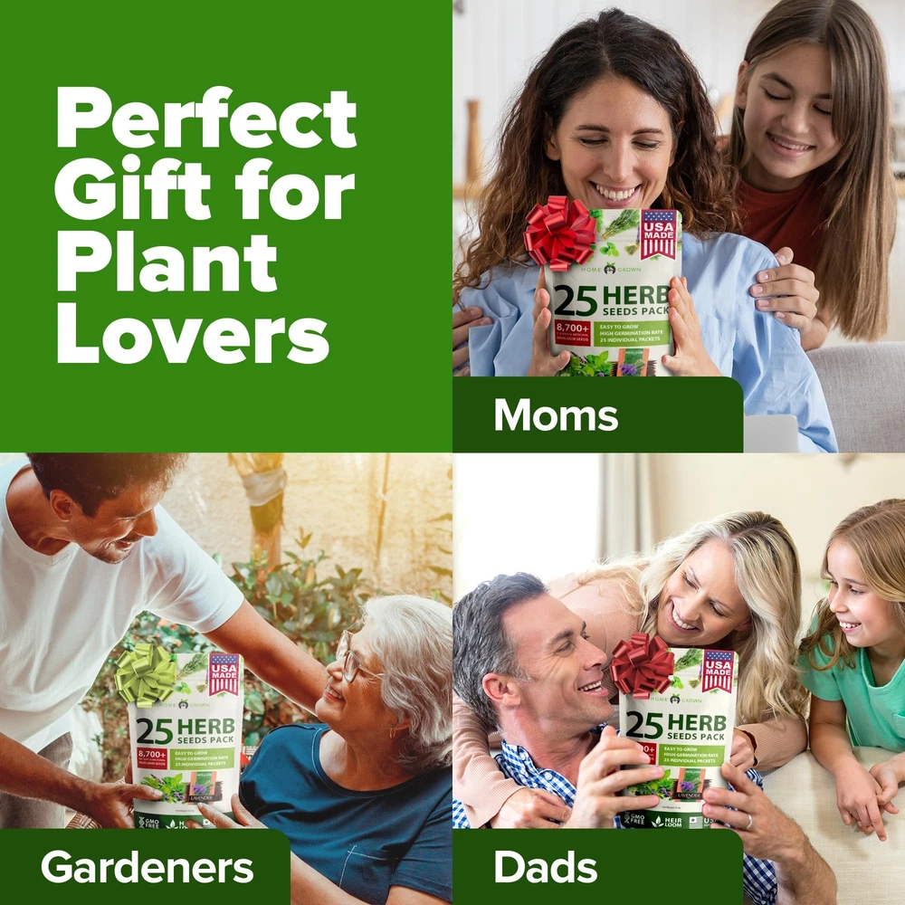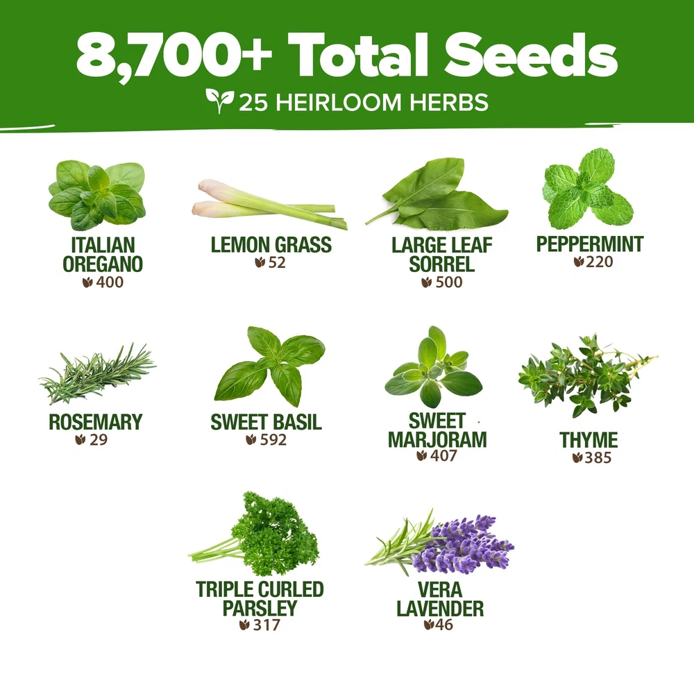 GROW 25 CULINARY HERBS - Your favorite herb seeds for planting in convenient pack. Enjoy flavorful herbs like angelica, basil, chives, cilantro, fennel, lavender, mint, oregano, parsley, cumin, sage, thyme and more. 8700+ SEEDS, GROW GUIDE - Explore our top-quality herb seeds variety pack. Elevate your gardening with our comprehensive online grow guide, offering expert tips for successful cultivation. HIGH GERMINATING HERBS SEEDS - Tested and guaranteed germination rate under optimal conditions, ensuring every flourishes. Plant indoors, outdoors for a year-round supply of fresh herbs. Ideal herb seeds for hydroponic garden. NON GMO, HEIRLOOM, USA SEEDS - Our open-pollinated herb seeds are sustainably sourced in the USA, guaranteeing top quality without genetic alteration. Each is sealed for freshness. Experience excellence with our culinary herb seeds variety pack. BEST VALUE FOR MONEY - Our culinary herb garden seeds variety pack offers more garden herb seeds than other brands. Wrapped in attractive, fresh-looking packaging, it's also an ideal gift for friends and family. Get your herb garden seeds today!