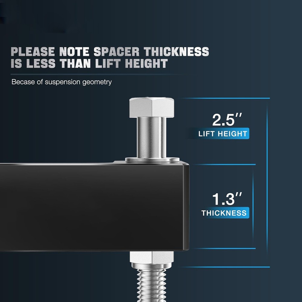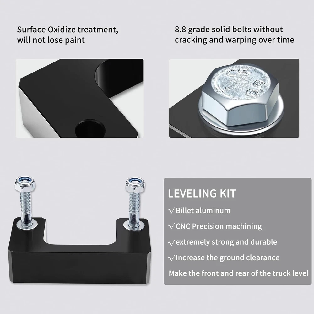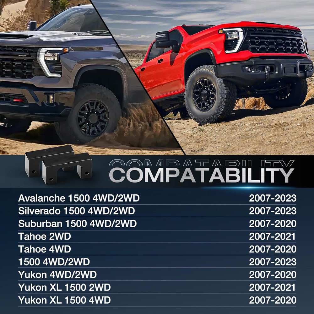 Specification: Product color: Black Product material: Aluminum Fits: 2007-2011&2013 avalanche 2WD/4WD 2007-2019 silverado 1500 2WD/4WD 2007-2012 suburban 1500 2WD/4WD & 2015-2016 2018-2019 Suburban 2007-2019 tahoe 2WD/4WD 2007-2009 | 2015 | 2017-2018 Sierra 2WD/4WD 2007-2019 sierra 1500 4WD/2WD 2007-2019 yukon 2WD/4WD 2016-2019 yukon xl 2008-2014 yukon xl 1500 Please note that it does not fit ''Trailboss" models''/''AT4'' models/2014-2018 "Denali" models/ "MagneRide" models/ and 2007 "Classic" models. Please note: Lift spacer thickness and lift is not a 1 to 1 ratio due to the suspension geometry. Package Include: 2pcs/Set X Front Lift Spacers 【FUNCTION】2.5" Front Lift. It can increase the ground clearance and give you more room for large tires. 【MATERIAL】Made of heavy-duty Billet Aluminum to achieve higher strength and better compression resistance. 【PROCESS】Black powder coated:can further improve the overall corrosion resistance, prolong the service life, and maintain an attractive appearance in the next few years. 【PRECISION】Computer-aided design and laser-cut to ensure the perfect fit. 【INSTALLATION】No modification is required, just easy bolt-on installation, and takes 1 hours. 【TOOLS REQUIRED】Jack, Socket & Wrench. 【NOTE】Suspension lift doesn't occur in a 1:1 ratio with spacer thickness due to the suspension geometry. Fits: For Silverado 2WD/4WD * 2007-2019 For GMC Sierra 2WD/4WD * 2007-2019 For Yukon 2wd/4wd * 2007-2019 For Tahoe 2wd/4wd * 2007-2019 For Suburban 1500 2wd/4wd * 2007-2019 For Chevy Avalanche 2wd/4wd * 2007-2013 *Will not fit Classic Body Style 2007 Models. Package Include: 2 x 2.5 inch Leveling kit
