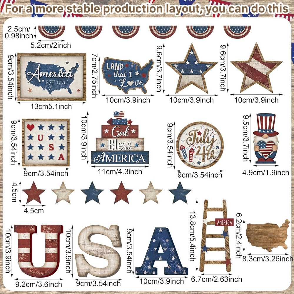 Store New Arrivals Add to Favorite View Feedback Contact Fast deliveries to the customer's home Quality customer service John Make the customers happy! 25 Pcs 4Th of July Tiered Tray Decorations Set Wood Patriotic Decoration Rustic American Flag Star Red White Blue Farmhouse Decor for Memorial Day 250Th Anniversary Home Indoor Birthday Party(Stylish) Description Ample Quantity: this package includes 25 wood 4th of July tiered tray decorations; This abundance in quantity ensures that every corner of your home can be lively and shine with a celebratory mood, all in complementing patriotic colors; Please note that tiered tray is not included Patriotic Theme: the wood 4th of July tiered tray decor set encapsulates the essence of Independence Day; The package includes elements like the word USA, map of the United States, star, and dwarf, painted in red, white, and blue; Each piece matches the patriotic atmosphere, creating a charming farming and rural aura in your home Enhance Aesthetic Appearance: these farmhouse tier tray decor set offer an easy and attractive way to enhance the aesthetic appeal of your home or office during the patriotic holidays; Turning these simple wood pieces into an integral part of your holiday traditions Quality Material: with the 4th of July tiered tray decor beautifully crafted from wood, enjoy stability and durability; Clear printing and a smooth surface free from burrs; These pieces are comfortable, reliable, and usable for a long time, offering long lasting aesthetic appeal to your home decor Versatile Display: :beyond just being items for your tiered trays, the wood 4th of July decor pieces are great fits for display on cabinets, dining tables, and fireplaces; Additionally, you could hang them on the wall, window, door, or a tree, complementing your decor with the right hooks and ropes, all to beautifully express your patriotic spirit Features: Chic gift: The fourth of July tiered tray decor makes a chic, meaningful gift that you can present to your families, friends, relatives, neighbors, colleagues, and classmates. They are thoughtful offerings for Memorial Day, 4th of July, and Labor Day, carrying patriotic feelings and adding to the celebratory spirit. Celebratory atmosphere: Create a festive, patriotic atmosphere in your home or office with these patriotic tiered tray decors. The patriotic colors and elements add a touch of charm and festivity, ideal for your Independence Day celebration. Specifications: Material: wood Color: red, white, blue Size: as the picture shown Package includes: 25 x Memorial Day tiered tray decor Notes: Manual measurement, please allow slight errors on size. The color may exist a slight difference due to different screen displays. Unit Count 25.0 Count Item Dimensions L x W x H 7.87"L x 5.51"W x 1.77"H Number of Items 25 Color Red, White, Blue Pattern Solid Material Wood Material Type Wood Is Dishwasher Safe No Style Stylish Item Weight 0.22 Kilograms Is Oven Safe No Shape Rectangular Style Name Stylish Tray Type Tiered Tray Occasion Housewarming Finish Types Painted Product Dimensions 7.87"L x 5.51"W x 1.77"H Product Care Instructions Wipe with Dry Cloth ABOUT US We offer the best prices around on high quality products. Our E-store includes media such as books, movies, music and games while offering electronics, toys, sporting apparel, clothing, tools, general home, garden items and more. SHIPPING We are always working hard to ensure your package arrives as soon as possible. Please understand that some factors like weather, high postal traffic, and the performance of shipping companies are outside of our control. We offer free shipping to the lower 48 states and ship within 2 business days of payment, usually sooner. We do not accept P.O. Boxes. Please provide a physical address. For shipping outside of the continental USA, we only use eBay's Global Shipping Program. The item is shipped to KY and then sent to the rest of the world. International customers are responsible for all duties and taxes. Continue to 'check out' to calculate costs for shipping the item to your country. Messages regarding eBay's Global Shipping Program MUST be directed at eBay EXCLUSIVELY. RETURNS We offer a 30-Day Return Policy on items in which you are not completely satisfied with. You have the option of a full-refund or an exchange of the item. No returns are available on items shipped outside of the USA PAYMENT We accept PayPal. CONTACT US This page content is yet to come Please ad us to your favorite seller and visit again later Thank You CUSTOMER SATISFACTION We try our very best to make sure every customer is completely satisfied. If there's a problem, message us! We're happy to help. WE ACCEPT