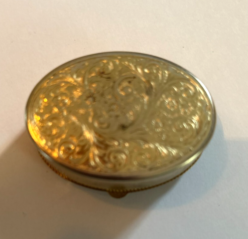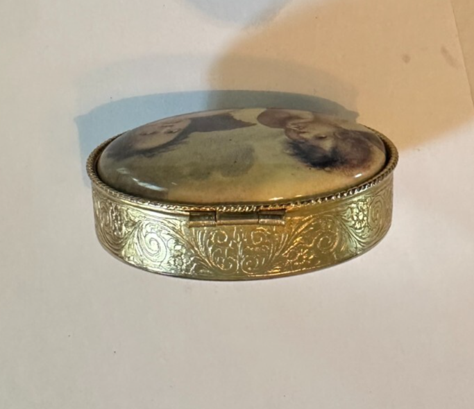 Discover a touch of Victorian elegance with our Cherubs Trinket Box, a delightful addition to any collection. The oval shape and muted pink & brown colors capture the innocence of angelic themes, while the goldtone finish adds a luxurious touch. This hinged trinket box, featuring cherubs pattern, is a harmonious blend of functionality and ornate design, perfect for storing your precious keepsakes. Crafted in the United States during the 1990s, this piece is part of the Angelique collection and stands as a testament to timeless style. Whether for special occasions or everyday use, this small, non-customized trinket box embodies the charm and grace of its angelic subject, making it a unique and cherished gift or keepsake for anyone who appreciates the beauty of vintage aesthetics.