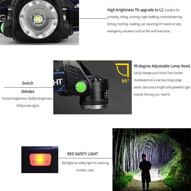 25000LM Powerful LED Headlamp Waterproof Headlight USB DC Charging Head Lamp Zoomable Head Front Light Use Rechargeable Battery More than 98% of buyers will choose to buy a set with a battery and a charger to avoid some problems that are expensive and can't be bought. High quality, full capacity, no virtual standard capacity. Recommend everyone to buy.LOOK AND FEEL GREAT WEARING IT - Super Comfortable and Stylish Head Straps are both Stretchy and Adjustable to Fit all Adults and Kids. With it's Stylish and Sleek Design - All your friends and family will want to wear one. * Model of LED: L2/V6 * Lumens: 8000/18000/25000 Lumens * Waterproofing design * Aluminum alloy casing * Aluminum alloy reflector * 3 switch Mode: Bright Light/Dim Light/Flashing Mode * Model of Battery required: rechargeable Battery * Colour : Black with Blue Band * Head Light Weight :175g * Adjustable Focus, Zoomable LED Headlamp * Switch: head press switch Main Features: Use 1 or2* rechargeable batteries. Intelligent circuit control, Telescopic Zoom,3 mode (strong, low, SOS). The headband can stretch adjust according to the size of your head. Conveniently put on or take off. The head It can adjust the illumination angle of 90 degrees. The red indicator light on the battery holder plays a good warning role in night walking or cycling! Suitable for sport lovers to do some such as hunting, cycling, Bicycle riding, To climb, Hike, Working, Fishing, Camping etc Package Contains: 1x Headlamp 1x USB Charger Cable 2x Battery(Not AA battery)