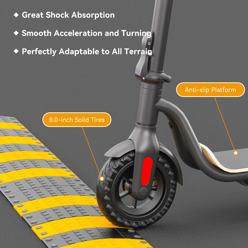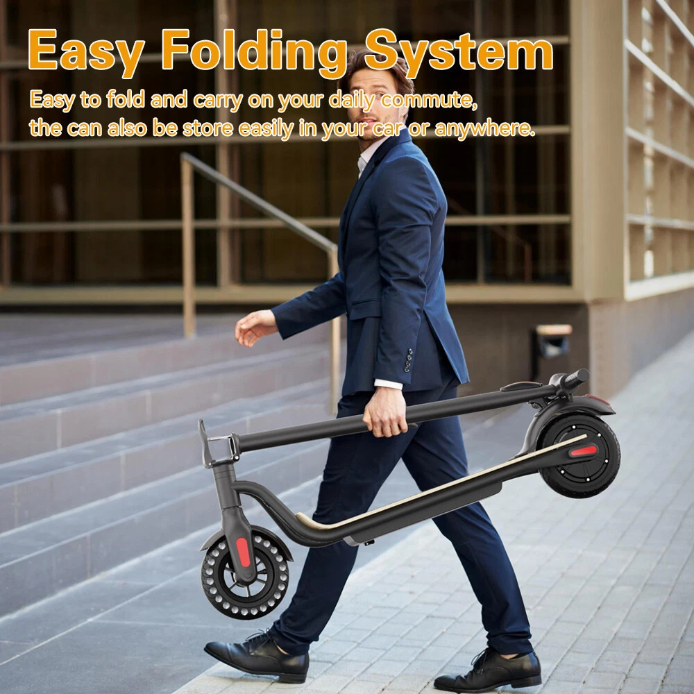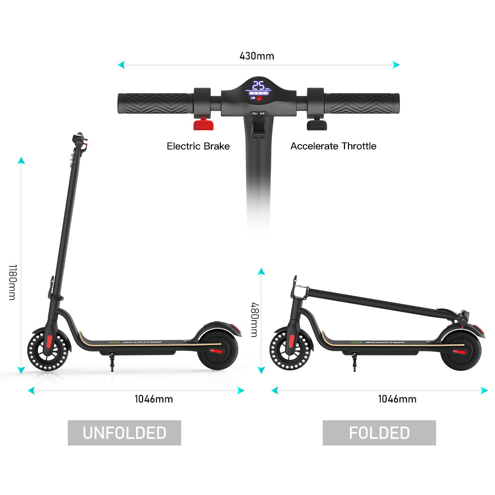 NOTE:The appearance of the product you receive may vary slightly from the image shown due to differing production batches! Main features: LONG RANGE BATTERY LIFE - Powerful 250W motor and 5.2 Ah/36V lithium battery pack that supports a speed of up to 15 Mph with a range up to 7 Miles. Updated large-capacity battery life, designed for commuters and longer distances. 8.0" HONEYCOMB & SOLID TIRES - Shock-absorbing rubber tires offer a smooth ride even over bumpy surfaces. PORTABLE FOLDING DESIGN - Electric scooter can be folded easily in 3 seconds with quick folding latch for easy carrying and storage. BATTERY INDICATOR AND LIGHTS - Battery indicator keeps to track battery life. Ultra bright LED headlight and taillight. Fast recharging about 5 hours. GEAR SHIFT SETTING - 1st gear for a 7 Mph comfortable ride or 3rd gear to get the 15 Mph fast experience. Extremely fun to ride and end boring commutes. Specification: Brand: Megawheels Model: S10 Dimension: Unfolding 105 x 43 x 118 cm; Folding: 105 x 43 x 48 cm Net Weight: 11.9kg Color: Black Frame Material: Aluminium Tires: 8.0" Honeycomb Front Tire & Solid Rear Tire Max Load: 100kg Max speed: 25KM/h Speed level: Gear 1--Max 10km/h ; Gear 2--Max 20km/h; Gear 3--Max 25km/h Mileage: 8-12km Grade Ability: 20 degree slope Working Temperature: -15°C-50°C Storage Temperature: -20°C-25°C Mode Type of Motor: Brushless hub motor Battery Type: High quality lithium battery Battery Capacitiy: 5.2 Ah Battery Voltage: 36V Charger Input Voltage: 100V-240V Charger Frequent: 50Hz/60Hz Charging time: 4 hours Package Contents: 1 * Folding Electric Scooter 1 * Battery Charger 1 * User's Manual Riding Skills: -Put your foot in the front of the scooter and the other foot on the floor before riding. -Make sure that the riding route is smooth. -Slide forward with the food standing on the floor before starting (like riding the scooter without power). -Immediately press the acceleration button and lean forward to avoid falling over backward due to inertia, so that the electric scooter will enter the working status. -Avoid pressing the handle with your body in the acceleration and deceleration process. Put one foot ahead and the other behind (like on the sliding plate/surfboard, put one foot ahead and the other behind by 70-90 for better comfort). -Turning – The turning principle of the electric scooter is the same with that of surfboard/sliding plate/skis. The handle shall be balanced with the body. Observe and make sure that turning is safe before turning. Tips: Before riding the scooter, please put one foot on the scooter deck and the other foot on floor and push the scooter forward by kicking the floor for some distance, in this way, the scooter will get some impulse to run forward. Note: Our products have been certified under UL2272 safety standards.