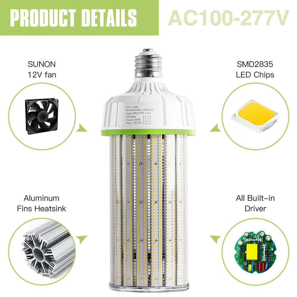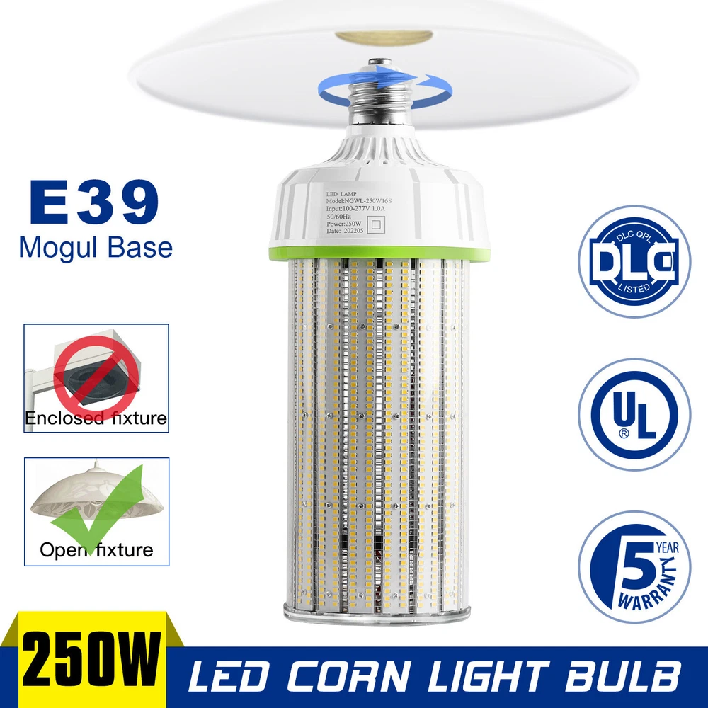 SAFE & SECURE SHOPPING 100% SATISFACTION GUARANTEED FAST SHIPPING 250W LED Corn Bulb Industrial Commercial Open Fixture Light 5000K - 33750 Lumens Product Description This bulb is suitable for OPEN FIXTURE ONLY. Check size first before ordering. WIDELY APPLICATION & ENERGY EFFICIENT --- Adopted SMD2835 LED chips delivery the most comfortable 5000K Daylight for you. 360 degree beam angle, you can save 80% electricity bill by replacing 800W~1200W CFL/MH/HPS and other E39/E40 bulbs. It's perfect for garage, driveway, warehouse, barn, patio, courtyard, garden, street, office, school, hospital, shopping mail, supermarket, station, restaurant, hotel, workshop etc, anywhere need bright light. LONG LIFESPAN --- Aluminum fin heat sink body with two inside fans active cooling solution gives LED corn light 50000 hours long lifetime (23 years, based on 6 hrs/day). Unique full sealed lamp base and transparent PC cover protect LEDs from dust, insect and humidity working environment and make the LED more stable during working. EASY INSTALLATION --- Connect directly into E39 base - just screw in Corn bulb is equipped with internal driver for single component installation.(Don't need ballast, just direct wire them). 5 YEAR WARRANTY --- We offer 5 years warranty for all of it’s products. We pay most attention to the product safety and reliability standards, UL cUL safety certification approved. DLC certified for rebate helps you save money. WE ARE PROFFSSIONAL - We are professional LED light Manufacturer with 3,000 square meters production area. We produce LED lights since 2010 with fully quality certification assured. All LED lights will aging test and packed well before ship, any problems happened within 5 years please feel free to contact us for support. Technical Characteristic: LED Type: 2835 SMD LEDS Luminous Flux(lm): 33,750 Lumens Color temperature: 5000K CRI: >80 Input Power: 250W Beam Angle: 360 degree Input Voltage: AC100-277V 50/60Hz PF: >90% Replacement:1000W Metal Halide / HPS/Mercury Vapor Warranty:5 Years Certificated: UL & DLC Listed NOTICE: 1.The LED Corn bulb is wide input voltage(AC100V-277V). 2.Please turn off power before install or change assembly parts. 3.Make sure to remove ballast or starter before install the lamps. 4.The input voltage and lamps should be matched, after connecting the power line, please make sure the wiring section is insulated. Package Included: 1 x 250W LED corn light (E39 Large Mogul Base) Copyright © 2022 Tongtool