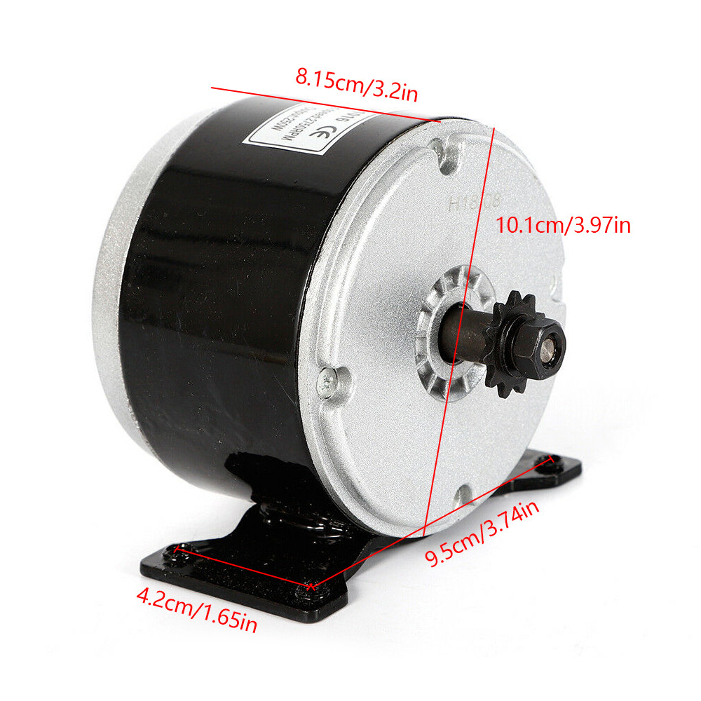 Description This brush permanent magnet motor has a pure copper coil with low resistance and high efficiency, ensuring its good performance. The speed of this motor is about 2750rpm, which can make your ride easier. This high-quality, practical motor will be the ideal choice for you! Details Pure Copper Coils: Pure copper coils with low resistance and high conductivity generate very little heat during use and do not easily burn out the motor, thus extending its life. Painting Process: The painting process on the shell makes it have good rust and corrosion resistance, and better adaptability to the various installation environment. Specifications Material: Iron Process: Painting Rate Voltage: 24V DC Power: 250 W Rate Current: 13.5A Rate Speed: 2750 RPM Type of Motor: Permanent Magnet Brush DC Motor Sprocket: 25H 11T Chain: 25H 6.35 Pitch Color: Black Packing Size: 16*16*15cm/6.29*6.29*5.9in Product Size(D*W): 10.1*8.15cm/3.97*3.2in Base Size: 4.2*9.5cm/1.65*3.74in Gross Weight: 2kg/4.4lbs Package Included 1 x 250W Permanent Magnet Electric Motor Notes Please note that it is normal for the motor to heat up slightly during operation. Please check the connector type, motor size and specification. Please allow the slight color difference caused by the shooting light and 1-3cm error due to manual measurement, and make sure you do not mind before you order. Reversible Design: By reversing the positive and negative poles of the motor, the motor can rotate counterclockwise to meet your various needs. Strong and Durable: The high-quality iron shell is solid, wear-resistant and impact-resistant, effectively protecting the internal components and extending the practical life. Easy to Install: The pre-set mounting holes allow you to easily fix it to the bracket with screws, saving time and effort. Low Noise: With a pure copper coil and precision bearings, it releases less noise during operation, giving you a quieter environment. Exquisitely Compact: Measuring just 6.7*4.3*3 inches, this compact motor takes up little space when mounted and is easy to carry. Smooth Running: The permanent magnet brush DC motor responds very quickly to voltage changes and maintains a smooth start and run. As a result, it runs smoothly even on irregular roads. High Efficiency: With a maximum speed of 2570 rpm, this 250 W motor allows for quick and efficient runs, providing you with a better riding experience. Customer Service: We aim to provide quality products and services. If you have any problems, please feel free to contact us. We will reply and solve the problem for you as soon as possible.