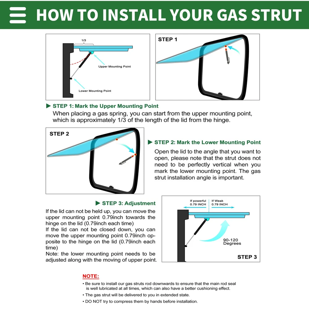 Document Feature:Easy to install the gas springs with simple hand tools in just few minutes.With easy fittings to any surface, just attach and lift, your gas spring lifts and hold the weight objects.The gas springs are powerful, can support small,medium to heavy object. Easy to lift and support, smooth use, bringing convenience to your work.This gas struts are universal, which fits for RV window, cabinet door cover, storage box cover, boat hatch cover, car hood and trunk, pickup truck tonneau cover, tailer cover, bus luggage door, motorcycle seat cover and so on.Specifiction:Extended Length: 250mm/9.84"Compressed Length: 160mm/6.30"Force: 112lb/500N/50kgColor: RedMaterial: Carbon SteelNote:If the temperature is lower than minus 20 degrees, the oil density of the gas spring turns high (frozen) and it is difficult to press down.Please allow 0.5mm differences due to manual measurement.Package Included:2 Pcs Gas Struts Shop Category New Arrival Hot Item 250mm/9.84" Gas Struts 500N Gas Springs Red Carbon Steel 2 Pcs Feature: Easy to install the gas springs with simple hand tools in just few minutes. With easy fittings to any surface, just attach and lift, your gas spring lifts and hold the weight objects. The gas springs are powerful, can support small,medium to heavy object. Easy to lift and support, smooth use, bringing convenience to your work. This gas struts are universal, which fits for RV window, cabinet door cover, storage box cover, boat hatch cover, car hood and trunk, pickup truck tonneau cover, tailer cover, bus luggage door, motorcycle seat cover and so on. Specifiction: Extended Length: 250mm/9.84" Compressed Length: 160mm/6.30" Force: 112lb/500N/50kg Color: Red Material: Carbon Steel Note: If the temperature is lower than minus 20 degrees, the oil density of the gas spring turns high (frozen) and it is difficult to press down. Please allow 0.5mm differences due to manual measurement. Package Included: 2 Pcs Gas Struts Item Specifics Brand X AUTOHAUX Features Waterproof/Durable Material Carbon Steel Placement on Vehicle front Type Gas Struts Product Name Gas Struts Net Weight 385g Shell Color Red Dimension 250mm/9.84" Package Content 2 Pcs Gas Struts Note This is not oem product,accessory only. Universal Fitment Yes You Should Know If you have any questions, please feel free to contact our customer service. Our response will be faster than eBay! Our Handling Time: within 24 hours on weekdays eBay Handling Time: 72 hours About Us Shipping Feedback Payment Contact Us Angstrom Autohaus is based in Hong Kong, our group comprises factories in Asia that manufacture OEM and aftermarket automotive parts and accessories. We believe in FACTORY DIRECT purchases. Our mission is to deliver Lower Prices and Better Quality to consumers and distributors wherever, whenever. We operate from a distribution center in Hong Kong, where we perform sourcing, quality control and fulfillment. We strive to ensure that our products are reliable, updated and that our transactions are smooth and speedy. We are positioned to bring you the latest consumer automotive aftermarket parts and accessories globally and round the clock. We are proud to have served over 500,000 ebay buyers worldwide. International Buyers - Please Note: Import duties, taxes and charges are not included in the item price or shipping charges. Buyers are responsible for these charges. Please check with your country's customs office to determine what these additional costs will be prior to bidding/buying. Note that delivery times may vary, particularly during peak periods or inclimate weather conditions. All items will be dispatched from our warehouse in China or Hong Kong directly. Due to Custom restrictions, we do not ship lighters to US We cannot ship on weekends and we do not offer Saturday, Sunday or holiday delivery. All our items will be shipped to buyer's PayPal address, please confirm your address on PayPal before you bid. We left positive feedback for you after receiving payment. Your feedback is very important for us, positive feedback and 5 Score DSR is highly appreciated. Please let us know before leaving any negative feedback or 1 point, 2 point low DSR or open any disputes on Paypal and Ebay, please give us the opportunity to resolve any problems and we will try our best to satisfy your needs. If any question, please feel free to contact us via 'Ask seller a question' ,We try our best to reply to your emails as soon as possible, due to high volume of daily incoming emails and time zone difference, we may not be able to reply your emails immediately.Please allow 1-2 business days for us to response. Payment Methods: We accept eBay payment. We appreciate prompt payment and look forward to your business in the future. Unpaid item will be filed without receiving payment in 7 days from listing ended. Contact Us Please email us to resolve any problem before you leave any feedback to us. We will reply you via email ASAP, if no response for you within 48 hours, please check the spam / junk folder in your mail box. Descripción Política 250mm/9.84" Gas Struts 500N Gas Springs Red Carbon Steel 2 Pcs Feature: Easy to install the gas springs with simple hand tools in just few minutes. With easy fittings to any surface, just attach and lift, your gas spring lifts and hold the weight objects. The gas springs are powerful, can support small,medium to heavy object. Easy to lift and support, smooth use, bringing convenience to your work. This gas struts are universal, which fits for RV window, cabinet door cover, storage box cover, boat hatch cover, car hood and trunk, pickup truck tonneau cover, tailer cover, bus luggage door, motorcycle seat cover and so on. Specifiction: Extended Length: 250mm/9.84" Compressed Length: 160mm/6.30" Force: 112lb/500N/50kg Color: Red Material: Carbon Steel Note: If the temperature is lower than minus 20 degrees, the oil density of the gas spring turns high (frozen) and it is difficult to press down. Please al