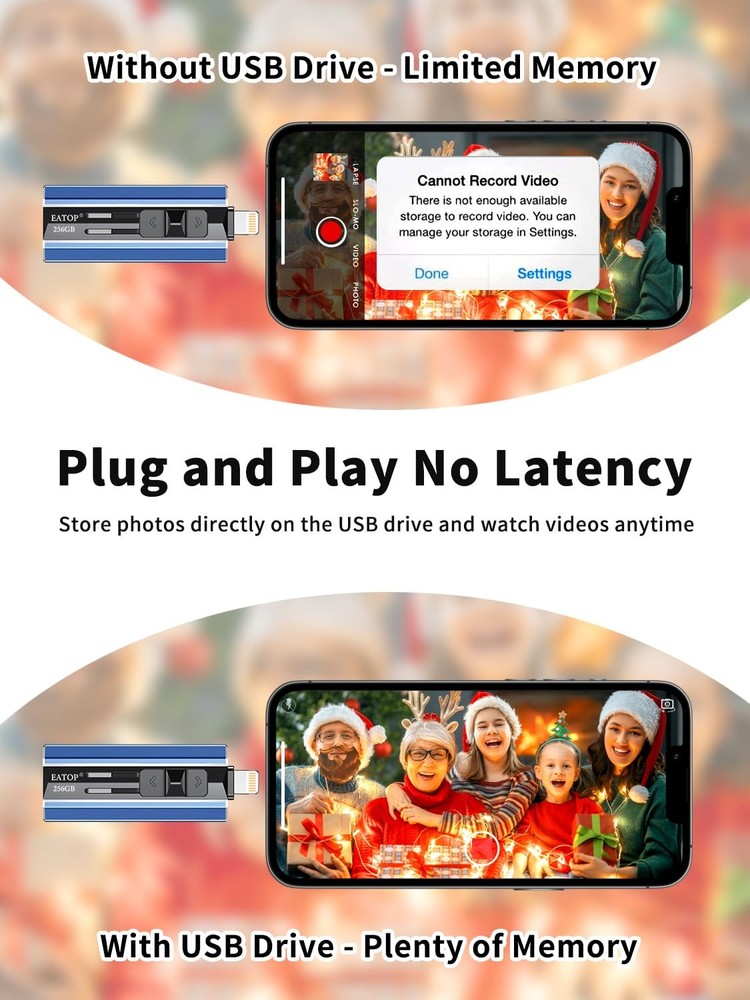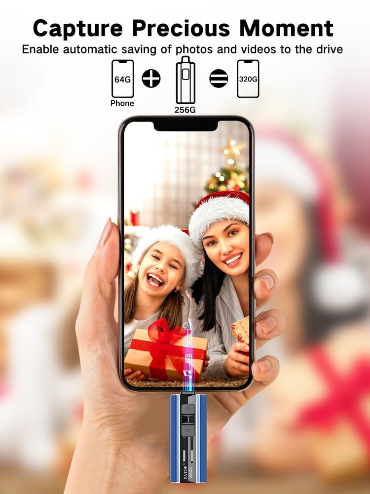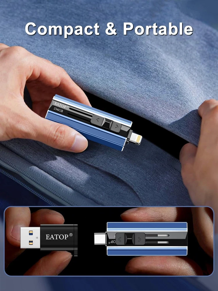Do you want to make your Phone more convenient? Are you tired of your Phone running out of memory? Do you want to keep enough Phone memory during your trip? Plug and Play, No Application Required! Never lose important documents, videos, photos again thanks to large and reliable Phone flash drives. Free up iPhone and iPad Memory Space Immediately If your iPhone or iPad has almost used up all the memory space, this iPhone USB storage flash drive can help alleviate 256GB of storage space. Whether you like to shoot short videos or take selfies, our iPhone memory stick are perfect for you. Quickly Backup Without Using iTunes or Cloud You can easily backup and manage files at any time. No need of iTunes or Cloud, manage files, pictures and videos through the mobile app to quickly backup to iPhone flash drive, save the storage space of the mobile phone, and at the same time, operations such as forwarding files on the USB drive can be performed. Plug and Play Share your photos, videos, songs and other files between iPhone picture stick easily. You don't have to pay extra for additional storage, just insert iPhone external storage and enjoy the extra space of your flash drive. High Transfer Speed Smart and upgraded chip with high efficiency and stability. read speed up to 30MB/s and write speed up to 15MB/s. The upgraded chip provides you with more efficient storage experience. How to Transfer for iPhone iPad Requires iOS 13 and higher: Simply insert the flash drive into your iPhone iPad, then go to the "Files" app to find "Untitled" and move files to your iPad or iPhone as needed. How to Transfer for Android Android phones need to support OTG, and flash drives can be found in the “File Manager” of most Android devices. 【Plug and Play, No Application Required, Instantly Increases iPhone and iPad Memory Space】If you almost used up all space on your iPhone or iPad, this photo stick for iPhone helps to expand your memory at full storage with 256GB. And usb memory stick for photos is also a great partner for traveling photographers editing on iPad. Using this memory device for your iPhone, iPad or Computers, no worries with the iPhone storage anymore! 【Multi-Port USB Drive】The 3 IN 1 phone photo stick with USB-C Port/ USB-L Port/ USB Port (Independent interface), which is more convenient for data transfer between different devices, so as to get rid of the data cable and iTunes and iCloud, let you switch easily storage space. The Phone thumb drive is designed for use with a wide range of devices, Compatibility iPhone 16/15/14/13/12/11/8/7/6S/SE/XR/XS/XS Max/X Series/iPad Air Series/iPad Pro Series. Also support Android smartphones/Computers and other devices with USB-C Ports. (Tip: For iPhone system version requires iOS 13 or higher, For Android smartphones need to open OTG function) 【Watch Movies, Photos and Play Music Directly From Phone Flash Drive】Store your favorite videos, audios and music on your iPhone's Photo Stick, then seamlessly plug and play on your iPhone or iPad anytime, anywhere. No more need for Internet or WiFi. This iPhone storage device plays videos in many different formats.Pictures stored on the Phone storage device also support different formats. Great way to store all your pictures and videos on an phone external storage device. 【High Transfer Speed】Transfer photos, videos, and files in seconds with our USB stick. With a write speed of up to 15 MB/s and a read speed of up to 30 MB/s, our flash drive for iphone have higher performance than conventional usb storage flash drive. Save time and get more done with iphone photo storage stick. Enjoy the whole relaxing trip with never stuttering or buffering video play on the go. (Tip: No Third-Party Apps Required, Simply insert the flash drive into the iPhone iPad and go to "Files" app) 【How to transfer in iPhone iPad】Requires iOS 13 and higher: Simply insert the flash drive into your iPhone iPad, then go to the "Files" app to find "Untitled" and move files to your iPad or iPhone as needed. 【How to transfer in Android Phones】Android phones need to support OTG, and flash drives can be found in the “File Manager” of most Android devices. 【Kindly Note】1) For Flash Media Devices, 1 megabyte = 1 million bytes; 1 gigabyte = 1 billion bytes. Actual useable capacity may vary. Some of the listed capacity is used for formatting and other functions, and thus is not available for data storage. 2) Up to 30MB/s read speed, write speed is lower. Based on internal testing; performance may be lower depending on the host devices and user’s settings and configurations. 【Kindly Note】The phone case may prevent the proper connection between a phone and a usb flash drive, which could result in the phone being unable to recognize the usb flash drive. In this situation, please do not conclude that the usb flash drive cannot be used, remove the phone case and try again. 【Reliable After-Sales Service】Experience the convenience of high-quality USB memory stick and enjoy our premium customer service at the same time. For the phone flash drive, if you have any questions, we are willing to provide help.