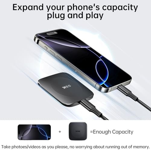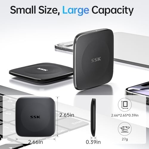 External SSD Drive with 2 in 1 USB C Cable: Equipped with 2 in 1 USB-C and USB-A Cable ,SSK USB SSD solid state drive allows you transfer data between smartphone/tablet and computer conveniently. Instantly release space or quickly move pictures or movies on your OTG enabled Android Type C phone, tablet, Windows computer,smart TV and more High Speed Transfer: Portable SSD drive up to 550mb/s read speed and 500mb/s write speed, which is 10 times faster than traditional USB 2.0 drive and memory stick.Let you move high-resolution photos, videos and large-capacity files fast. Master SSD external drive health with S.M.A.R.T. monitoring. TRIM technology ensures consistent write speeds and extends the longevity of the portable hard drive Plug and Play: SSK ssd external hard drive supports plug and play, without any software installation.USB solid state external hard drive can expand the capacity of phones and computer which help you get enough capacity.It is convenient for everyone to use the mobile phone to directly read the SSD thumb drive for file sharing,data transmission, and video playback when working or studying Portable&Light weight: You can take this usb ssd external drive with you wherever you go which make your life easier.SSK external solid state drives weighs only 27g and measures 2.66*2.65*0.39 inches. Advanced business portable USB SSD drive can record your life and work at any time SSD External With LED Indicator: The LED indicator blinks during data transmission to monitor the hard disk status. This simple and effective feature ensures that you don't unplug your external solid state hard drive prematurely during file transfers, avoiding data loss Universal Compatibility: High speed external memory storage compatible with computer equipment, smart phones, iPhone 15, iPad, xBOX, Laptops, Macbook and more.Portable hard drive works with most systems such as Windows、macOS、Linux、Android、iPadOS/Android(Incompatible with lightning port)