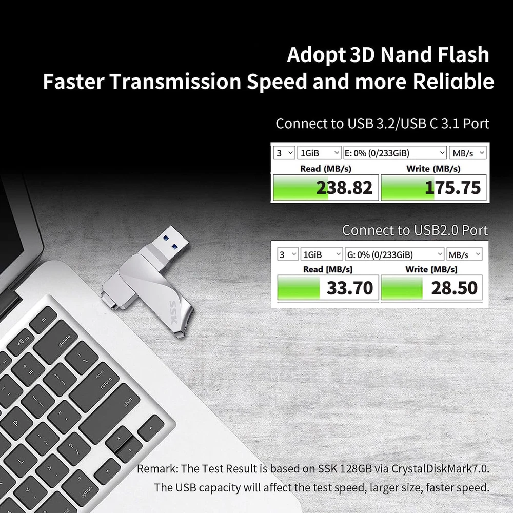 USB C and USB A flash drive: Seamlessly move content between 2-in-1 type c flash drive with usb c and usb a connectors. The usb c thumb drive allows you transfer data between smartphone/tablet and computer more conveniently. Release space on your USB Type-C device Faster Transfer Speed: Dual USB 3.2 Photo Stick read speed up to 200MB/s, it is 3X faster than normal USB3.0 external storage sticks. The dual connectors photostick mobile drive for phone USB external storage data allows you transfer files and videos between smartphone/tablet and computer more conveniently. Preferred usb thumb drive for Android phones allows quickly move pictures or videos on all USB Type-C device Sturdy and Reliable: All-metal casing is made of premium zinc alloy, which makes the usb c memory stick extremely sturdy and reliable. USB C memory stick allow for the fast transfer and storage of files. The metal housing provides a more shockproof and heat dissipation to better protect important files 360°Rotating Design: The usbc flash drive with the innovative 360° swivel design to protect connectors, and 90 °stuck point design avoids the drive rotates randomly. Convenient keyring hole design, you can hang the usb memory stick on a key chain Wide Compatibility: The usb c pendrive is compatible with computers, laptops, cars audio system, smart TVs, OTG enabled Android Type C phone, tablet. Tips: The Computer 1G=1024M, USB Flash Drive 1G=1000M, so the USB Flash Drive's Capacity Displayed on the Computer is about 90% of the Actual Identification. 256GB≈232GB
