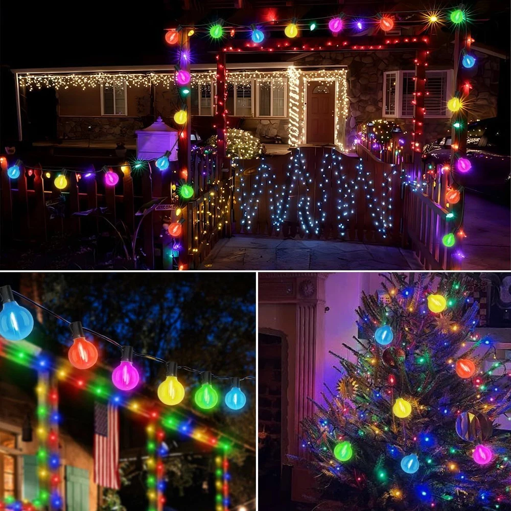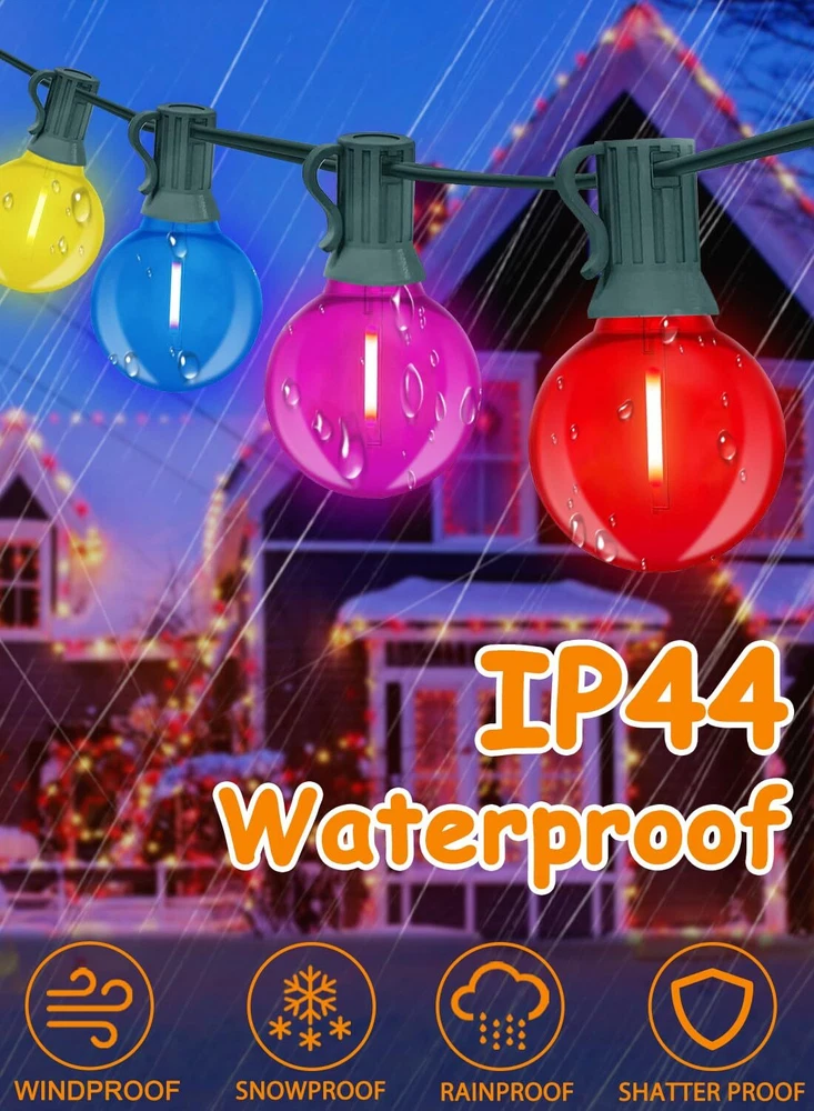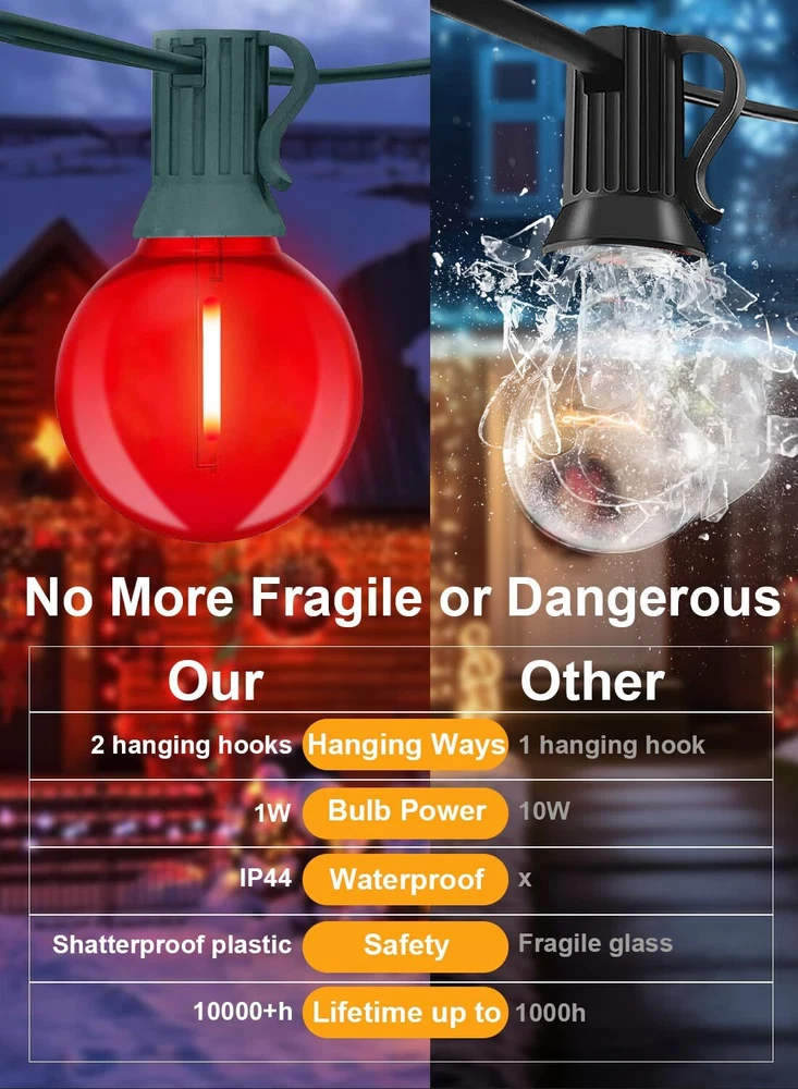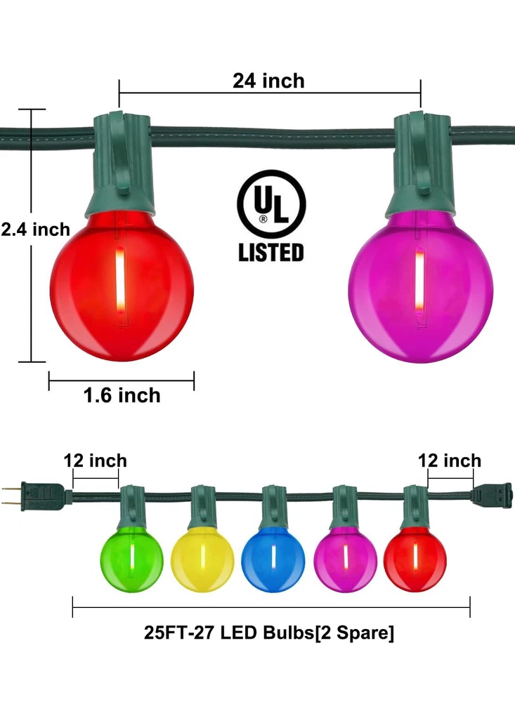 Energy-Efficient LED Outdoor String Lights: Our 25-foot G40 multicolor globe string lights with 25 LED bulbs offer 90% more energy efficiency than traditional incandescent bulbs, reducing your electricity bills and maintenance costs Durable and Weather-Resistant: These G40 LED bulbs are waterproof and shatterproof, making them perfect for outdoor use in any weather, from sunny days to rainy nights End-to-End Connectable: Our outdoor patio string lights can connect up to 28 strands, with a 12-inch bulb spacing and a 6-inch lead with male plug and female connector, ensuring flexible and extended lighting coverage Dimmable LED String Lights: Compatible with dimmers, these vintage bistro string lights provide the flexibility to adjust the brightness according to your desired ambiance, suitable for gardens, yards, decks, and more UL Certified for Safety: Our G40 outdoor LED string lights are UL588 certified, ensuring they meet the highest safety standards, with a built-in spare fuse for easy replacement Easy to Install: Equipped with a clip, these LED multicolor globe string lights can be quickly and easily installed on trees, backyards, decks, bistros, cafes, pergolas, and more, perfect for various celebrations and occasions