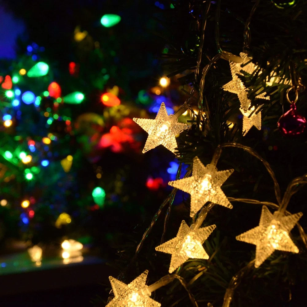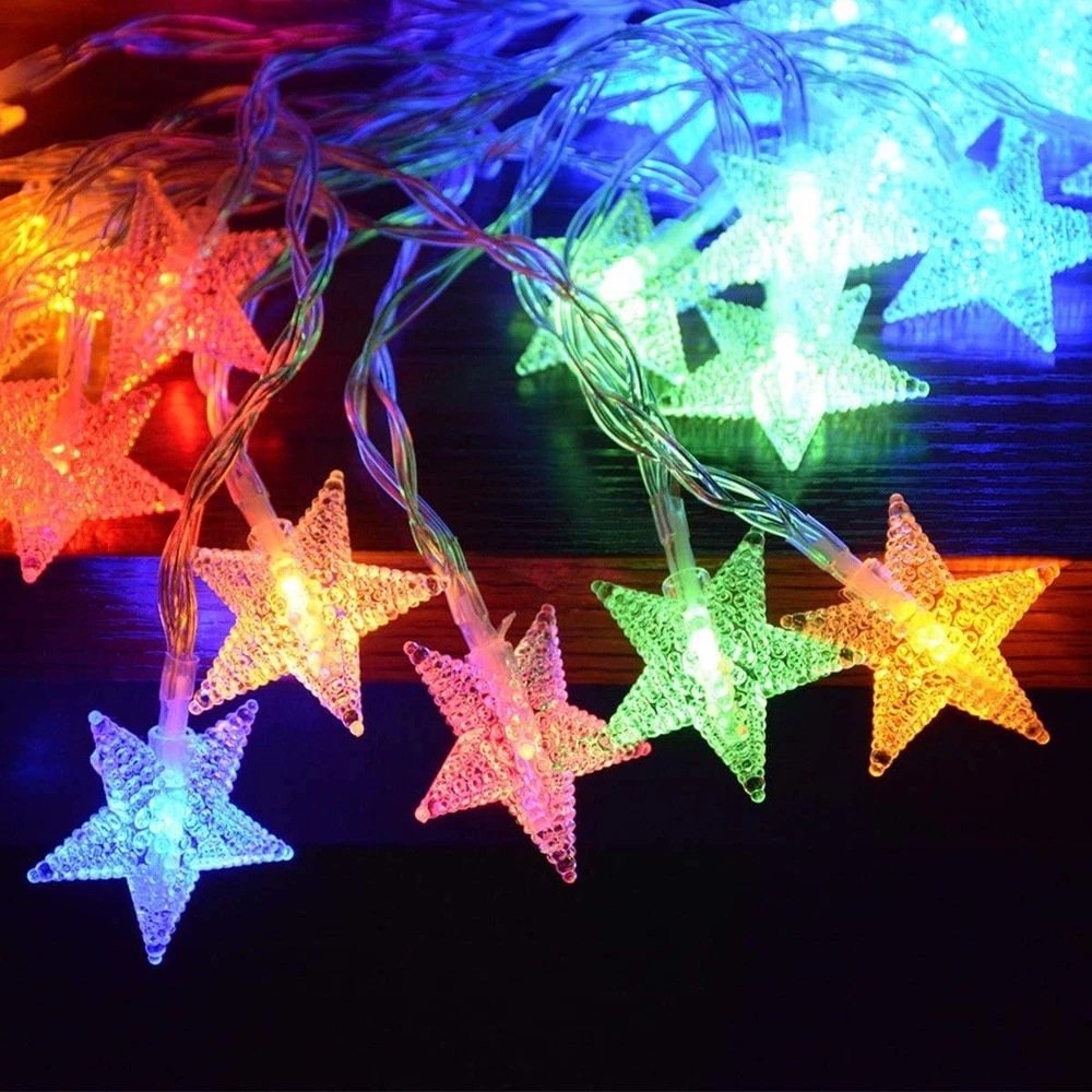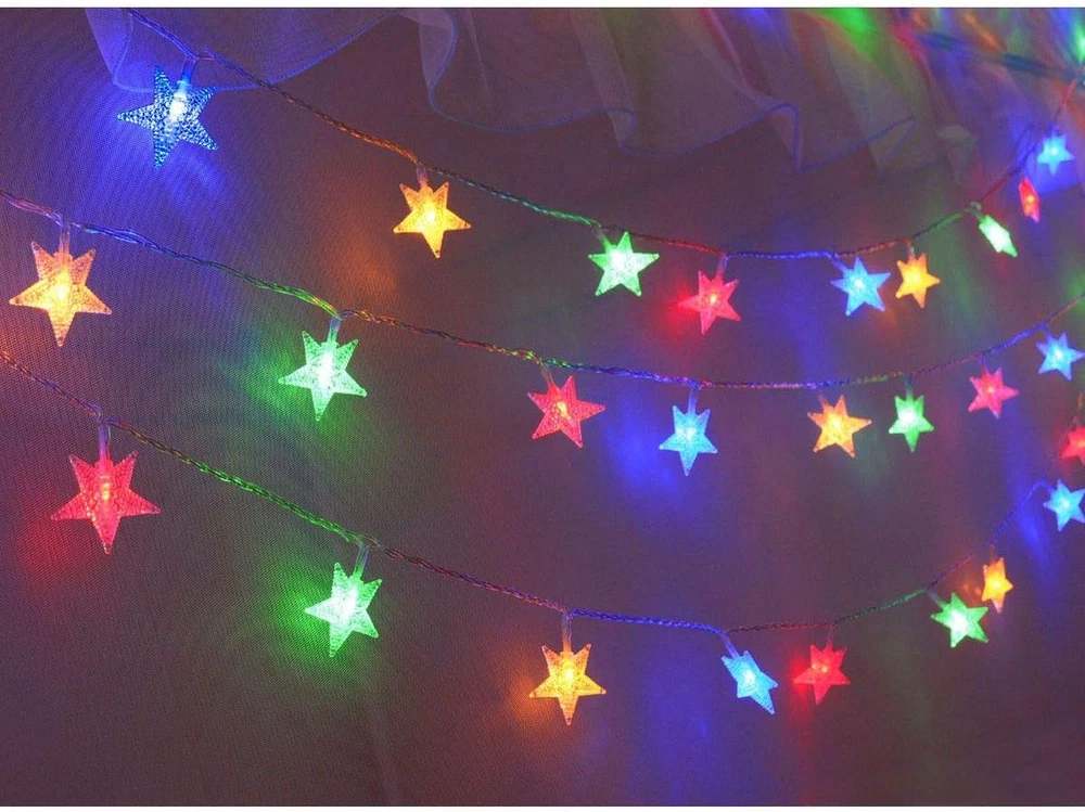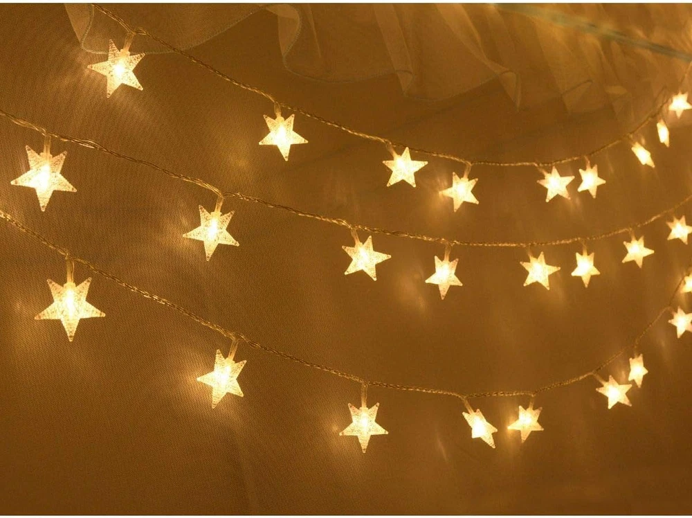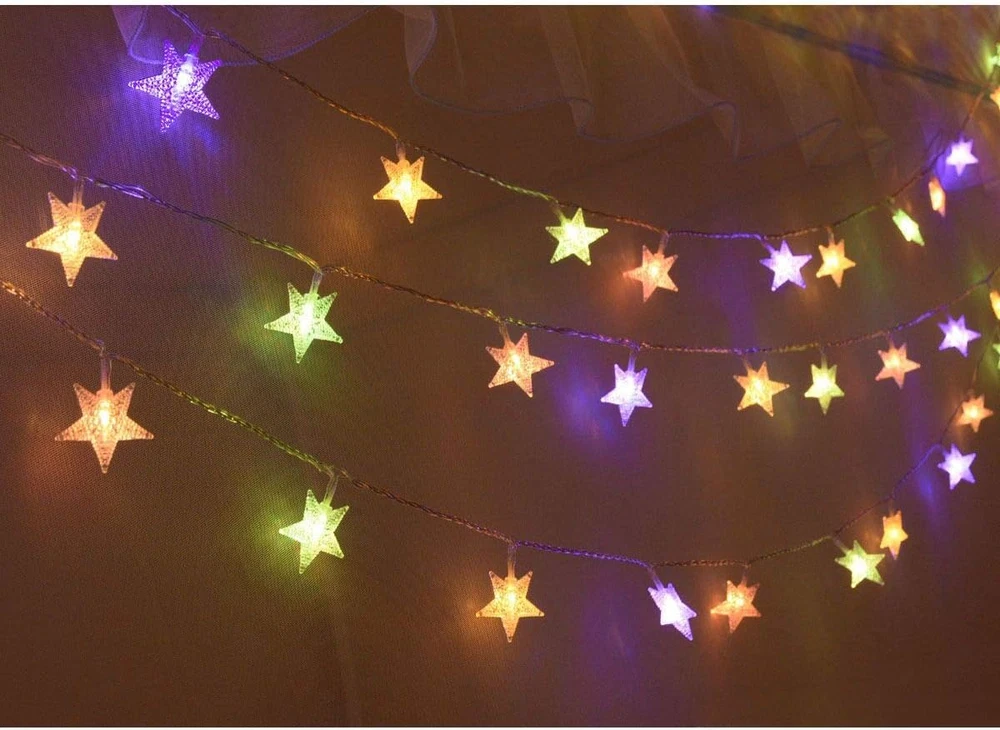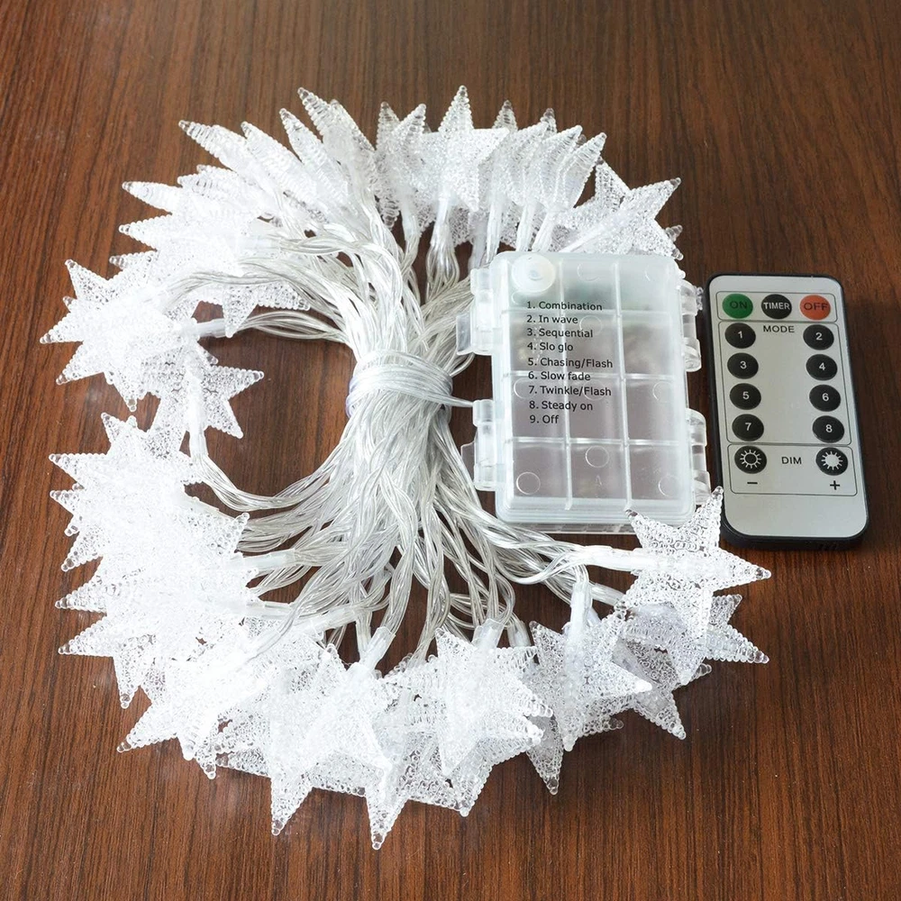 Star String Lights for Bedroom, 25ft white wire, 50 lighted stars, vivid color changing, warm white and multicolor lighting color available, remote controlled, easy to create cozy or cheerful atmosphere. Battery Operated Fairy Lights: Powered by 3 x AA Batteries(Not included), easy to operated, portable for outdoor camping tent, patio awning, ramadan decorations for home. Remote Controlled: Select your favourite lighting color and modes and brightness with handy remote, have fun! Timing program (6 hours on, 18 hours off per day) provides a set-and-forget operation string lights for bedroom, Great for Christmas tree, Xmas garland, Thanksgiving Wreaths decorations,New Year, kids play tent, princess play house,canopy for girls bed, living room decor, party or other celebration occasions Specifications: Brand: Homeleo Wire material: Pure Copper Cable Color: Transparent Light Color: Multicolored changing Light Mode: 8 modes Total length : 7.85 Meters/25.7 feet Lead wire length : 48 cm/19 Inch Star Icon dia: 1.6 Inch LED number: 50 pcs Space between LEDs : 15 cm/ 5.9 inch Powered by 3x AA batteries (NOT INCLUDED) Light Effect: 1. Combination 2.In wave 3.Sequential 4.Slow Glow 5.Warm White 6.RGB+Yellow 7.Solw Color Changing 8.Purple+Light Green+Orange Timer Program: Once selected, the lights will turn on in the pre-programmed timing sequence of 6 hours on, 18 hours off over each 24 hour period. Timing sequence will continue until switched off or battery power is depleted. Package include: 1 x 50 LED Christmas twinkle little star lights string 1 x Remote Control