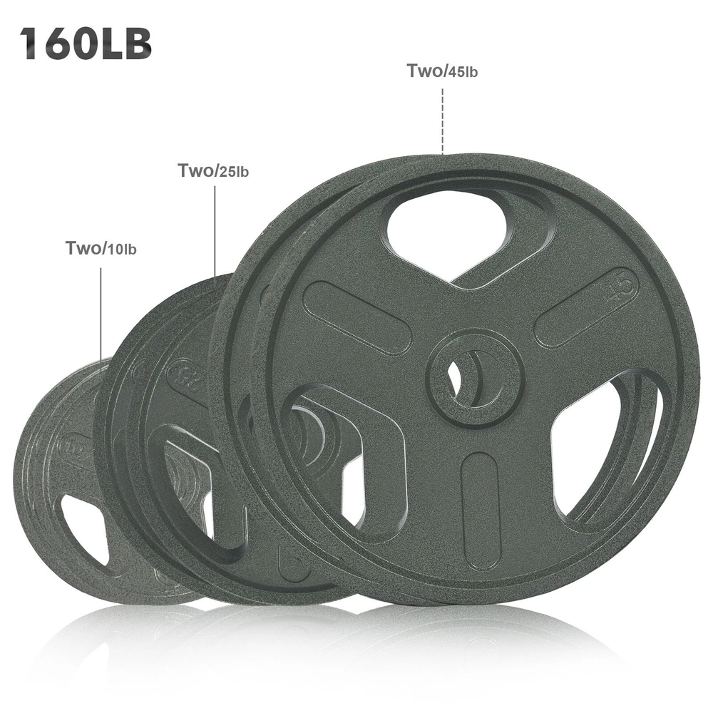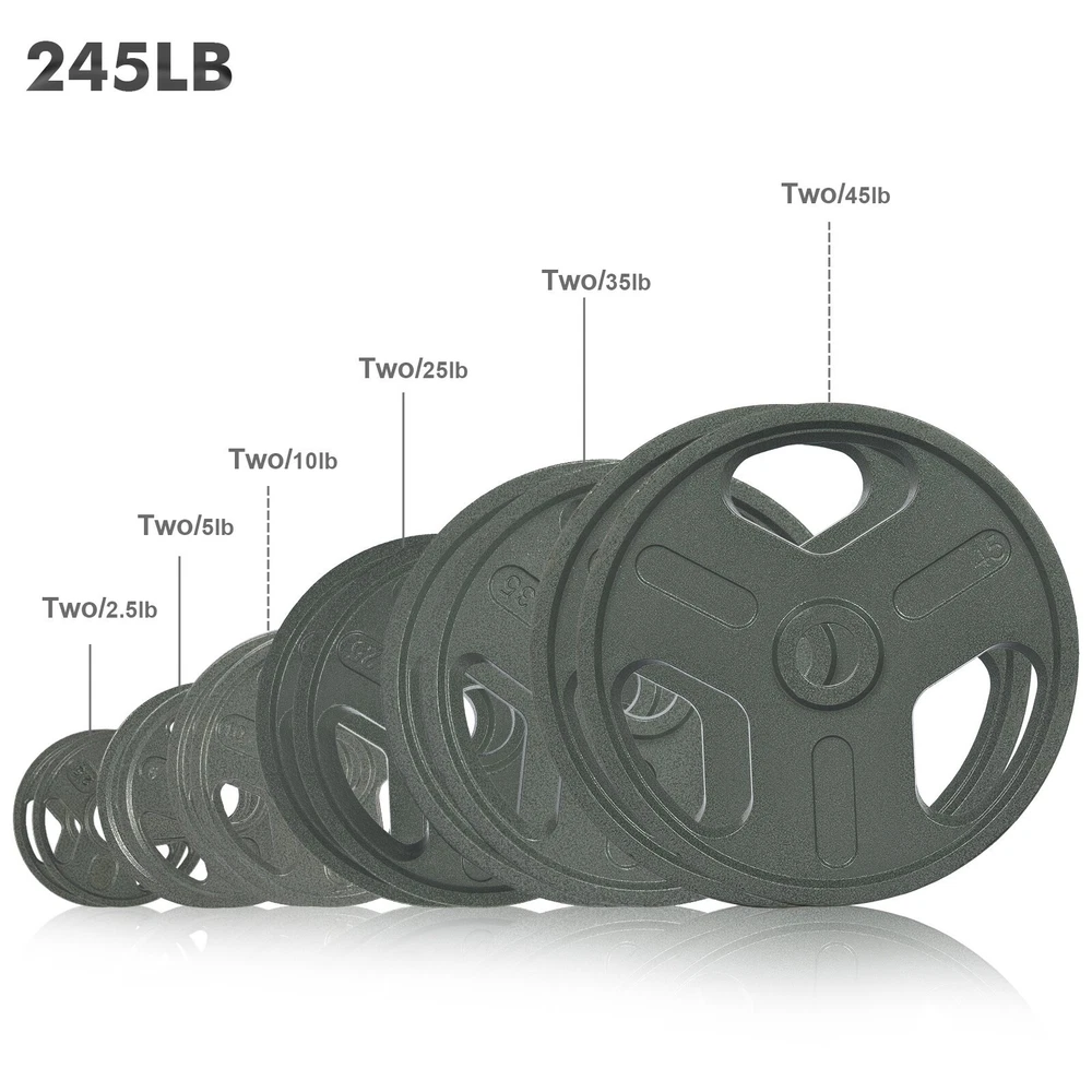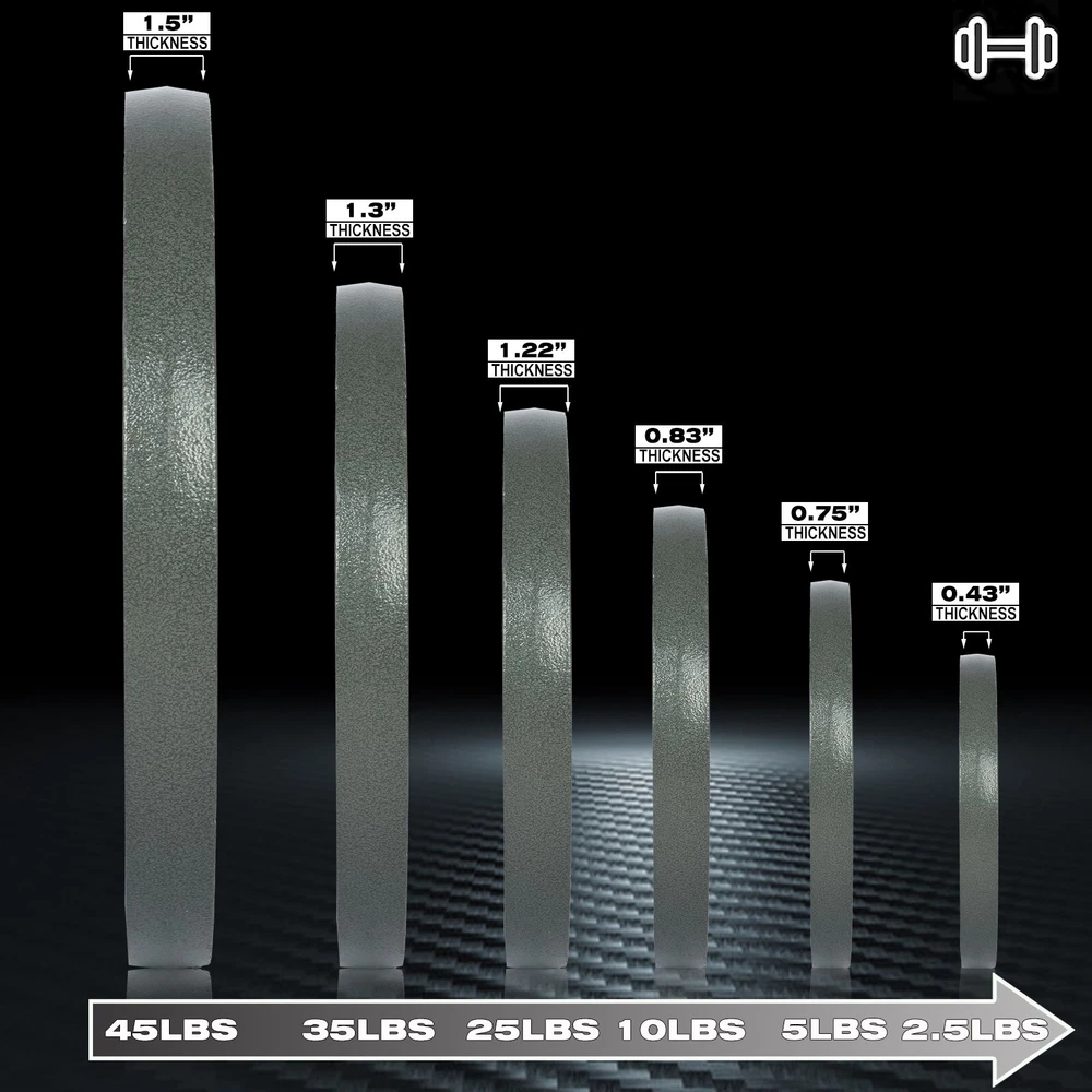 product description: 【Standard Bars】Suitable for all O lympic barbells with 2 inch sleeves. Each board has an IWF standard, and its diameter and thickness vary by weight (thinner width than most comparable boards on the market, allowing more weight to be L OADED on the rod.). 【Training Essentials】 A good bumper set is the core of modern training. Perform O lympic lifts, squats, and deadlifts safely and confidently with our hardcore technique. 【Natural Material】100% high density CA/ST iron material, durable, low elasticity, can withstand repeated drops. p rotect any type of floor and your bar. 【Rigid Design】Professionally designed stainless steel "hook" inserts stay firmly in place and balance. 【Weight Optional】】The bumper plate is available in various weights: 2.5lb/5lb/10lb/25lb/35lb/45lb. Suitable for strength training, weightlifting, etc. Product Details: Gross weight: Package Size: Products include: bumper weight plate The specifications of this series of dumbbell boards are as follows: 【Single piece size】 【Specification 45LB/20.4kg】: Plate diameter 16in/40.6cm, thickness 1.5in/3.8cm, aperture 2in/5cm; 【Specification 35LB/15.8kg】: Plate diameter 14.5in/36.8cm, thickness 1.3in/3.3cm, aperture 2in/5cm; 【Specification 25LB/11.3kg】: Plate diameter 10.6in/27cm, thickness 1.22in/3.0cm, aperture 2in/5cm; 【Specification 10LB/4.5kg】: Plate diameter 9.6in/24.3cm, thickness 0.83in/2.1cm, aperture 2in/5cm; 【Specification 5LB/2.2kg】: Plate diameter 7.8in/20cm, thickness 0.75in/1.9cm, aperture 2in/5cm; 【Specification 2.5LB/1.1kg】: Plate diameter 6.3in/16cm, thickness 0.43in/1.1cm, aperture 2in/5cm; Note: This is manual measurement, there may be errors, please understand! !