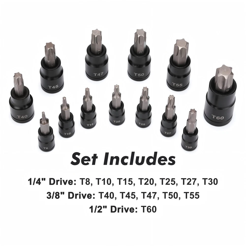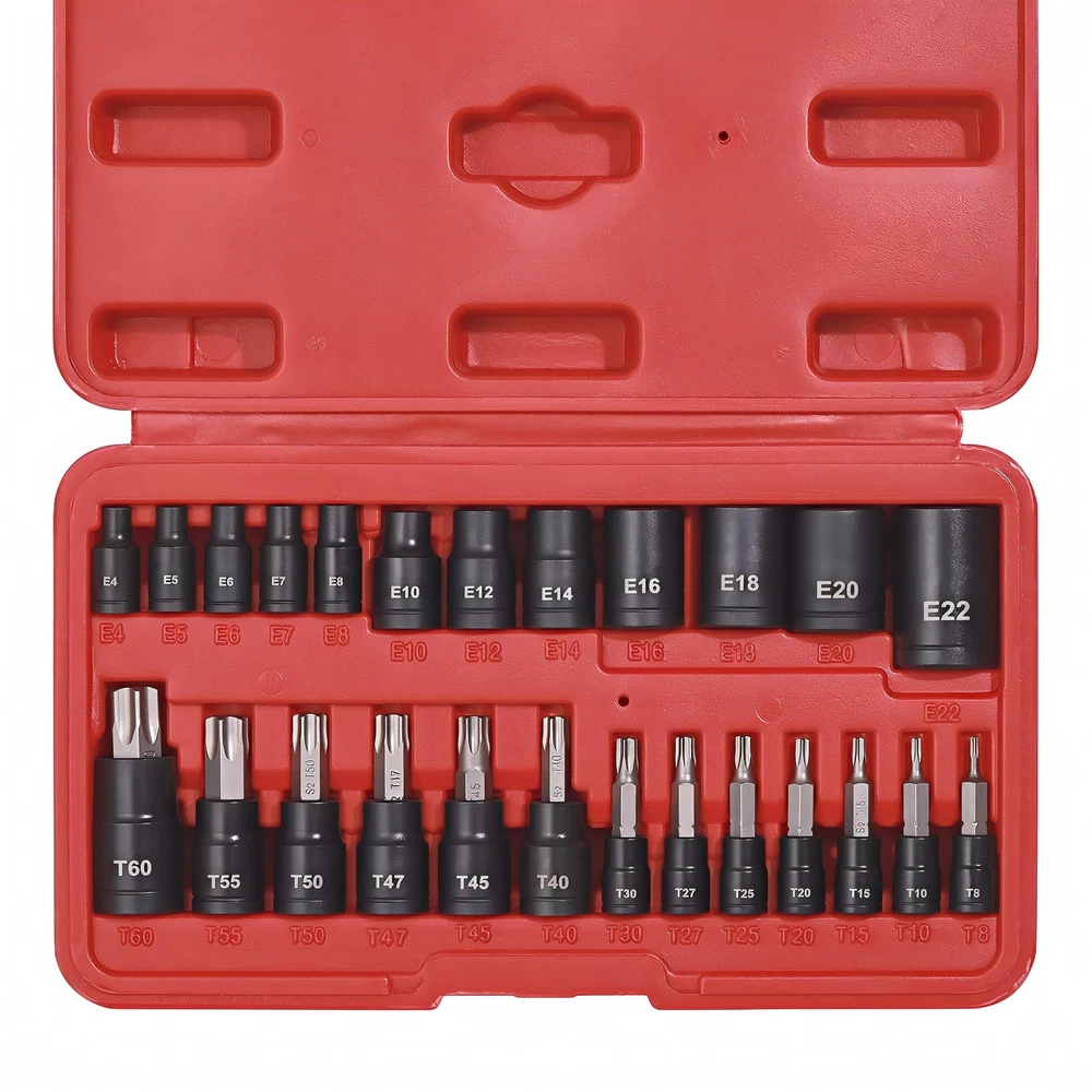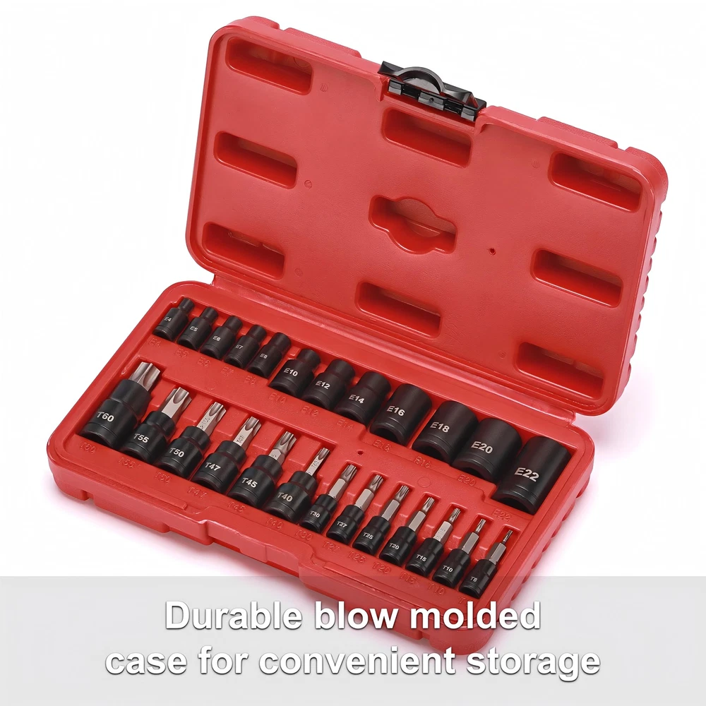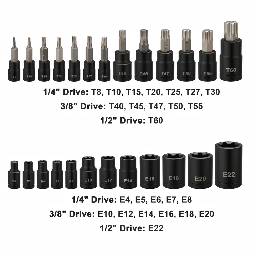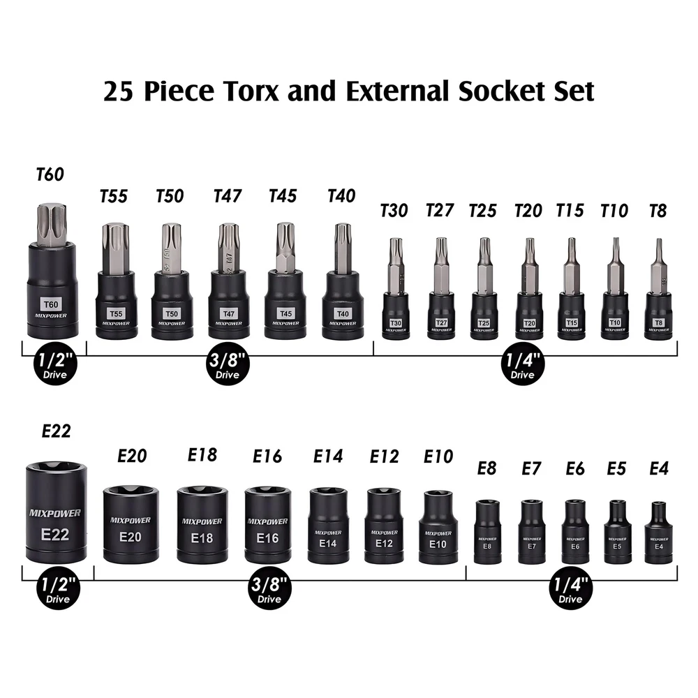 Set Include: 13 Star Socket Bits T: 1/4" Drive: T8, T10, T15, T20, T25, T27, T30; 3/8" Drive: T40, T45, T47, T50, T55; 1/2" Drive: T60 12 Female E-Torx Sockets E: 1/4" Drive: E4, E5, E6, E7, E8; 3/8” Drive: E10, E12, E14, E16, E18, E20 1/2” Drive: E22 25 Piece Torx Bit Socket and Female External Socket Set, 13 Star Socket Bits (T8- T60)& 12 Female E-Torx Sockets (E4-E22) Description The set is made from Heavy-duty Chrome-Vanadium steel alloy (50BV30) and S2 with a corrosion-resistant black phosphate finish, providing the durability for a hard use. The socket is High-contrast laser etched with high-visibility markings and hard stamped with size labels. Quality Heat Treated S2 Alloy Steel Torx Bits Heat Treated CR-V Sockets with Corrosion-resistant black phosphate finish Permanent high visibility laser etched size marking Come with a heavy duty blow molded storage case, easy to carry