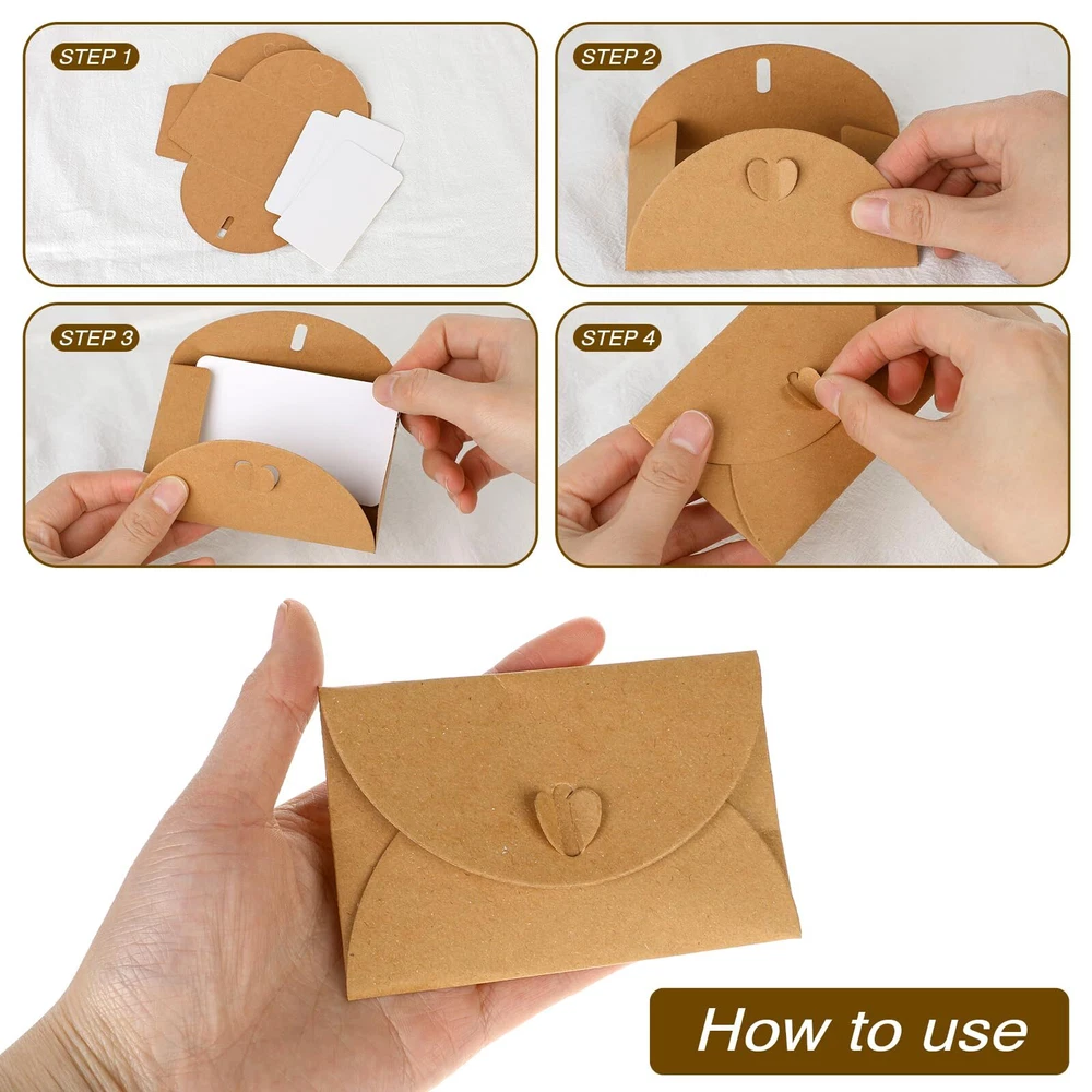 Product Name: gift cards envelopes Style: 25pcs envelope + 25pcs card Material: kraft paper Single product size: envelope folded 10.5*7cm, card 9*5.2cm Packaging: bagged Packing list: 25pcs gift card holders + 25pcs blank cards Mini Blank Cards with Envelopes: Comes with 25 kraft paper gift card envelopes and 25 small note cards. Cute Decorative Envelopes: The gift card holder is designed with a cute heart-shaped closure, allowing the gift card packaging to stay secure while being elegant and beautiful. Mini Size: The folded card envelope measures approximately 10.5*7cm/4.1 x 2.8 inches, and the blank small gift card measures approximately 9*5.2cm/3.5 x 2 inches. Easy to Assemble and DIY: The greeting card mailing envelopes can be assembled without glue, and you can write and doodle freely on the blank tiny envelopes and note cards. Versatile Application: Mini envelopes with blank card are ideal for Christmas cards, wedding cards, party invitations, business cards, thank you cards, greeting cards, birthday cards and more.