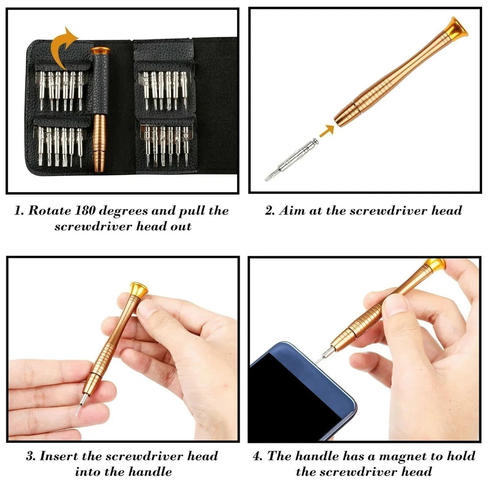 25PCS Precision Screwdriver Set Eyeglass Watch Jewelry Repair Cell Micro Small Welcome ~ 25 in1 Mini Screwdriver Set Hand Tool Repair Kit for Eyeglasses Laptop Watch Specification: Five Star Screwdriver: 0.8 / 1.2 Torx Screwdriver: T2 / T3 / T4 / T5 / T6 / T7 / T8 / T9 / T10 / T15 Color: 25 In1 Triangle Driver: 2.3 Y Screwdriver: 2.0 Phillips Screwdriver: 1.0 / 1.2 / 1.5 / 2.0 / 3.0 Flat Screwdriver: 1.0 / 1.5 / 2.0 / 3.0 Point Screwdriver: 0.8 Total Length (Handle with Bits): 110 Mm Bit Length: 33mm Single Package Size (Folded): 105 X 65 X 20 Mm When It Expands: 200 X 105 Mm Main Highlights: Wallet Packaging, Highlight Quality. Lightweight and Portable Batch Bayonet with Internal Batch Head, Not Easy to Scatter, Unlike the Traditional Plastic Box, Easy to Crush, Scattered. High-precision Screwdriver Head, a High-end Steel (Chrome Vanadium Steel) Through Special Heat Treatment, Hardness Can Reach Hrc52-60. A Full Set of 24 Full Spec Batch Heads Can Be Customized to Work in a Wide Variety of Fields. Suitable for Most Digital Products, Various Types of Computers, Cell Phones, Cameras, Glasses, and Watches. The Handle in the Aviation Alloy Material Manufacturing, Light and Durable, the Tail Adopts the Precision Bearing Design, Flexible and Easy to Use. As a Professional Hardware Tool, It Gives You the Most Powerful Function. Payment Delivery details Terms of sales About us Contact us Payment We accept ebay payment 。 Fees such as import duties, taxes are not included in the item price or shipping costs. These charges are the buyer's responsibility. Delivery details Shipping: 2-9 working days to: USA Terms of sales We maintain high standards of excellence and strive for hundred percent customer satisfaction. Feedback is very important to us. We hope that you contact us immediately before you give neutral or negative feedback, so that we can address your concerns. It is impossible to address issues if we do not know about them! About us Your satis faction is our ultimate goal. We work hard to earn your trust and future business. Our certified technicians have tested each item before shipping. The unit comes with 1 year limited warranty on all manufacturing defects. a) If you receive a defective item, you may return it or ask for a discount. Please contact us within 14 days after you receive the package. b) What you returned must be intact and in its original packaging as re? u. Customer is responsible for shipping costs of the returned item. c) We will cover the cost of shipping back t with the shipping rate indicated in the registration page. We will send you a new unit or refund the full payment you paid. Thank you. Contact us Business Hour Business Hour: Monday To Friday: 8:30 AM to 5:00 PM (Beijing China time) Due to time zones, our reply to your questions may not be immediately. But within above working time, we will reply your email within 24 hours. If it's non-workdays, please kindly be patient and wait till Monday. Please contact us with ebay message. Please feel free to contact us if you have any questions. Monday To Friday: 8:30 AM to 5:00 PM (Beijing China time) Due to time zones, our reply to your questions may not be immediately. But within above working time, we will reply your email within 24 hours. If it's non-workdays, please kindly be patient and wait till Monday. Please contact us with ebay message. Please feel free to contact us if you have any questions. On Feb 4, 2025 at 19:32:27 PST, seller added the following information: